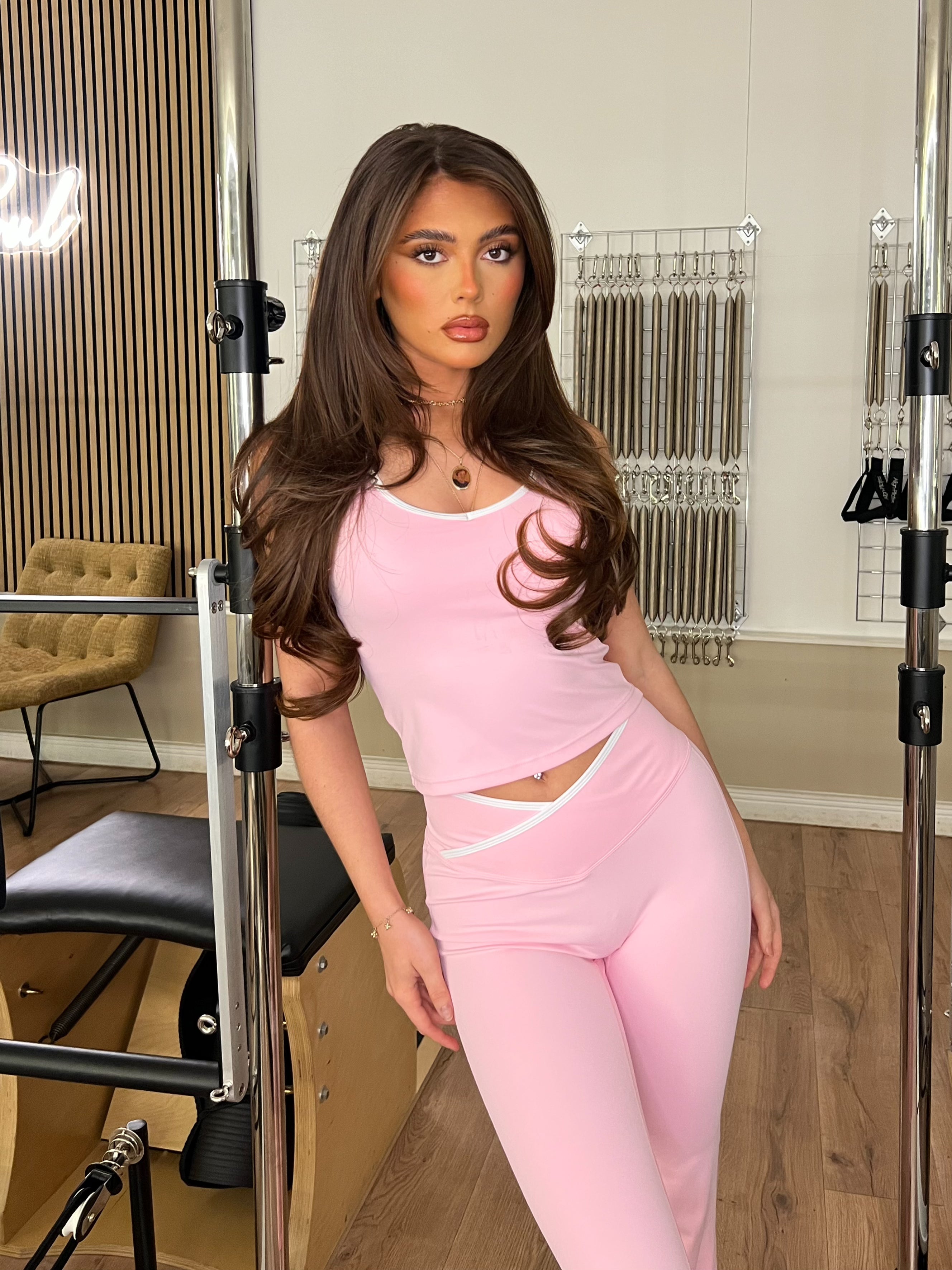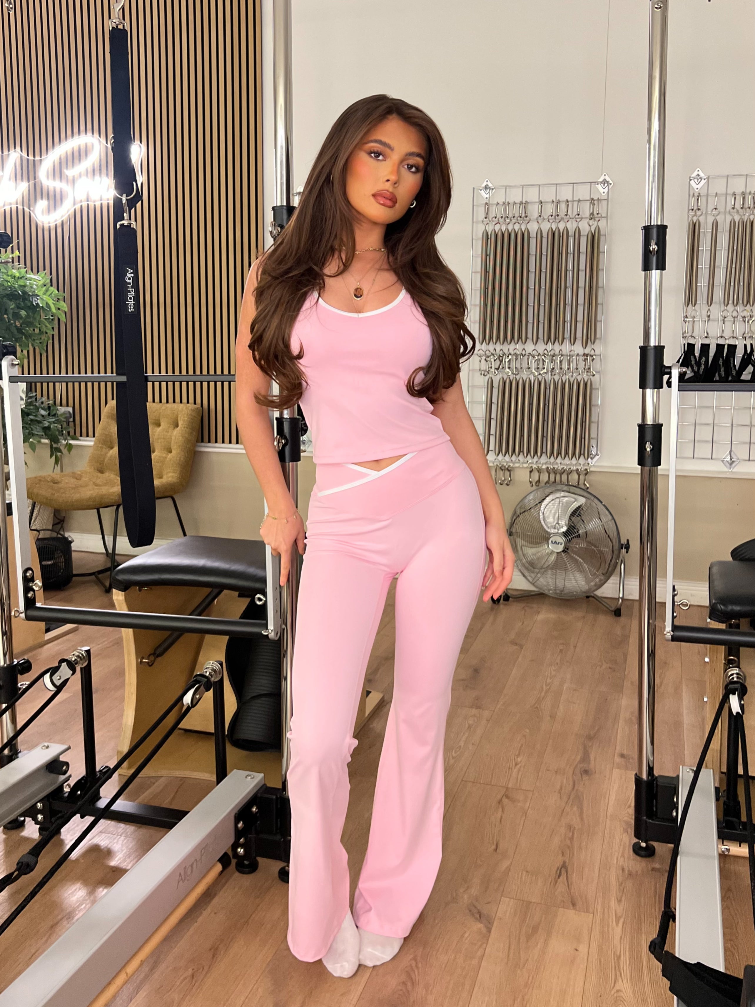 This Piped Edging Vest Top and Boot Cut Trousers set offers a stylish and comfortable ensemble. The sleeveless vest top features piped edging, while the high-waisted boot cut trousers provide a flattering fit. The crossed V waistband adds a touch of unique design to this versatile outfit.