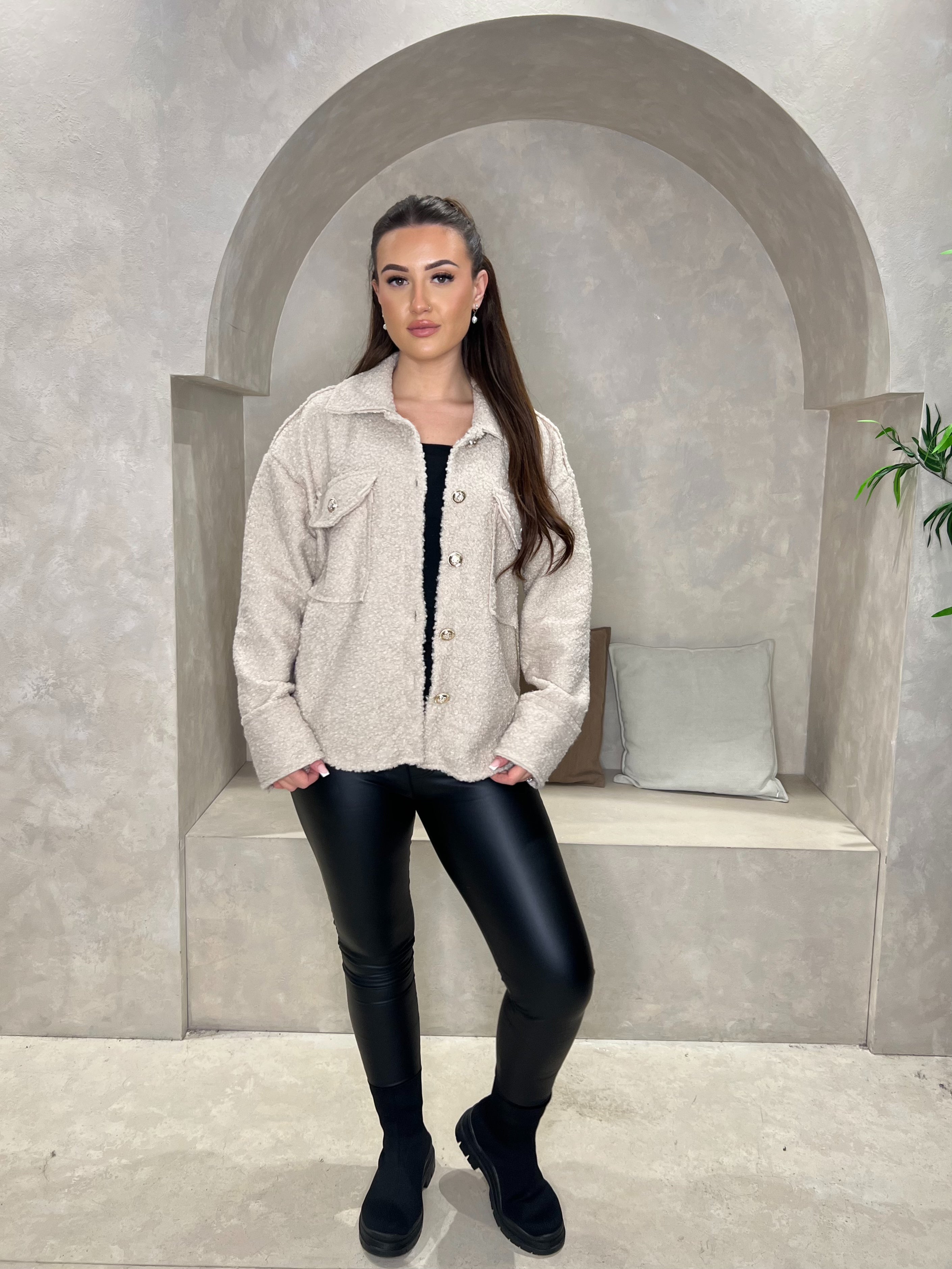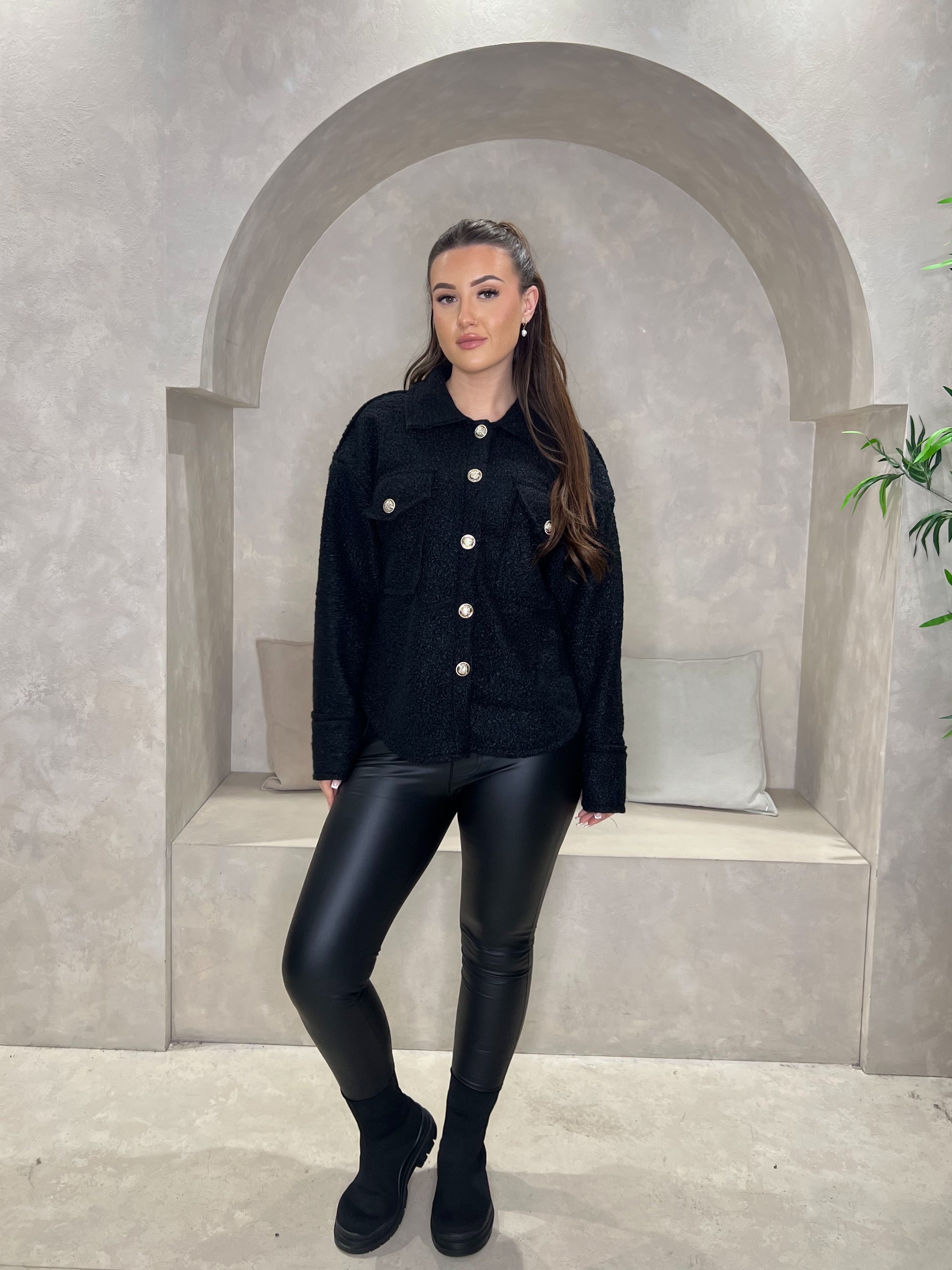 Crafted from luxurious boucle fabric, this short shacket strikes the perfect balance between structured tailoring and relaxed comfort. The collared neckline and long sleeves provide polished sophistication, while button fastening ensures an adjustable fit. Two practical pockets add functionality to this versatile piece, making it an essential layering staple for effortless styling throughout the season.