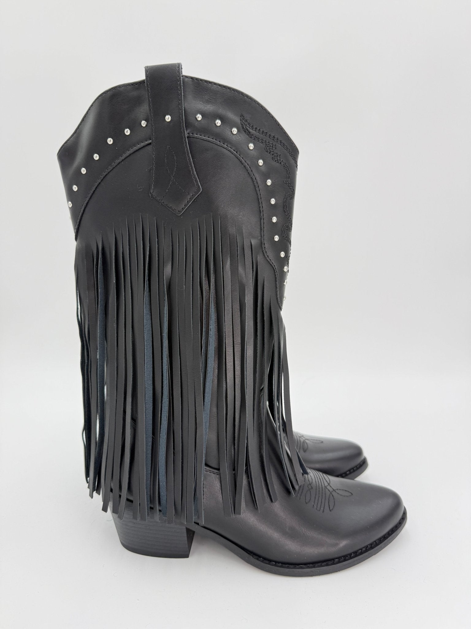 Make a bold statement with these faux leather cowboy boots, designed for those who embrace Western-inspired fashion. The mid-length cut offers versatile styling options, while the convenient 3/4 zip fastening provides practical everyday wearability. Signature details include eye-catching fringe trim, studded accents, and carefully executed embroidery that showcase quality construction. The pointed toe silhouette delivers a sharp, contemporary finish. Reinforced pull tabs simplify the dressing process. Whether you're heading to a festival or seeking standout footwear for casual wear, these boots combine authentic cowgirl aesthetics with modern functionality and undeniable style credentials.