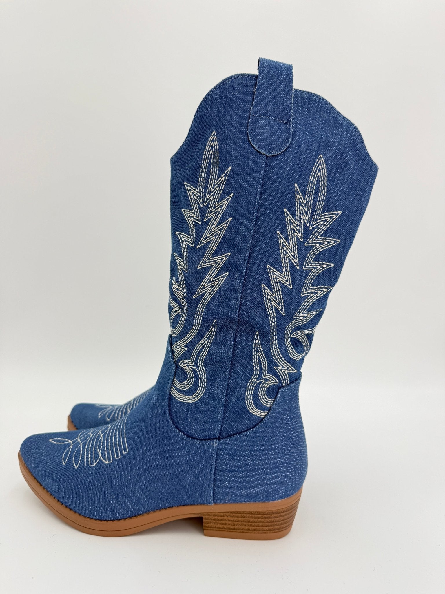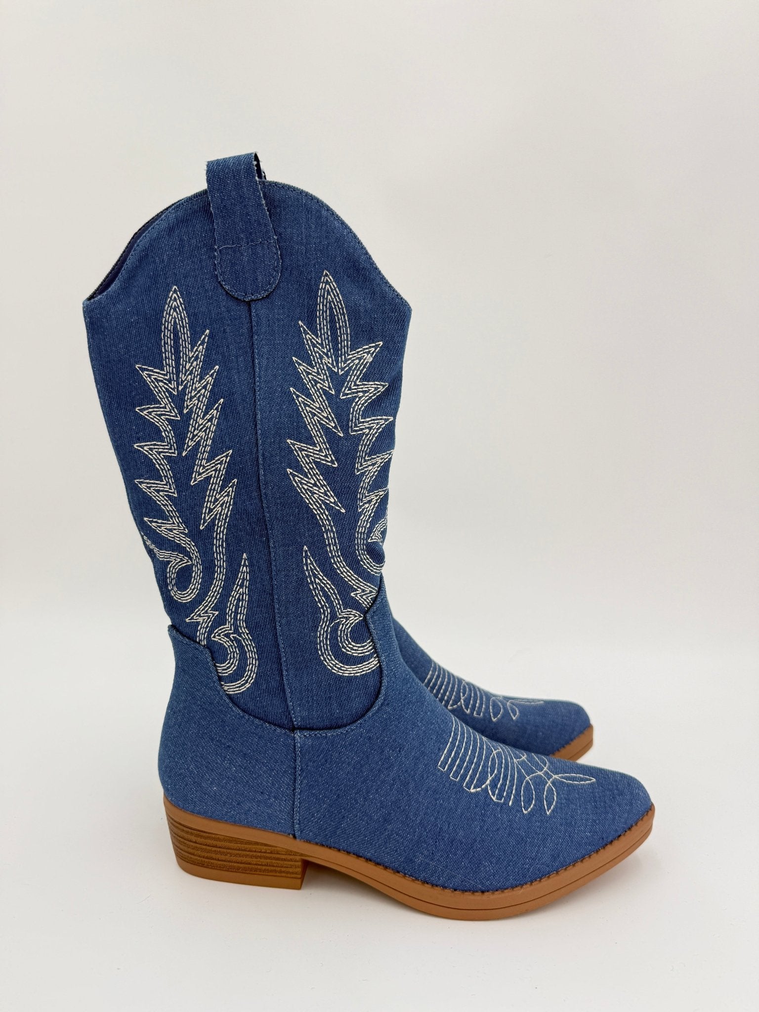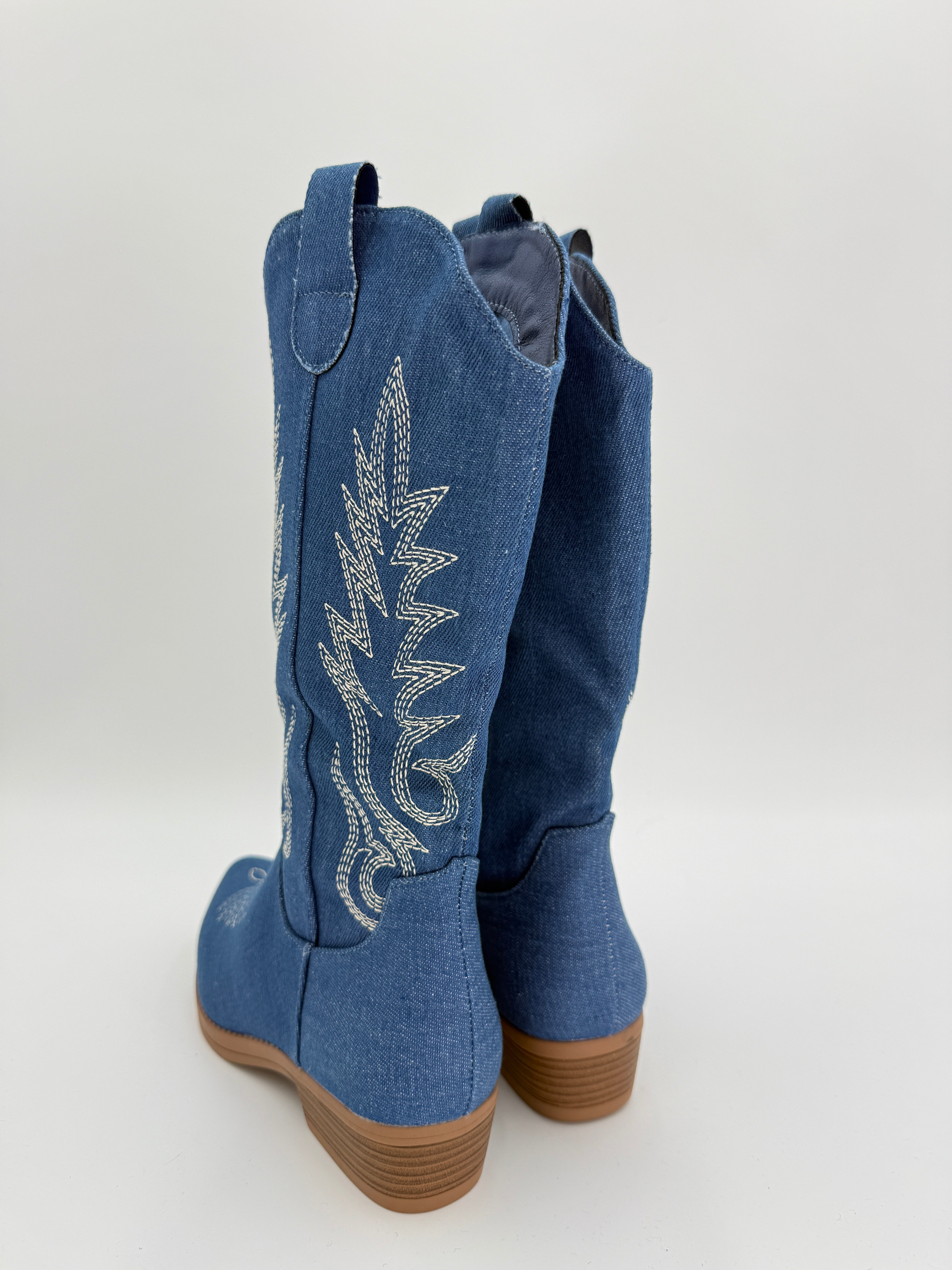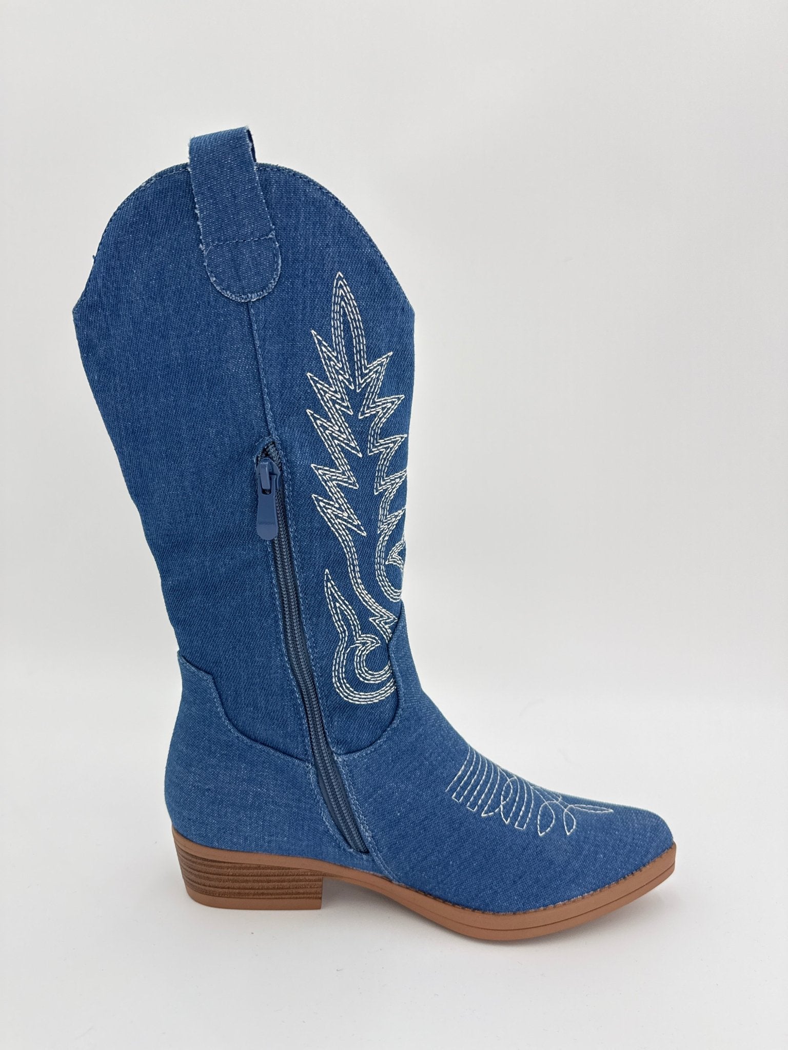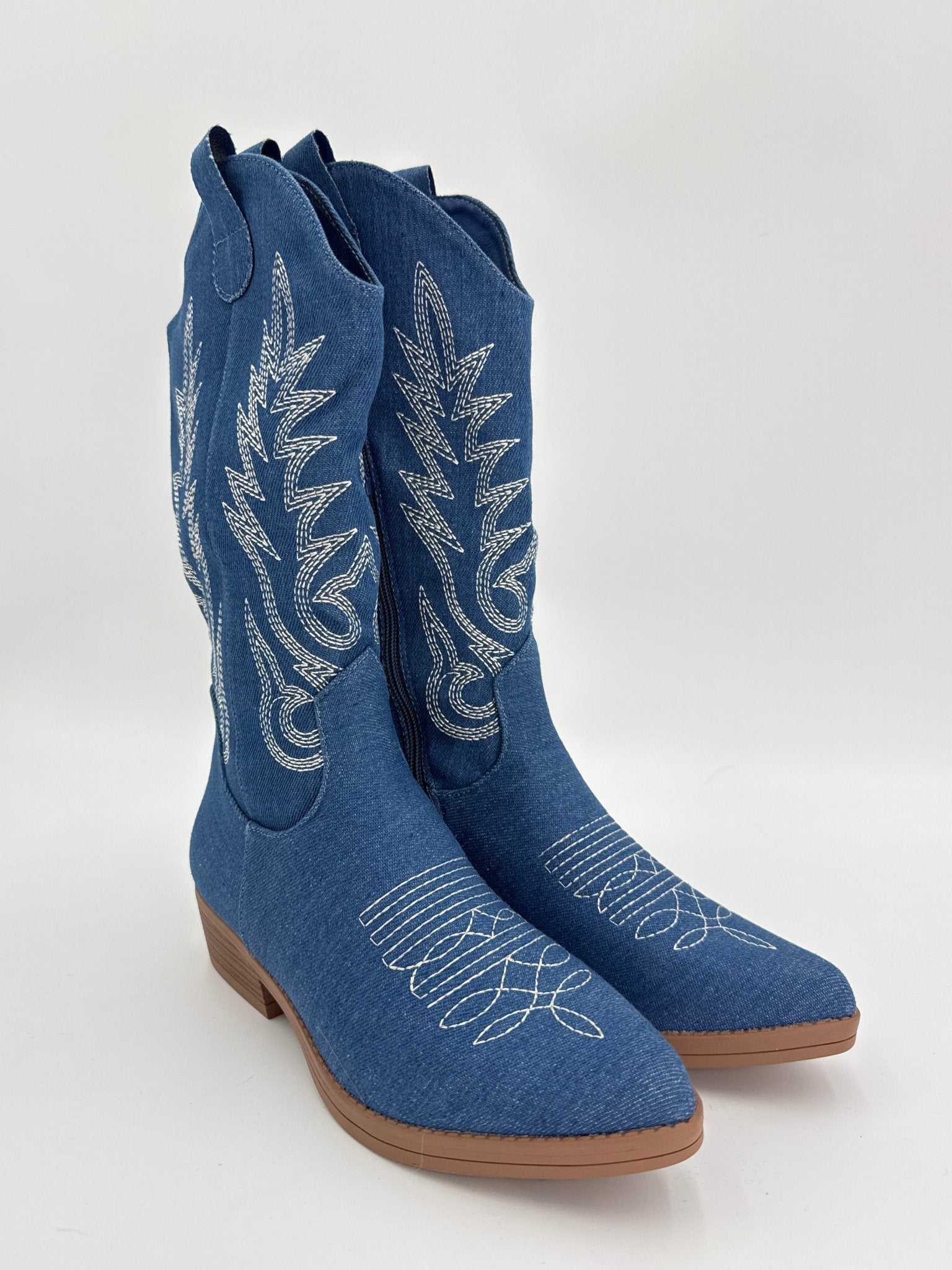 Step into Western style with these striking blue stonewash denim cowboy boots. Featuring a distinctive 3/4 zip closure for easy on-and-off wear, intricate embroidery detailing adds character and flair. The practical pull tab ensures effortless dressing, while the sharp pointed toe delivers authentic cowgirl aesthetics. Perfect for festival season or anyone seeking a bold statement boot that blends rugged charm with contemporary edge.
