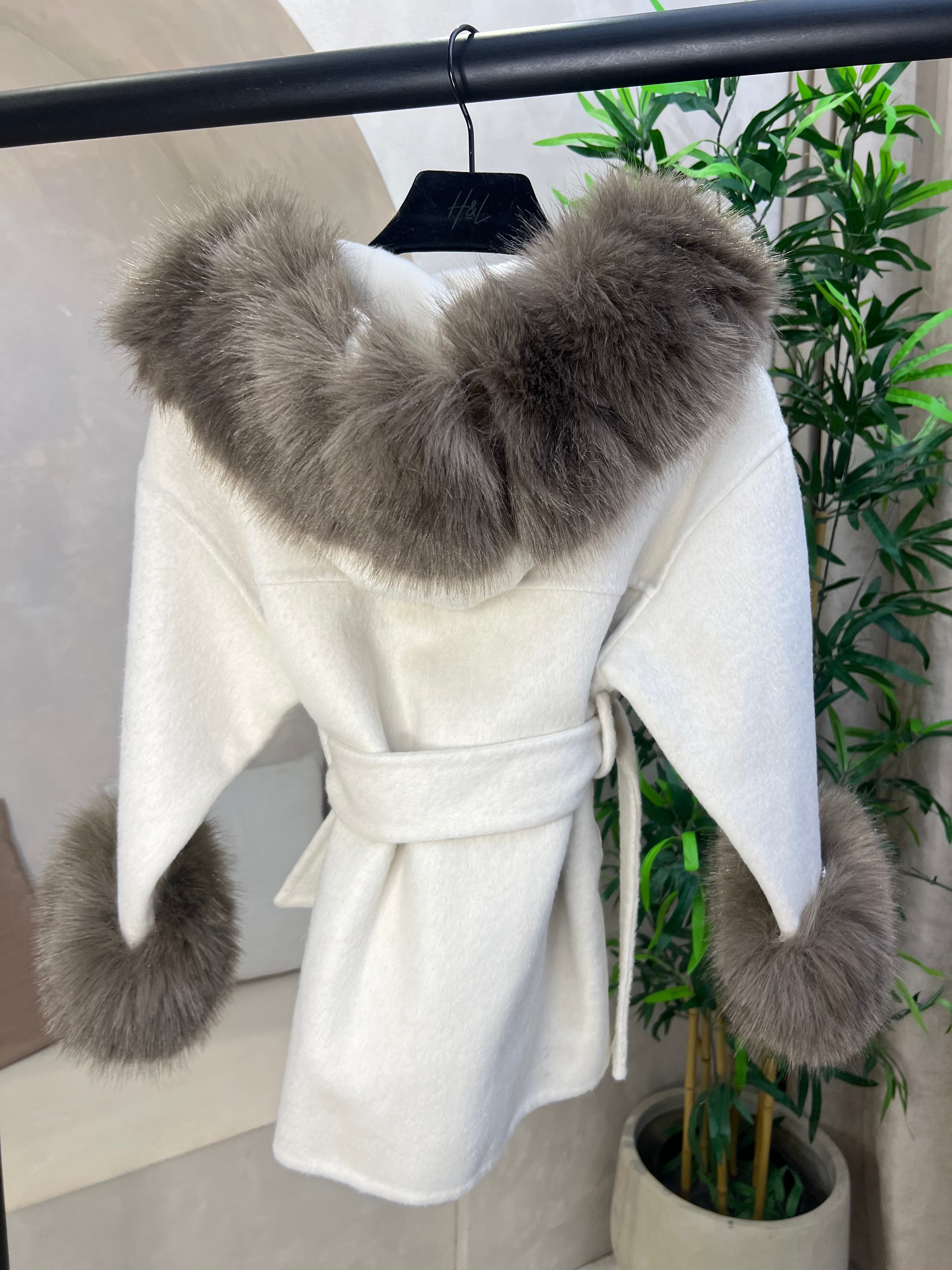 This luxurious children's coat combines warmth with sophisticated style. Crafted from sumptuous cashmere, it features a plush faux fur collar and hood for enhanced insulation and an elegant finish. The matching faux fur cuffs add a refined touch, whilst the adjustable belt allows for a customised fit as your child grows. Practical deep pockets provide convenient storage for small essentials. The neutral beige and chocolate colourway ensures versatility across any winter wardrobe, making this piece both a timeless investment and a statement piece for special occasions.