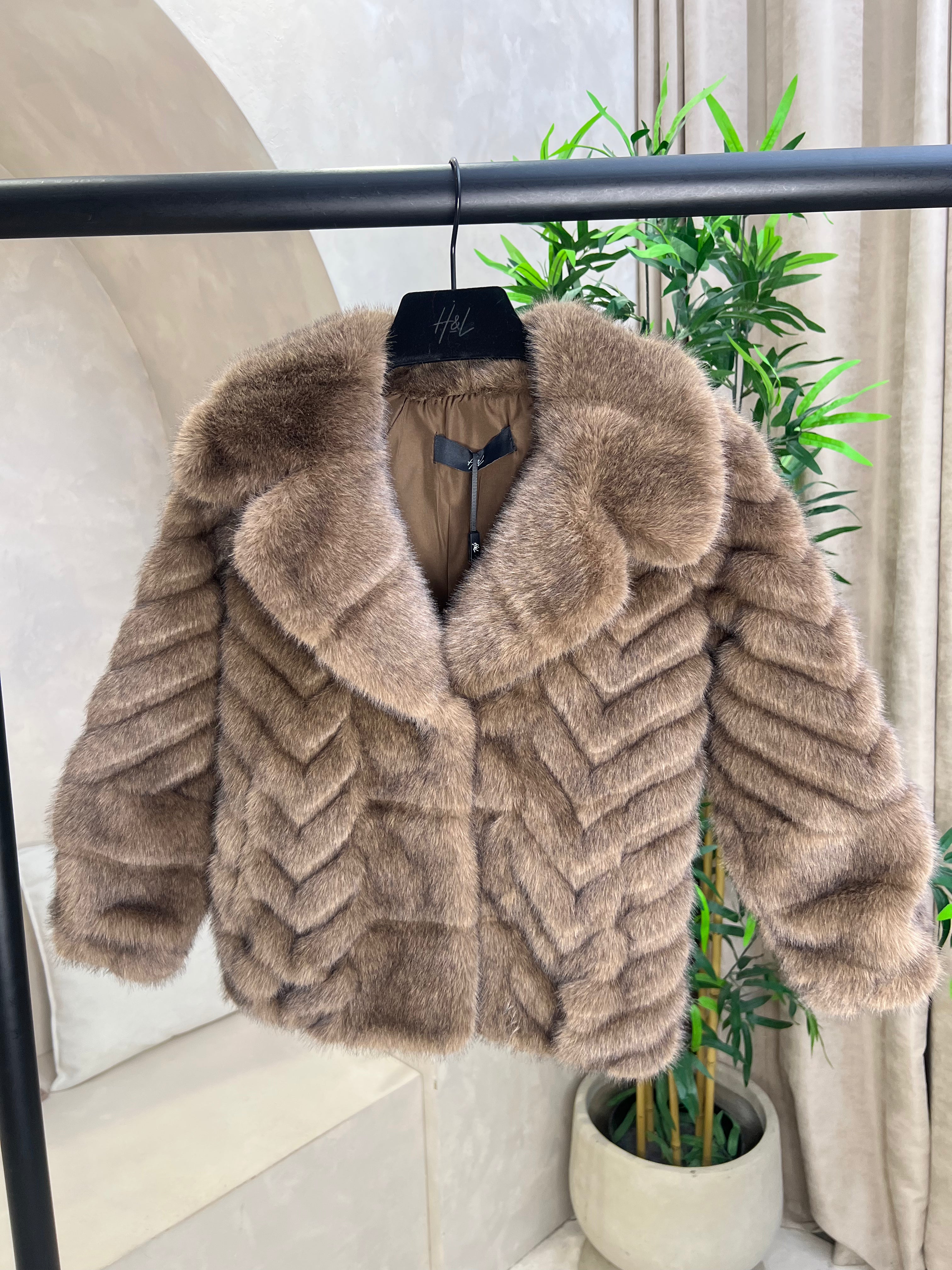 This children's coat combines style with practical design features. The luxurious faux fur construction offers warmth without the weight, while the oversized collar adds a contemporary silhouette that's both flattering and functional. The distinctive zig zag pattern creates visual interest, making it a standout piece in any winter wardrobe. Secure hook and eye fastening ensures a snug fit, and two generous pockets provide convenient storage for small essentials. Perfect for layering during colder months, this chocolate-toned coat delivers comfort and sophistication for young wearers.