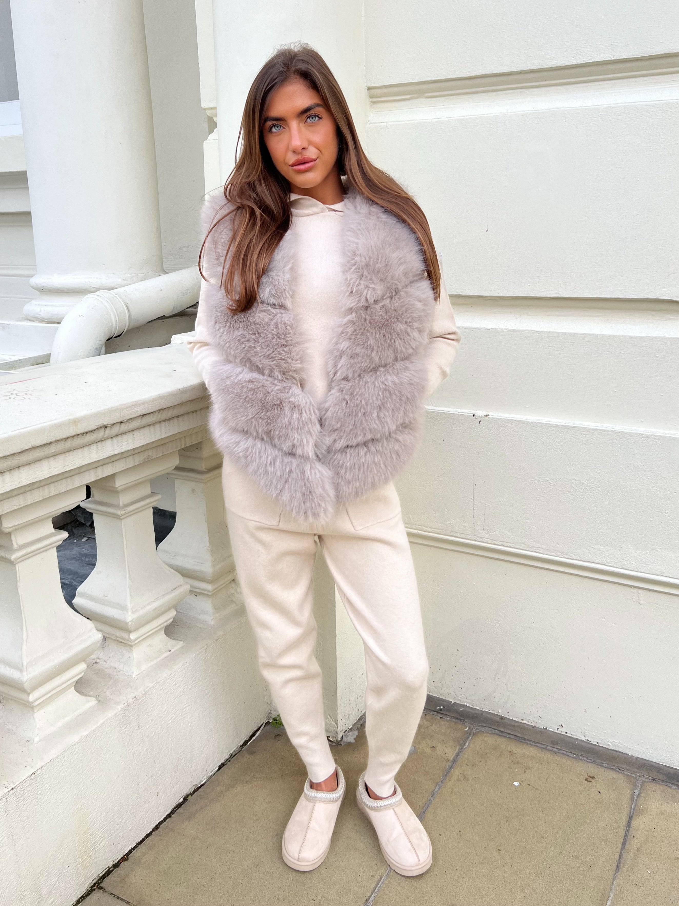 Gönnen Sie sich Luxus mit unserer beigefarbenen Premium-Kunstpelzweste. Diese aus feinstem Kunstpelz gefertigte Weste wertet jedes Outfit sofort auf. Bleiben Sie warm und stilvoll und setzen Sie gleichzeitig mit seiner weichen und plüschigen Textur ein Statement. Perfekt für jede Fashionista, die sowohl Komfort als auch Stil sucht.