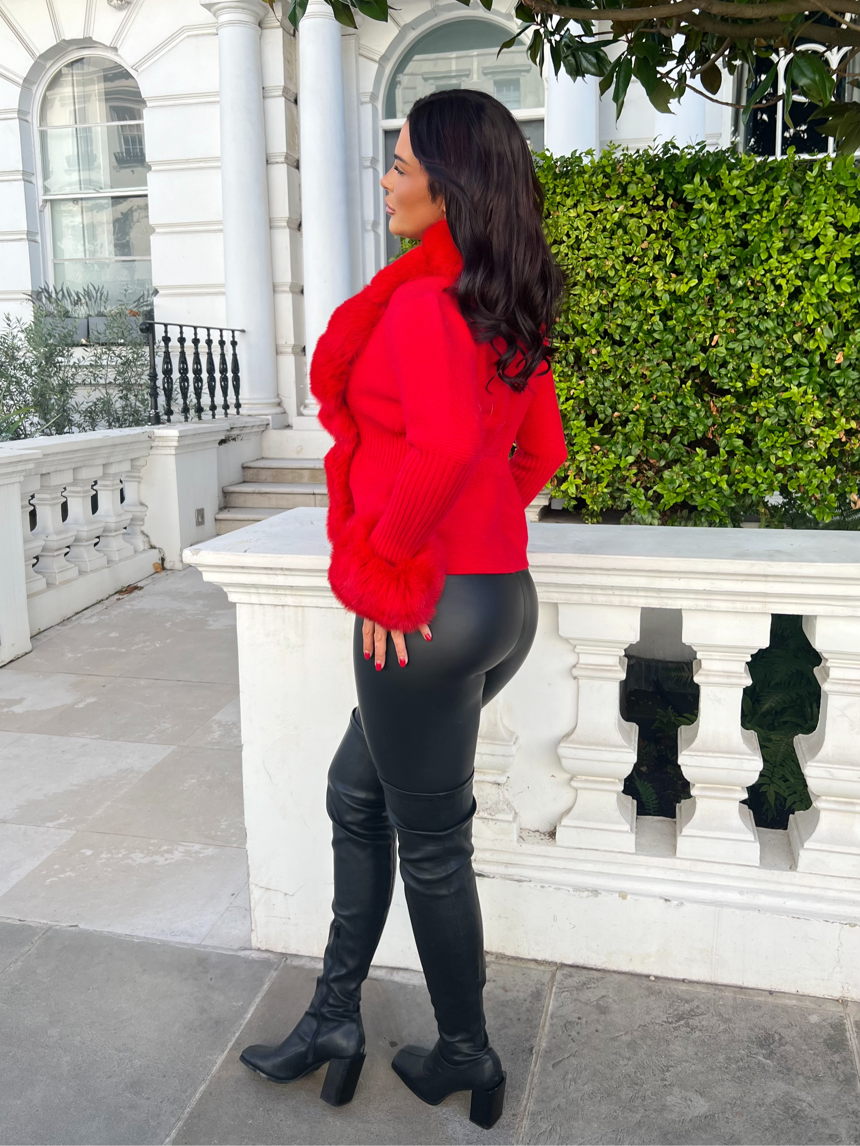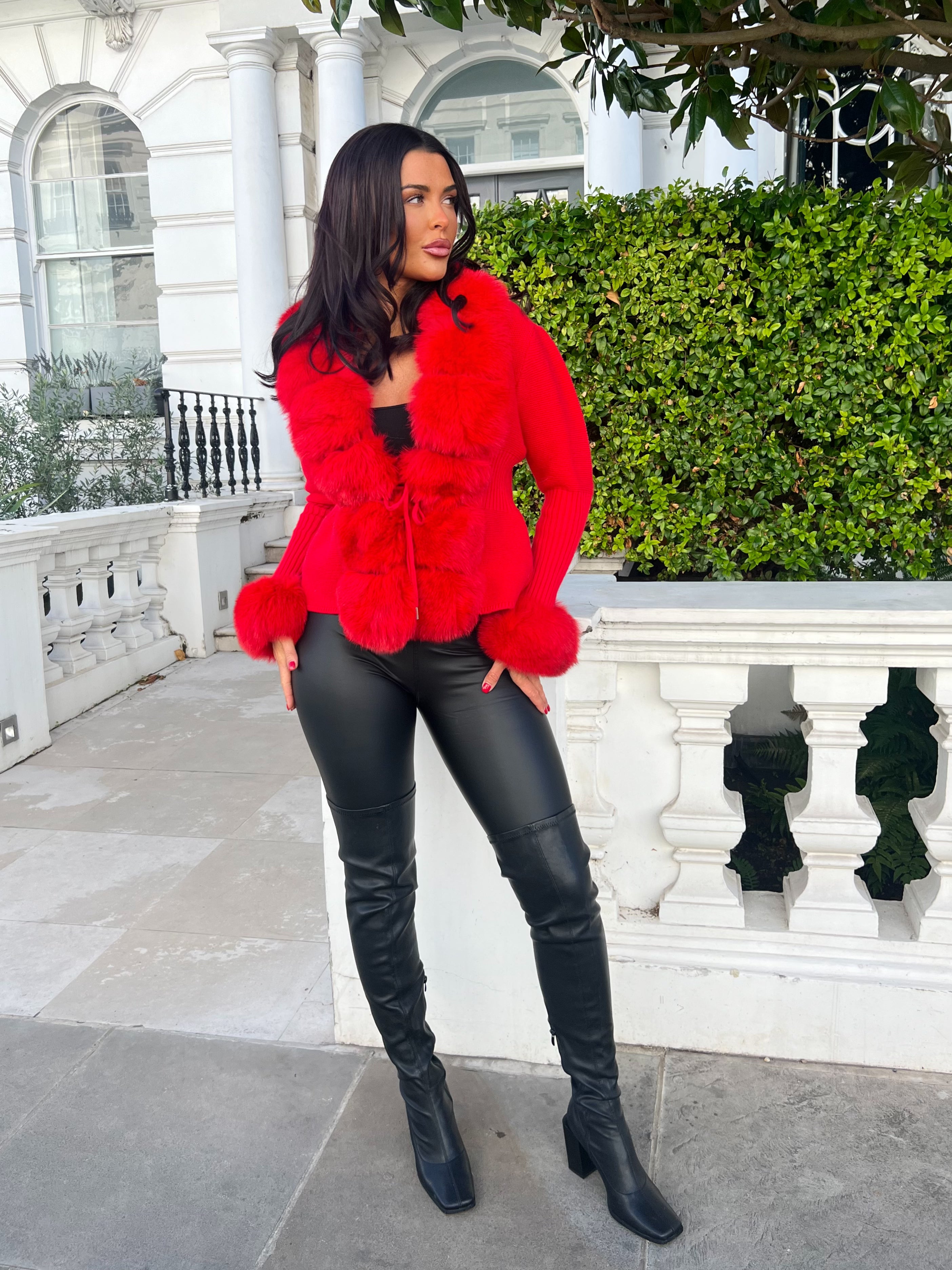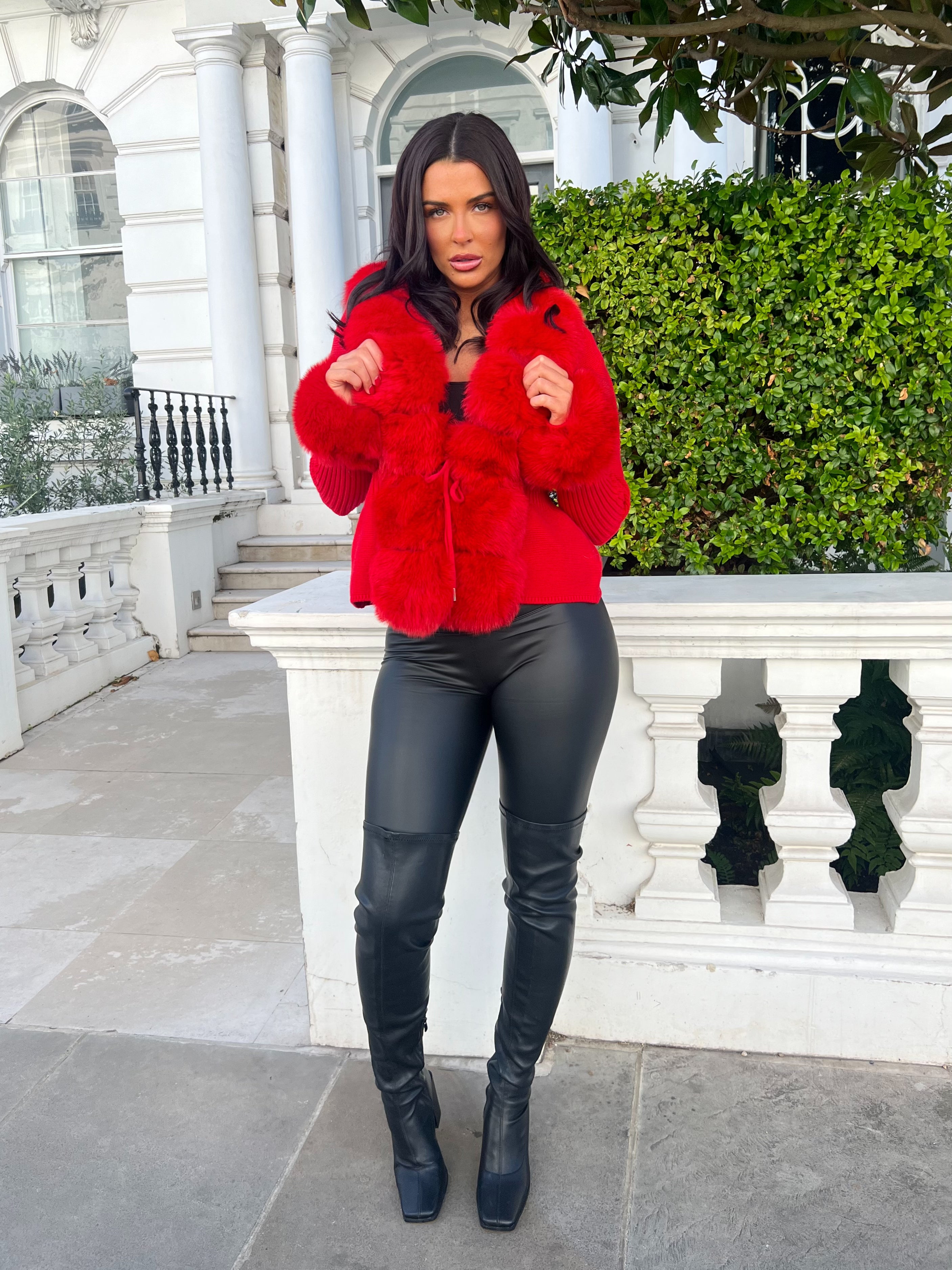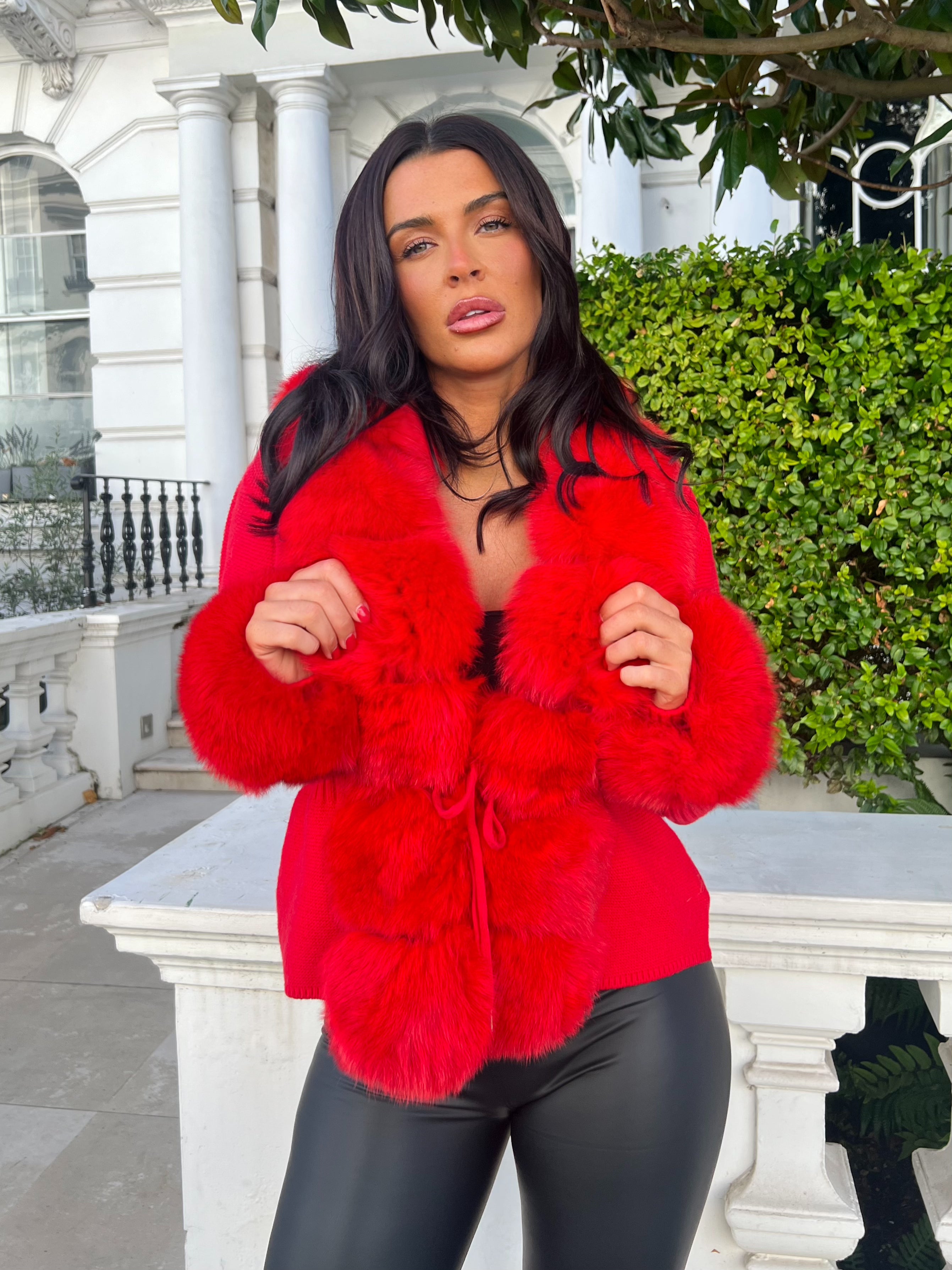 Gönnen Sie sich Luxus mit unserem Luxus-Pelz-Cardigan. Dieser Cardigan besteht aus weichem Strickstoff, Fellbündchen und einer Fellvorderseite und wertet jedes Outfit auf. Der Kordelzug verleiht einen Hauch von Eleganz und Vielseitigkeit. Bleiben Sie warm und stilvoll mit unserem Premium-Cardigan.