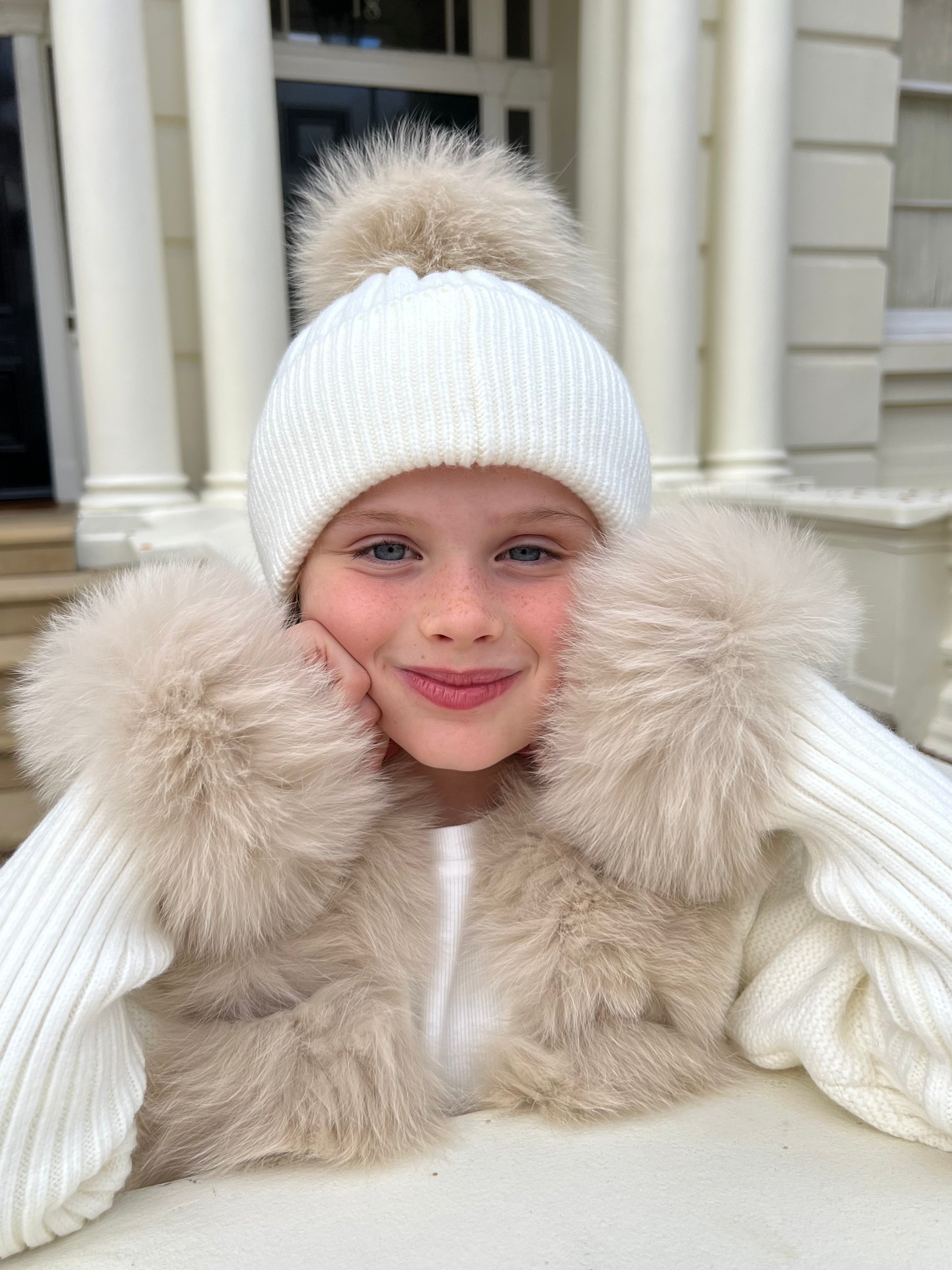 Luxuriöse Bommelmütze aus Fell für Kinder in Weiß/Beige