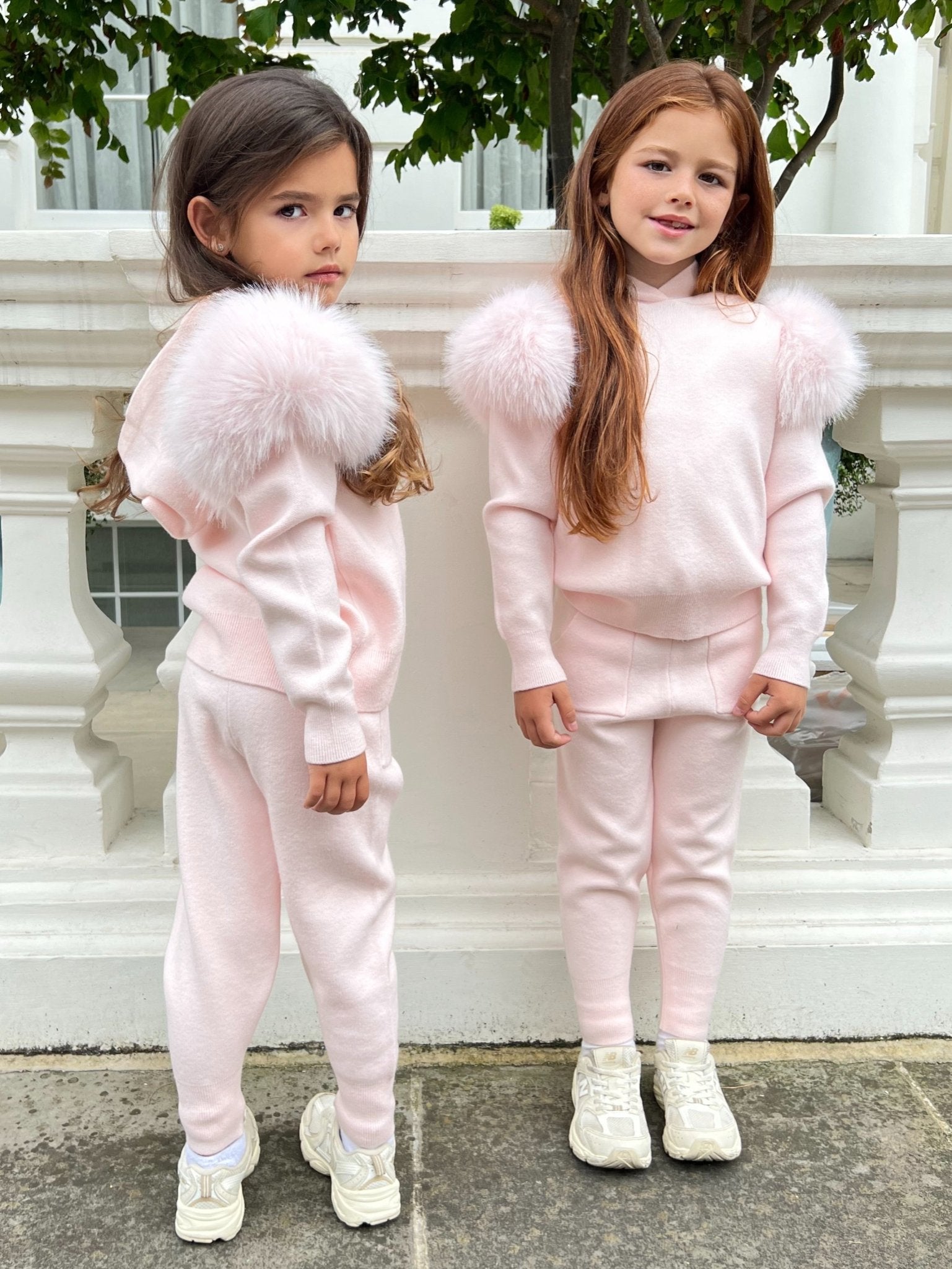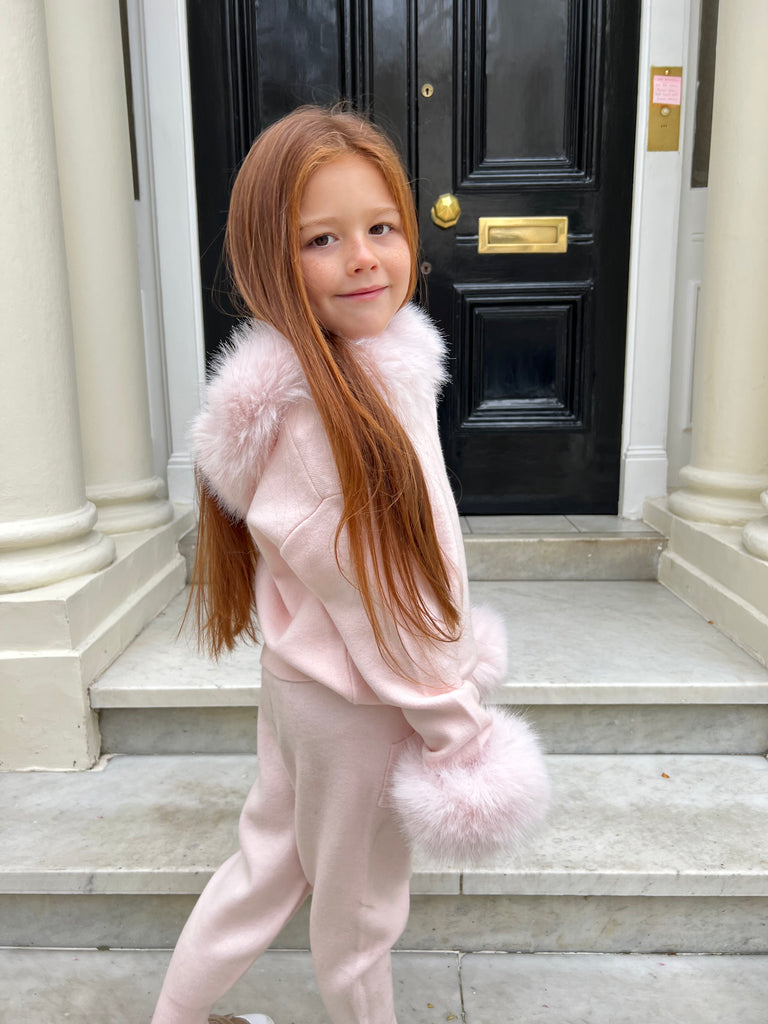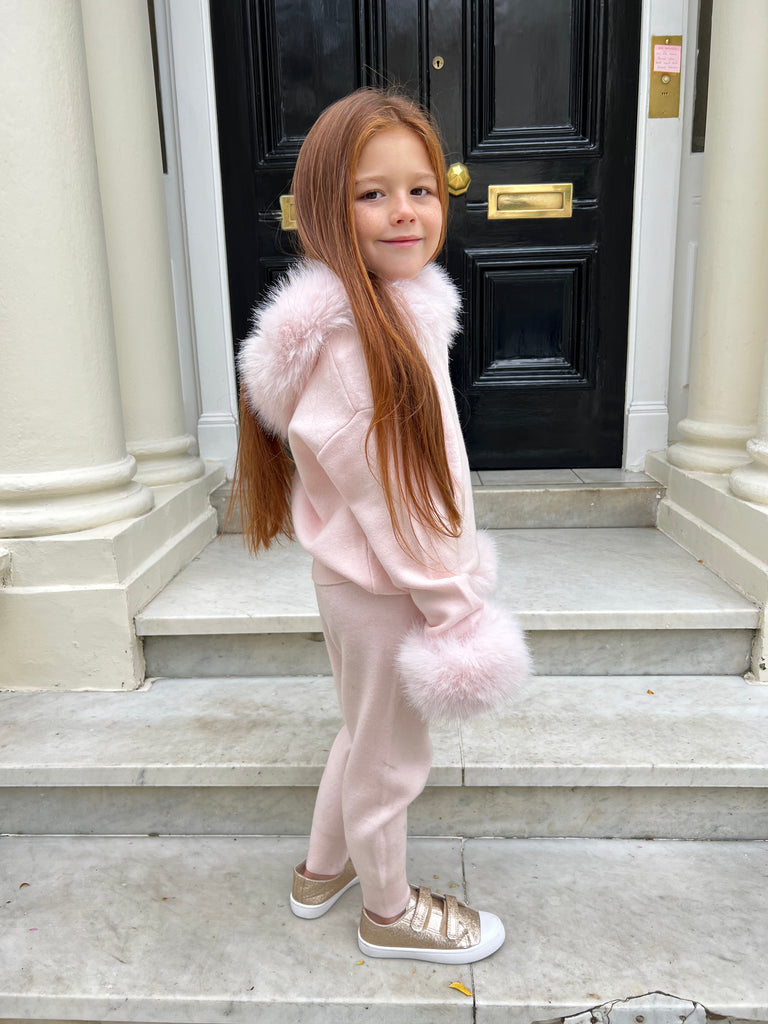 Childrens Baby Pink Premium Faux Fur Hood & Cuff Jogger Tracksuit