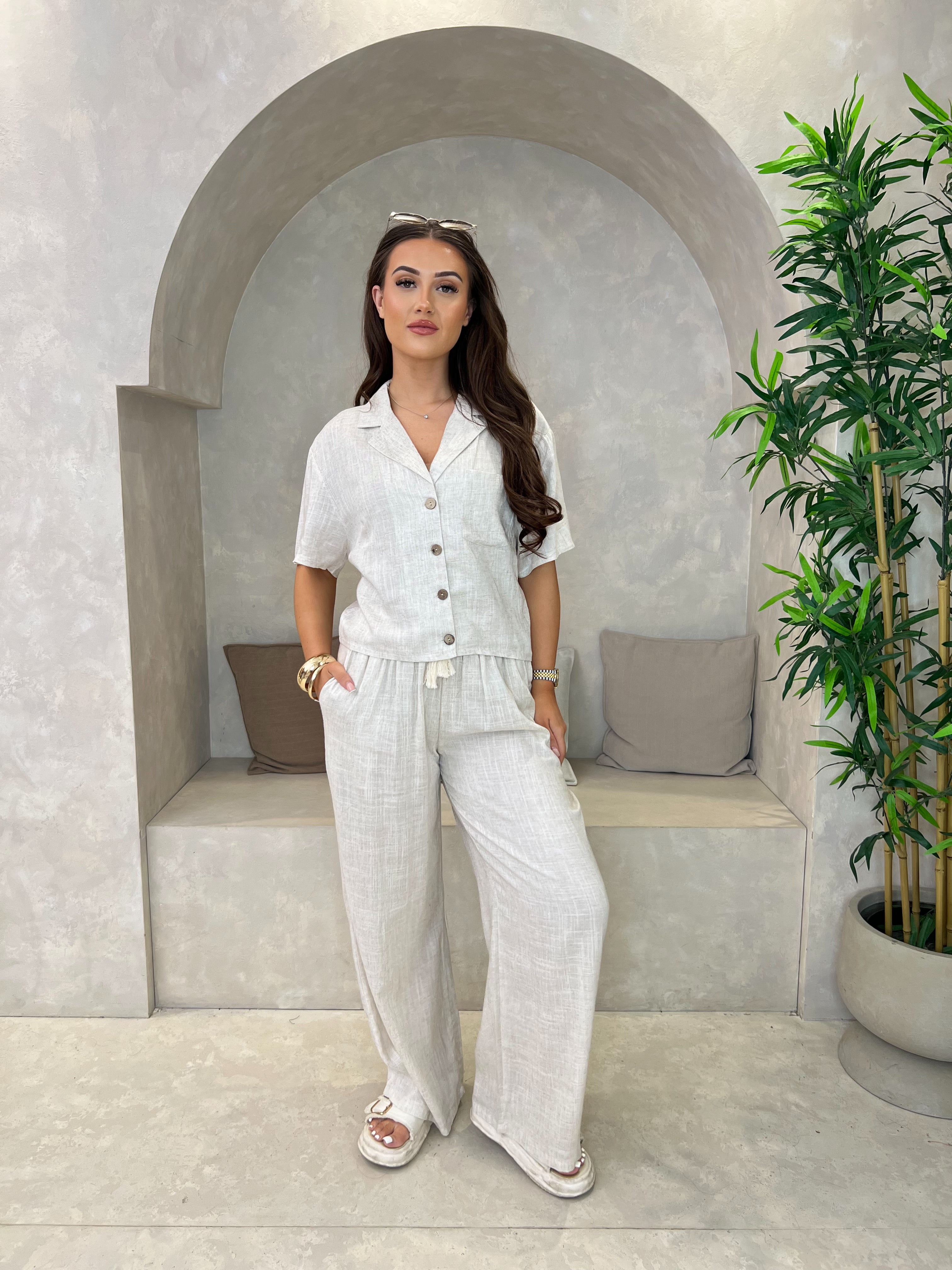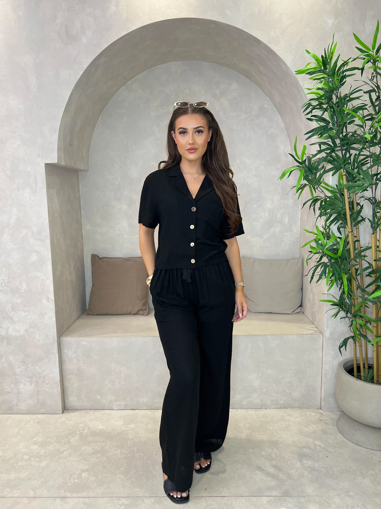 Dieses ärmellose Hosenset mit weitem Bein bietet mit seinem strukturierten Stoff und dem Stehkragen sowohl Stil als auch Komfort. Dieses Set eignet sich perfekt für jeden Anlass und sorgt dafür, dass Sie den ganzen Tag über selbstbewusst aussehen und sich wohl fühlen. Werten Sie Ihre Garderobe mit diesem Must-have auf.