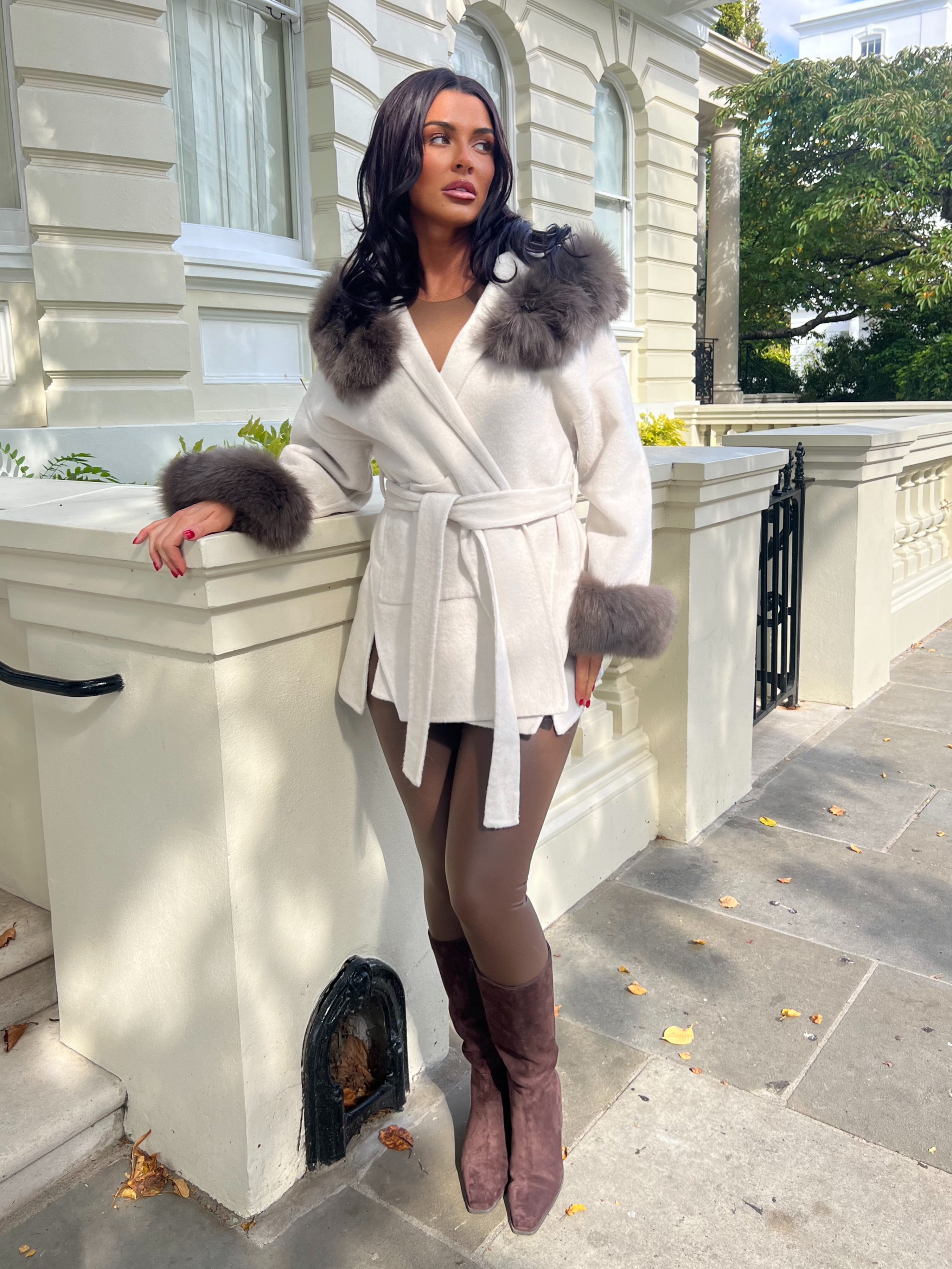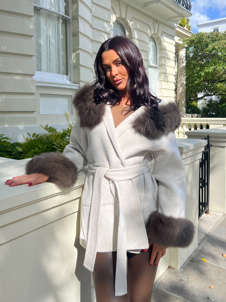Beige/Chocolate Cashmere Coat With Fox Fur Trim