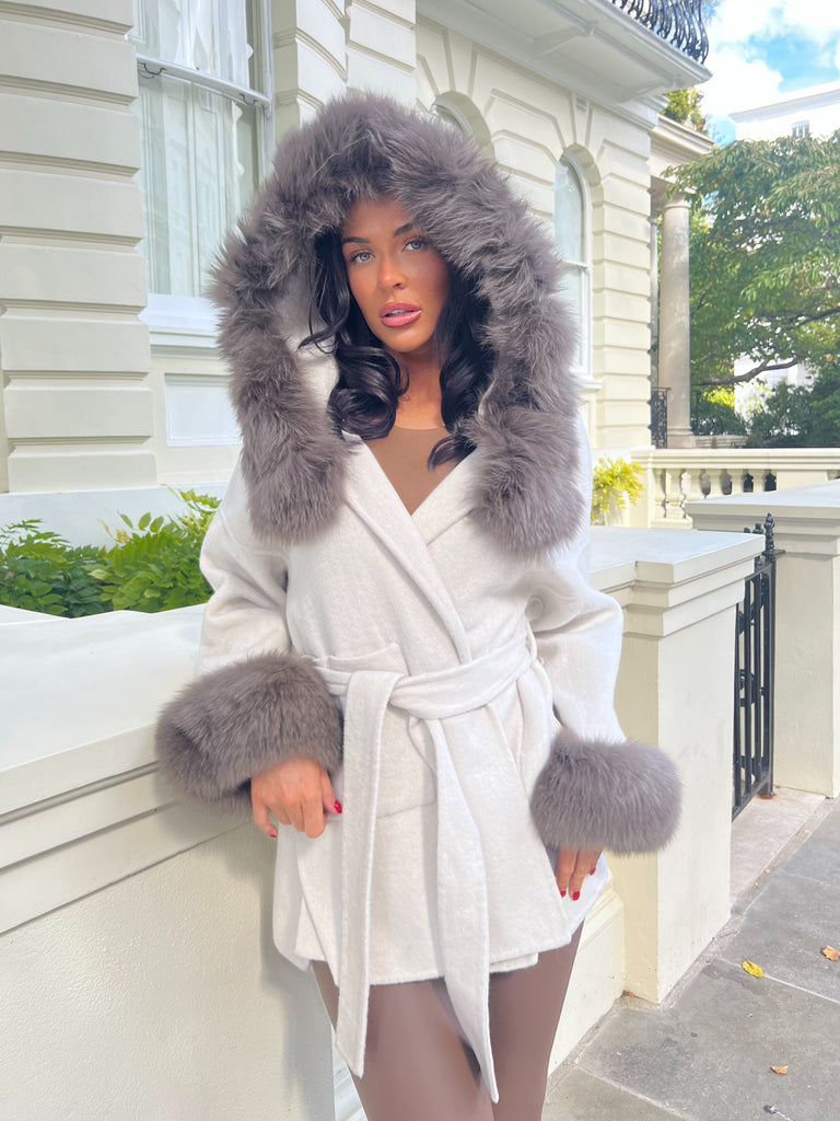 Elevate your winter style with our Belted Fox Fur coat. Designed in mid length, it features a flattering belted waist, Fox fur trim on the hood and cuffs for added warmth. Stay chic and cozy in this must-have cold weather essential.
