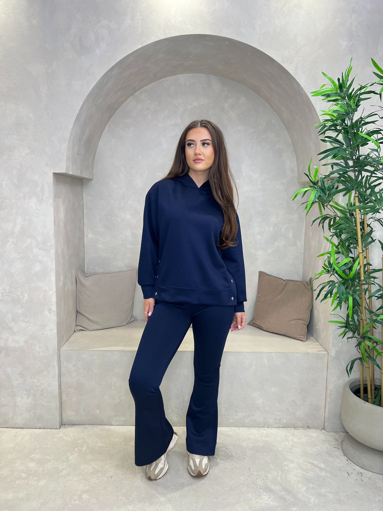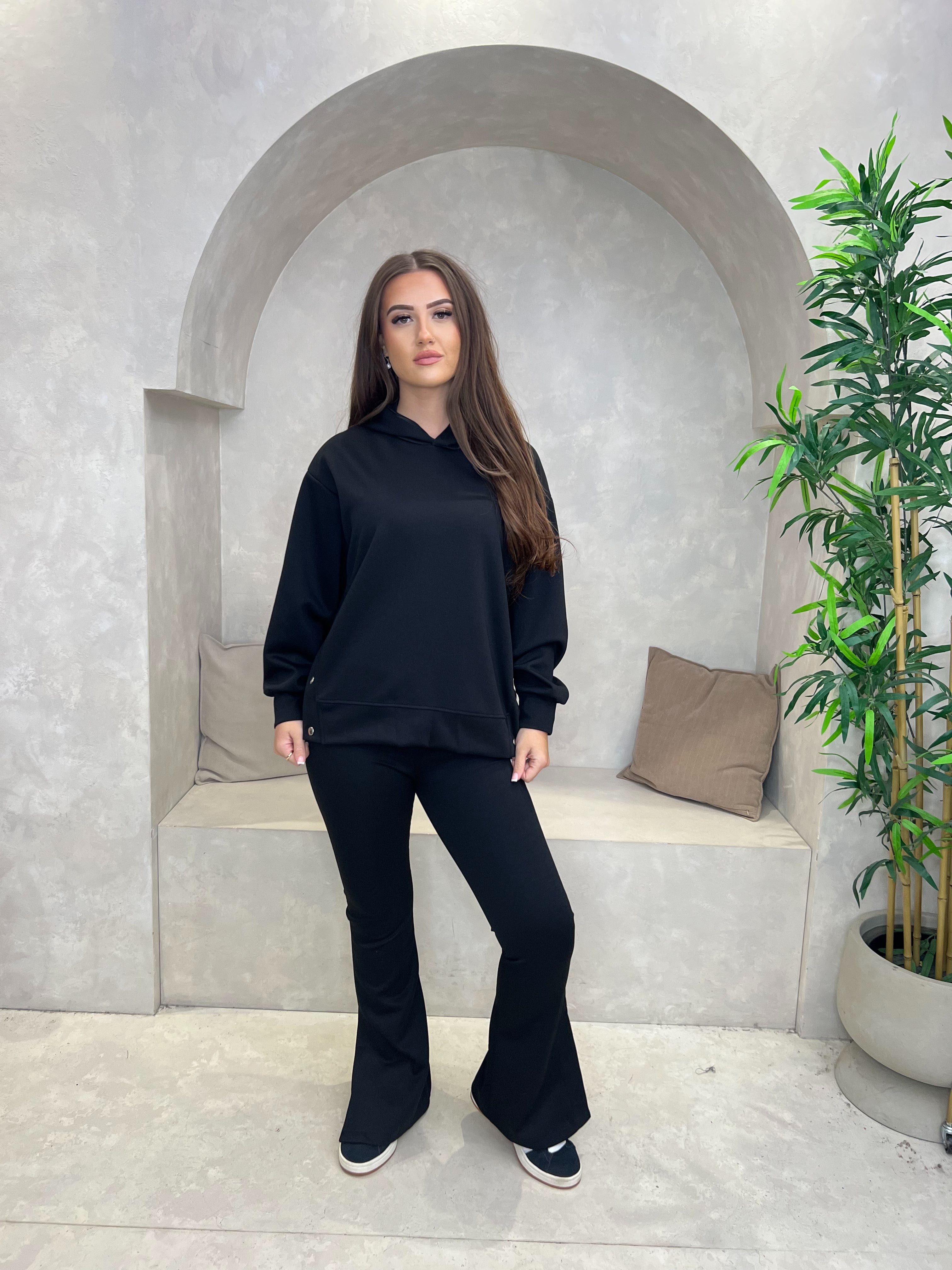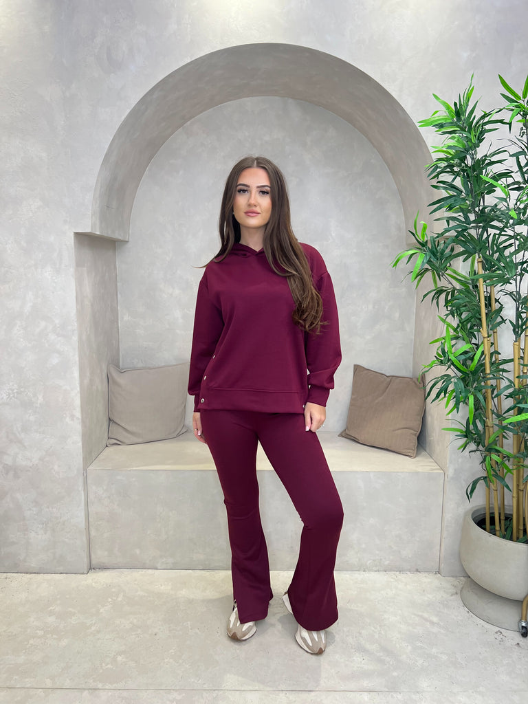 This coordinated set features a hooded top with long sleeves finished with cuffed hems, designed for a comfortable fit and subtle detailing. The wide-leg trousers boast an elasticated waist for ease of movement, complemented by popper details on the sides that enhance style and functionality. Perfect for a relaxed yet polished look, this co-ord balances comfort with contemporary design elements.