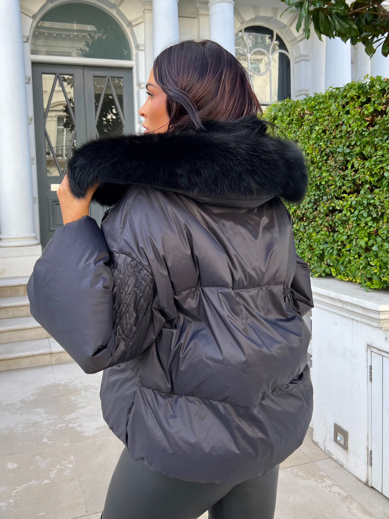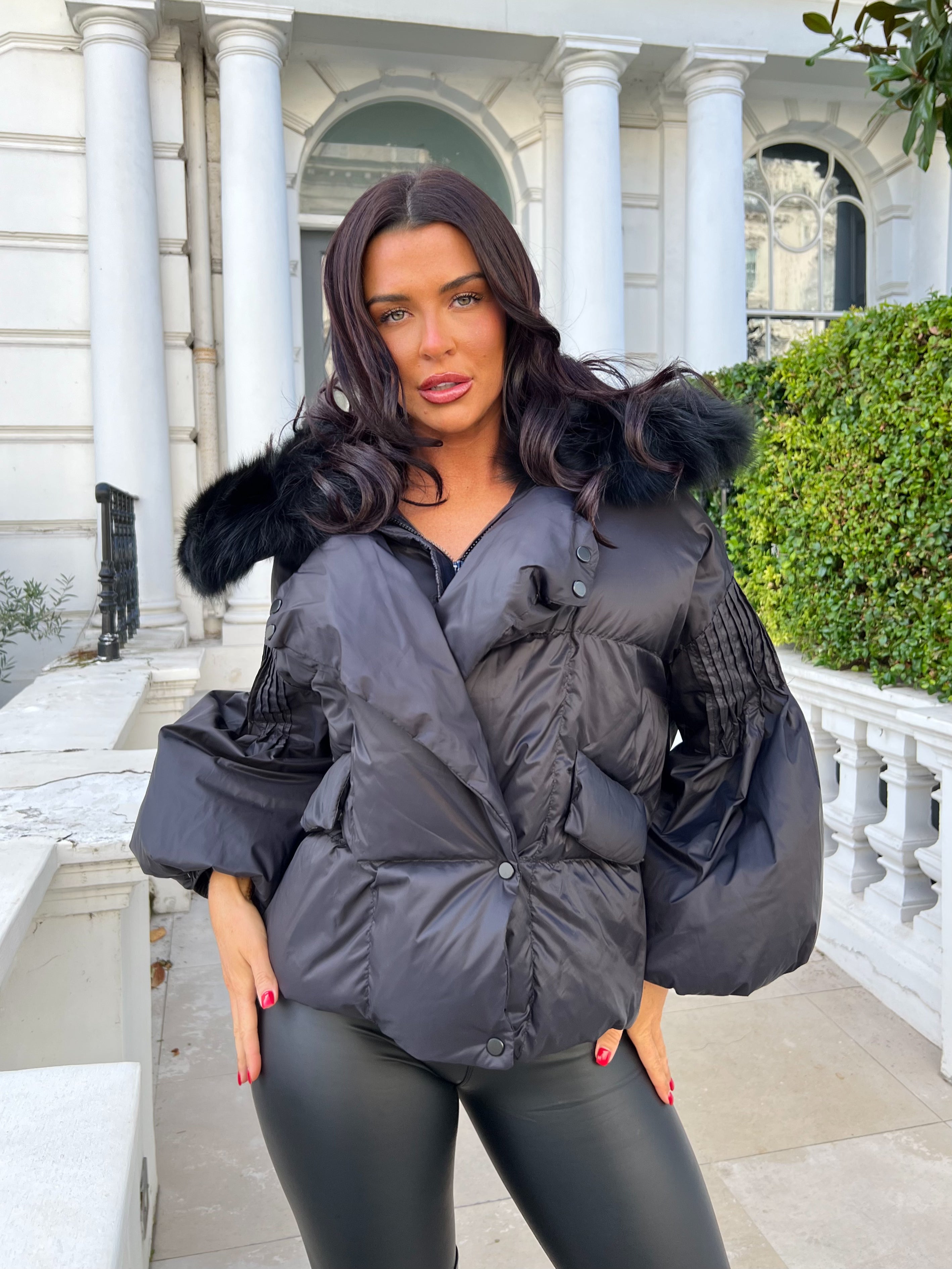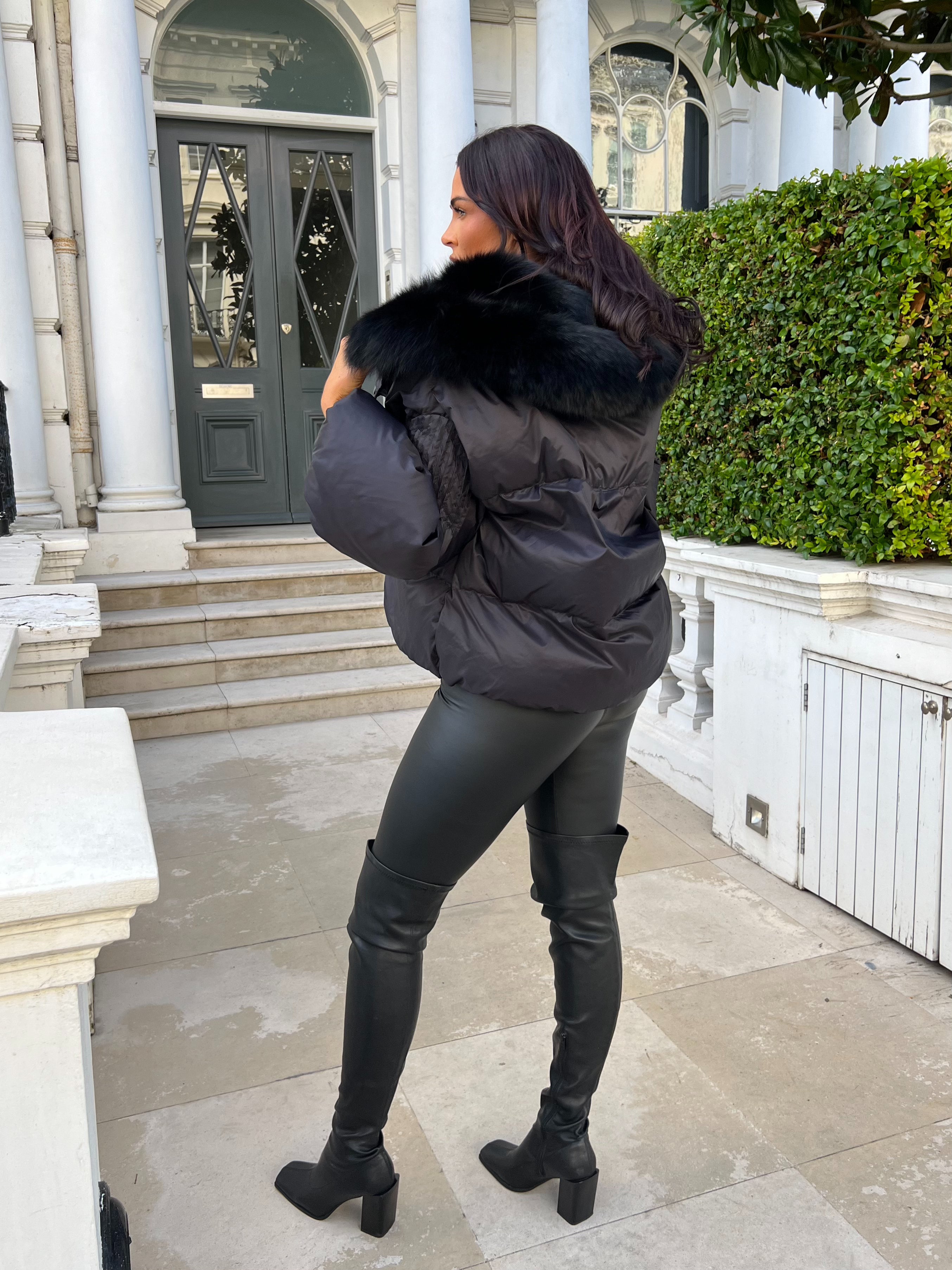 Bringen Sie Glamour auf die nächste Ebene mit dieser luxuriösen Jacke mit Pelzbesatz. Kombinieren Sie diese Jacke mit unseren beliebtesten Wet-Look-Leggings und klobigen Stiefeln, um den Look zu vervollständigen.