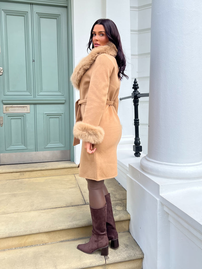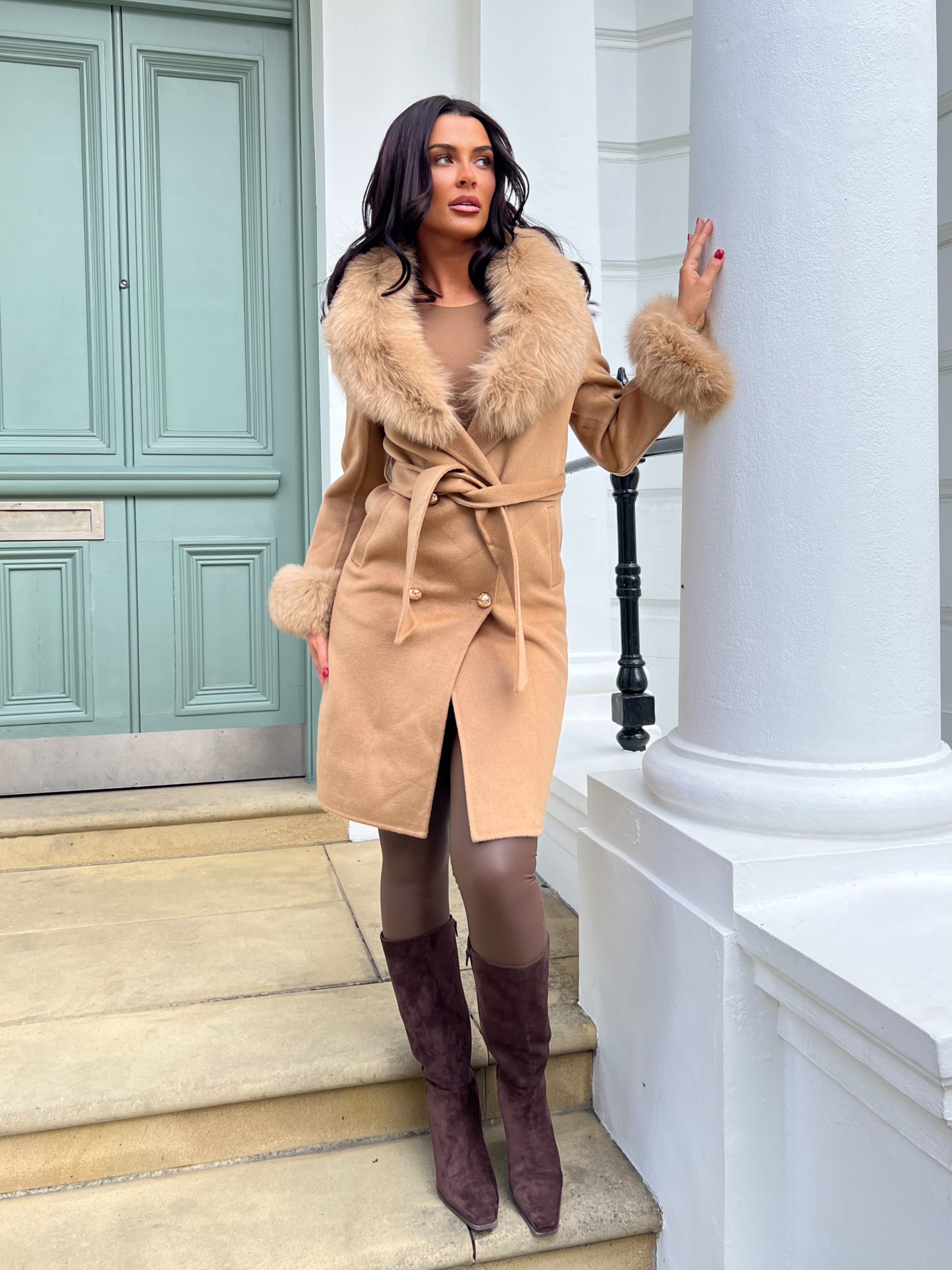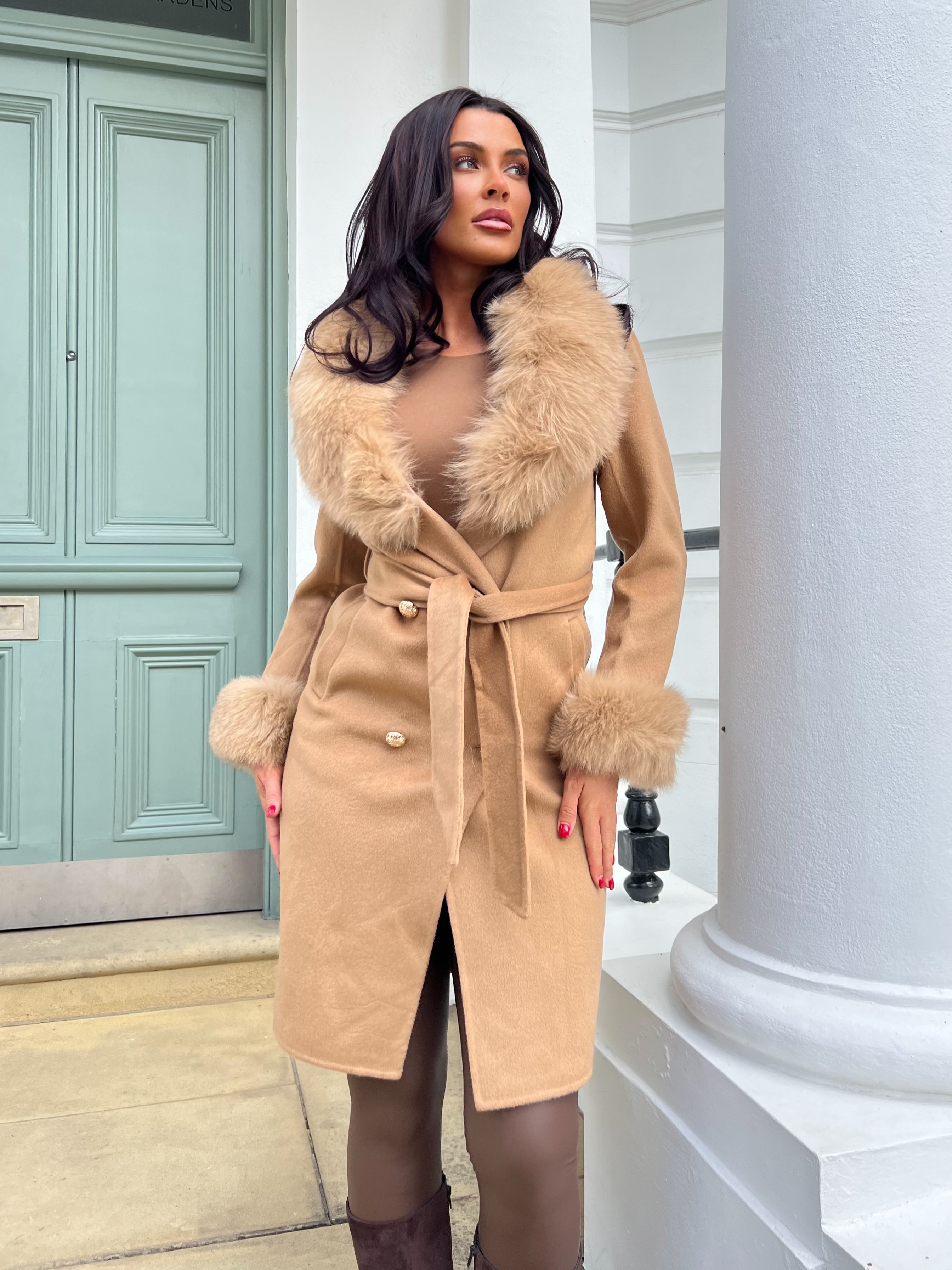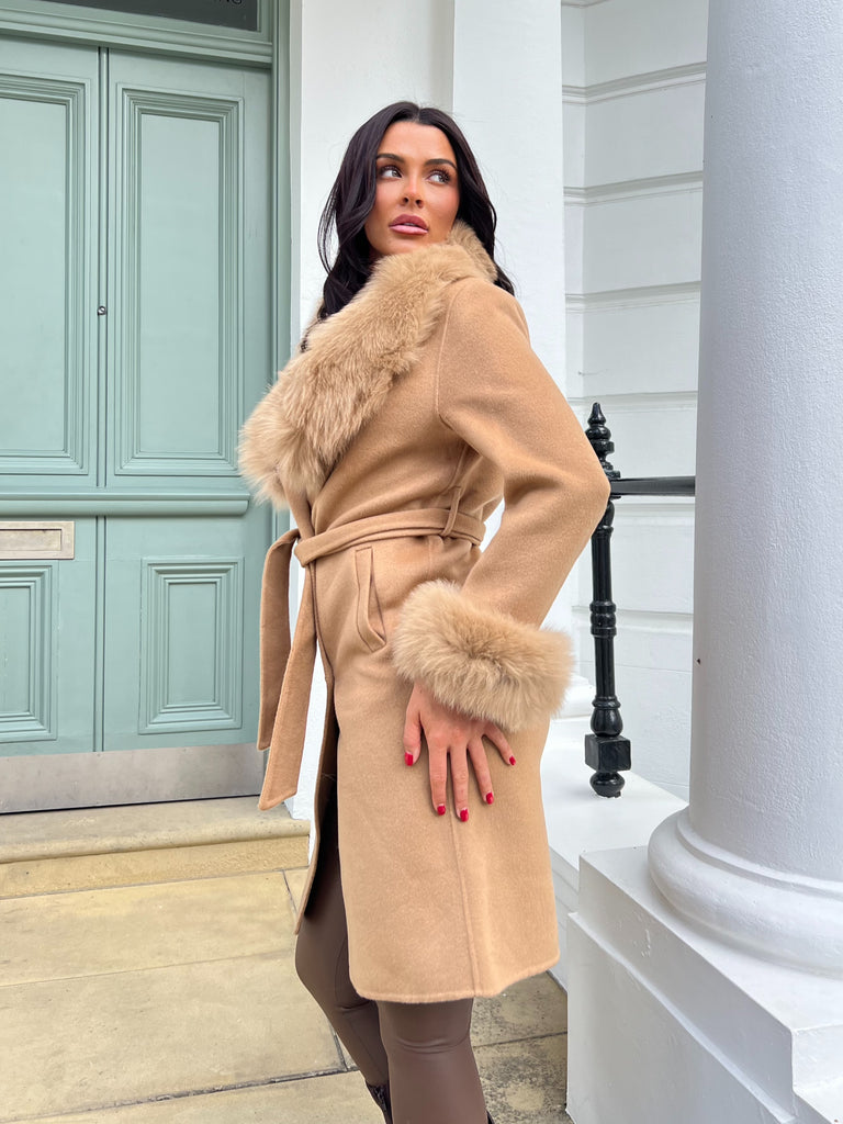 Wie umwerfend ist unser Camel Luxury Fur Cashmere Coat – der Mantel, den Sie diesen Winter brauchen. Mit luxuriösem Pelzbesatz und -manschetten sowie einem Taillengürtel, der Ihnen Form verleiht. Kombinieren Sie es mit einem Winterlook, um eine gemütliche und dennoch schicke Atmosphäre zu schaffen.