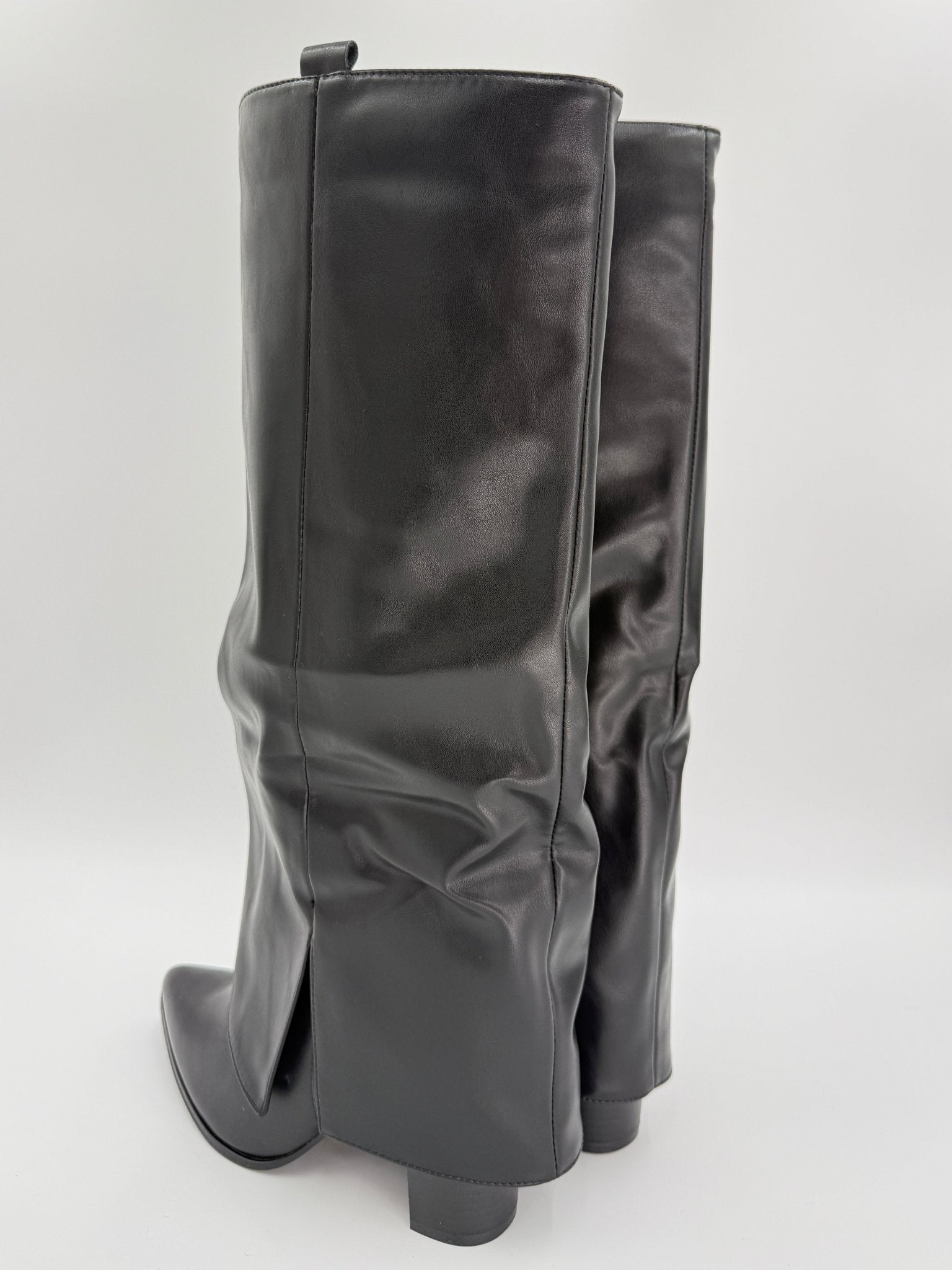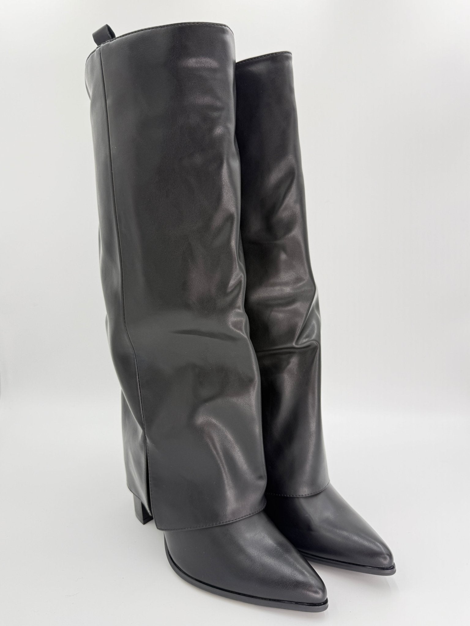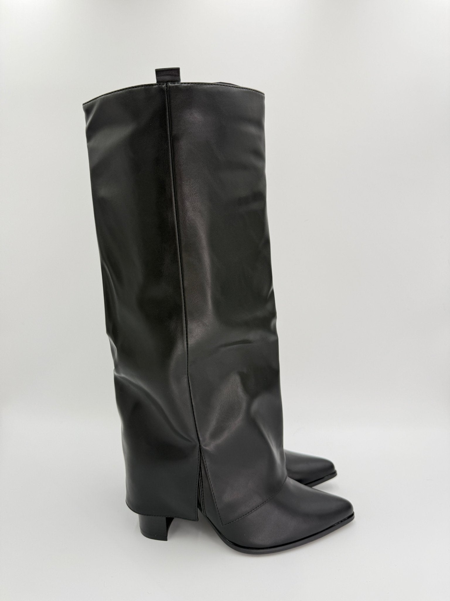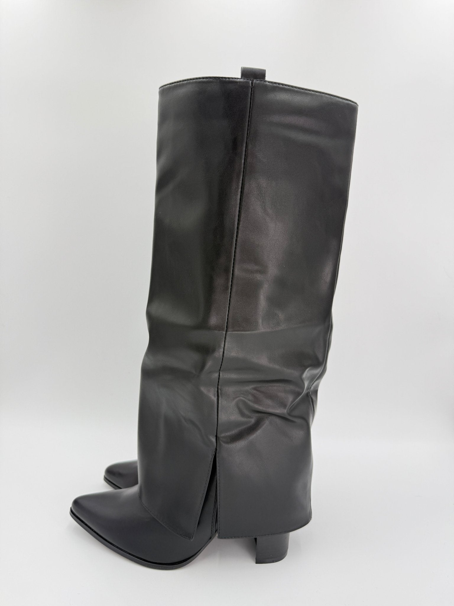 Elevate your night out with these expertly crafted black boots that command attention. The signature fold-over cuff creates an unexpected design element, whilst the pointed toe delivers refined elegance. Constructed from quality faux leather, they feature a practical side split and pull tab for effortless styling. The stable block heel ensures you can dance and socialise comfortably all evening. Whether you're heading to cocktails or a night on the town, these boots offer the perfect balance of edge and sophistication for any going-out occasion. Shark Boot.