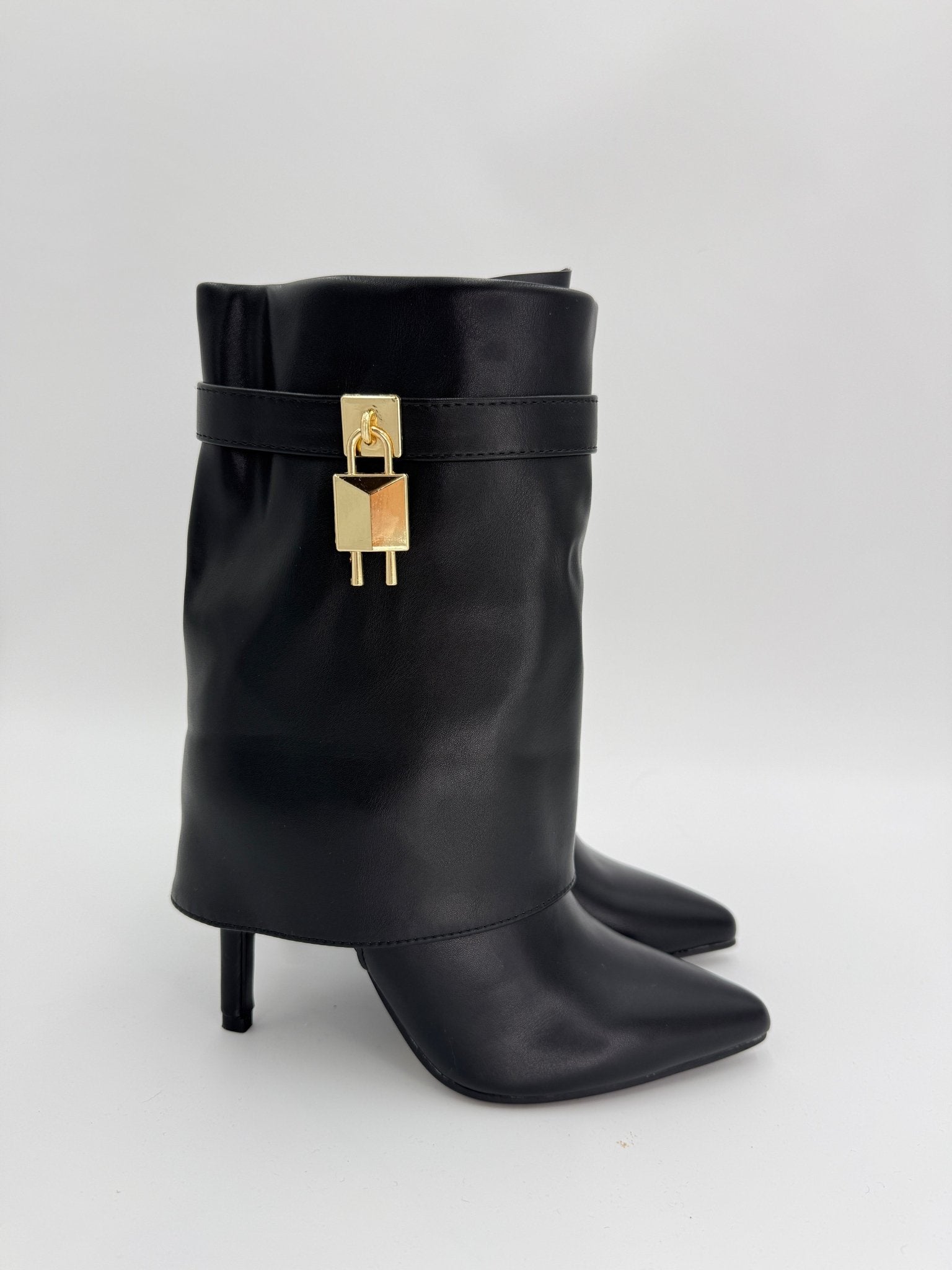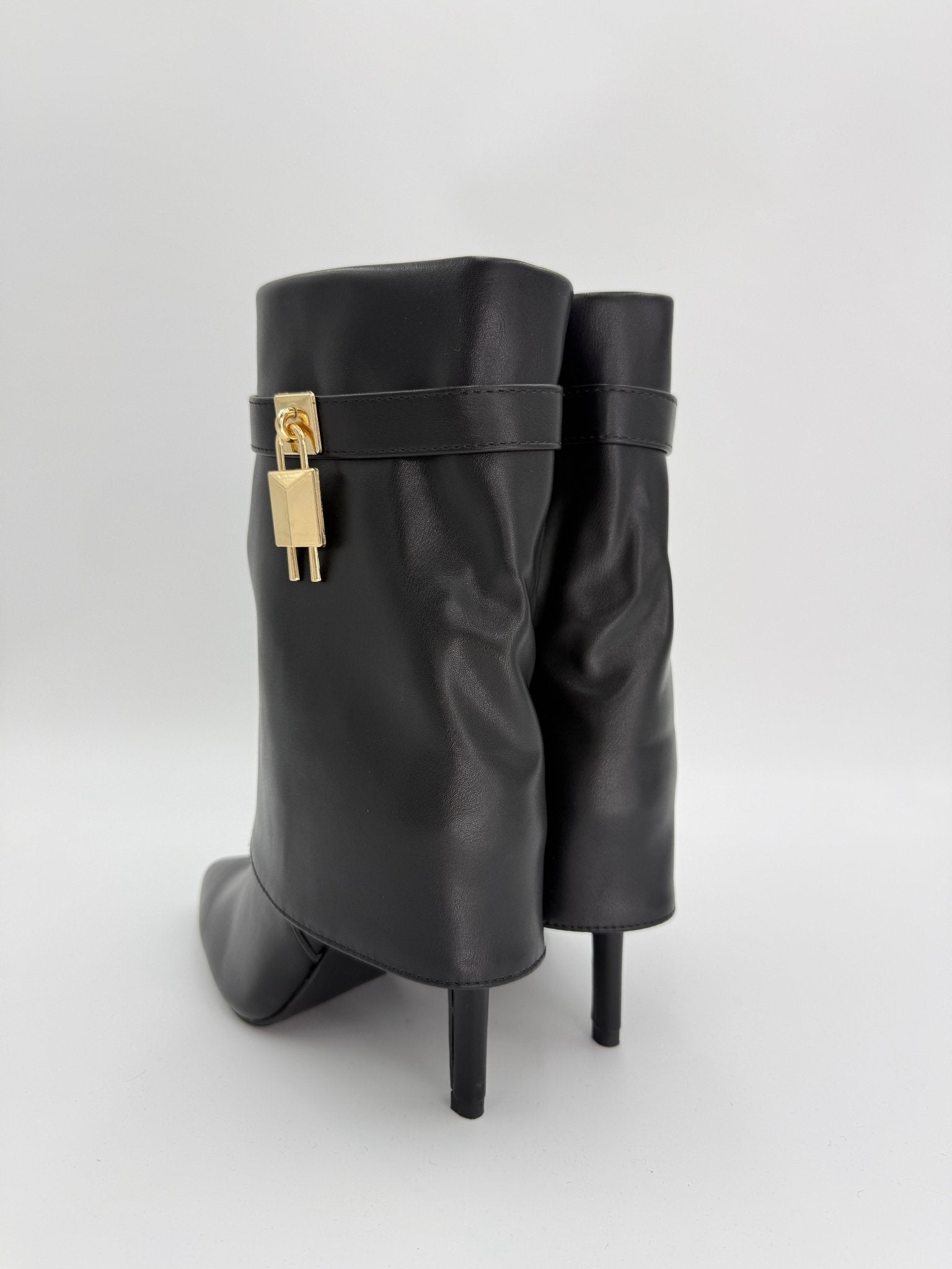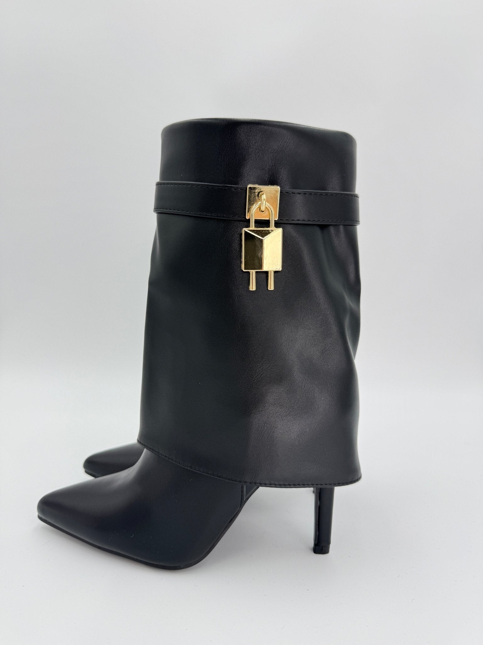 Elevate your footwear collection with these sophisticated black fold-over boots, crafted from premium faux leather for a luxurious finish. Featuring a striking pointed toe and commanding stiletto heel, they deliver both elegance and confidence. The distinctive padlock detail adds an unexpected edge, transforming these boots into a statement piece that seamlessly transitions from day to evening wear. Perfect for those who appreciate refined style with contemporary flair. Shark Boots.