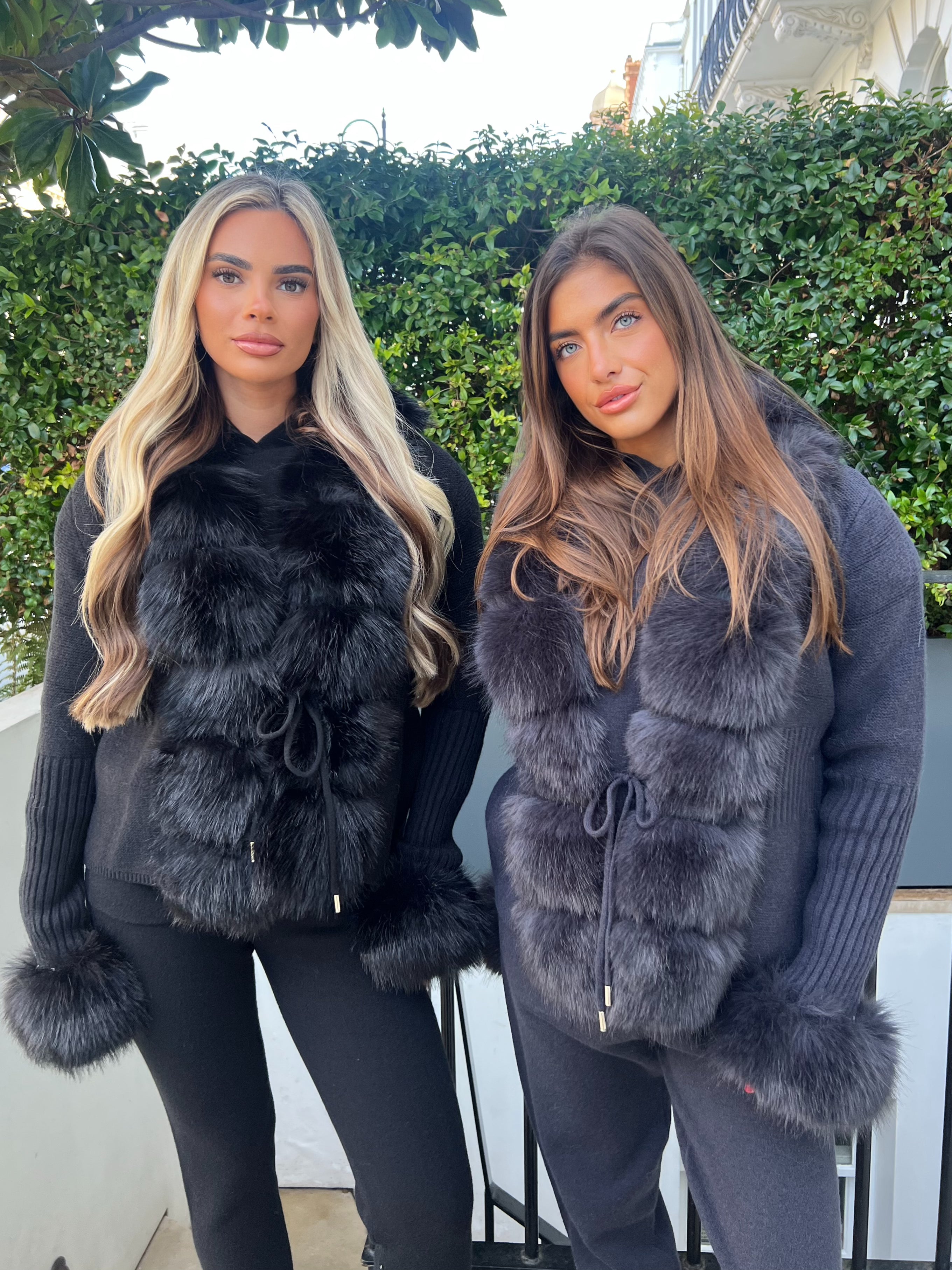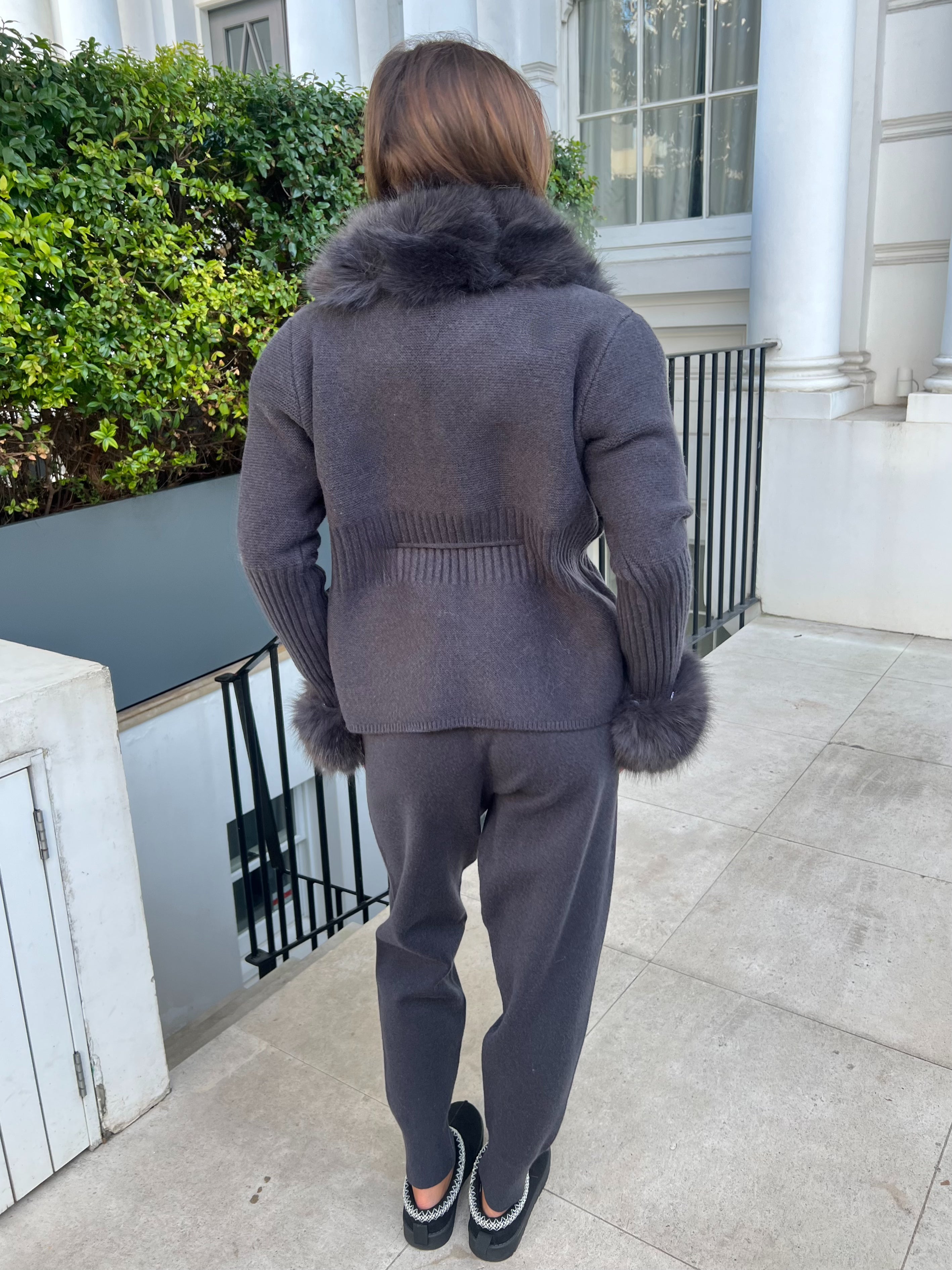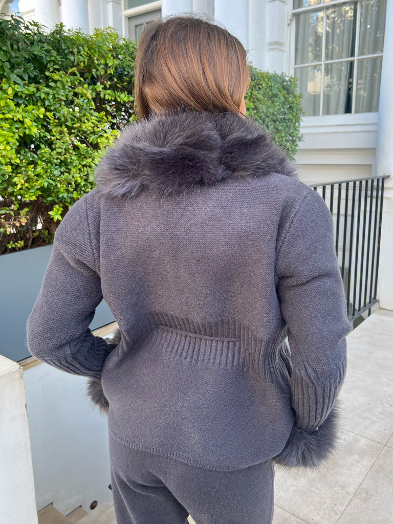 Anthrazitfarbener, hochwertiger Cardigan mit Kunstpelzbesatz