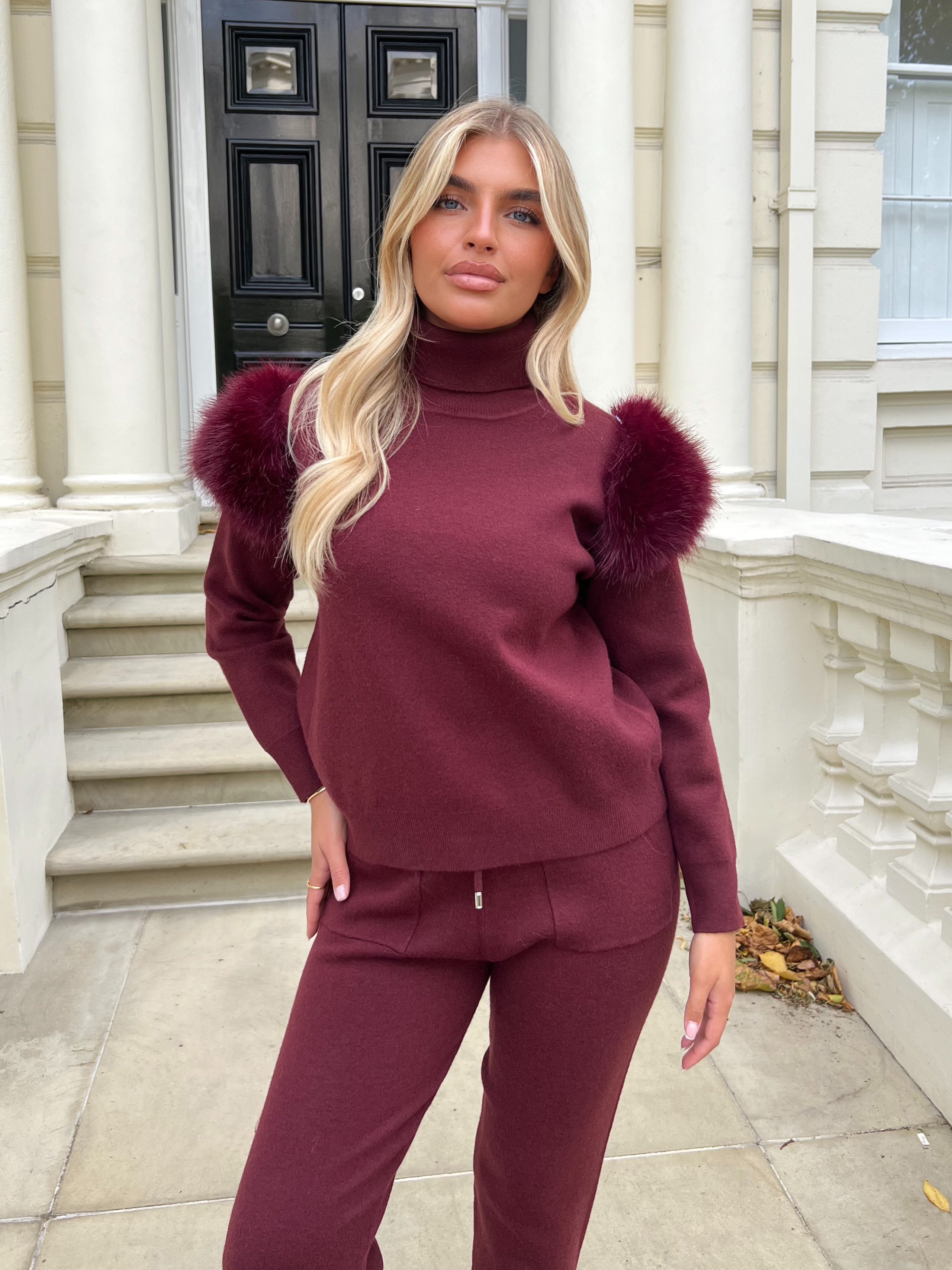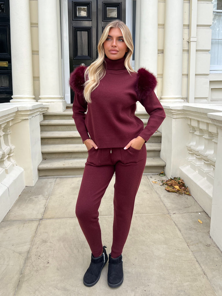 Burgundy Premium Faux Fur Roll Neck Jogger Tracksuit