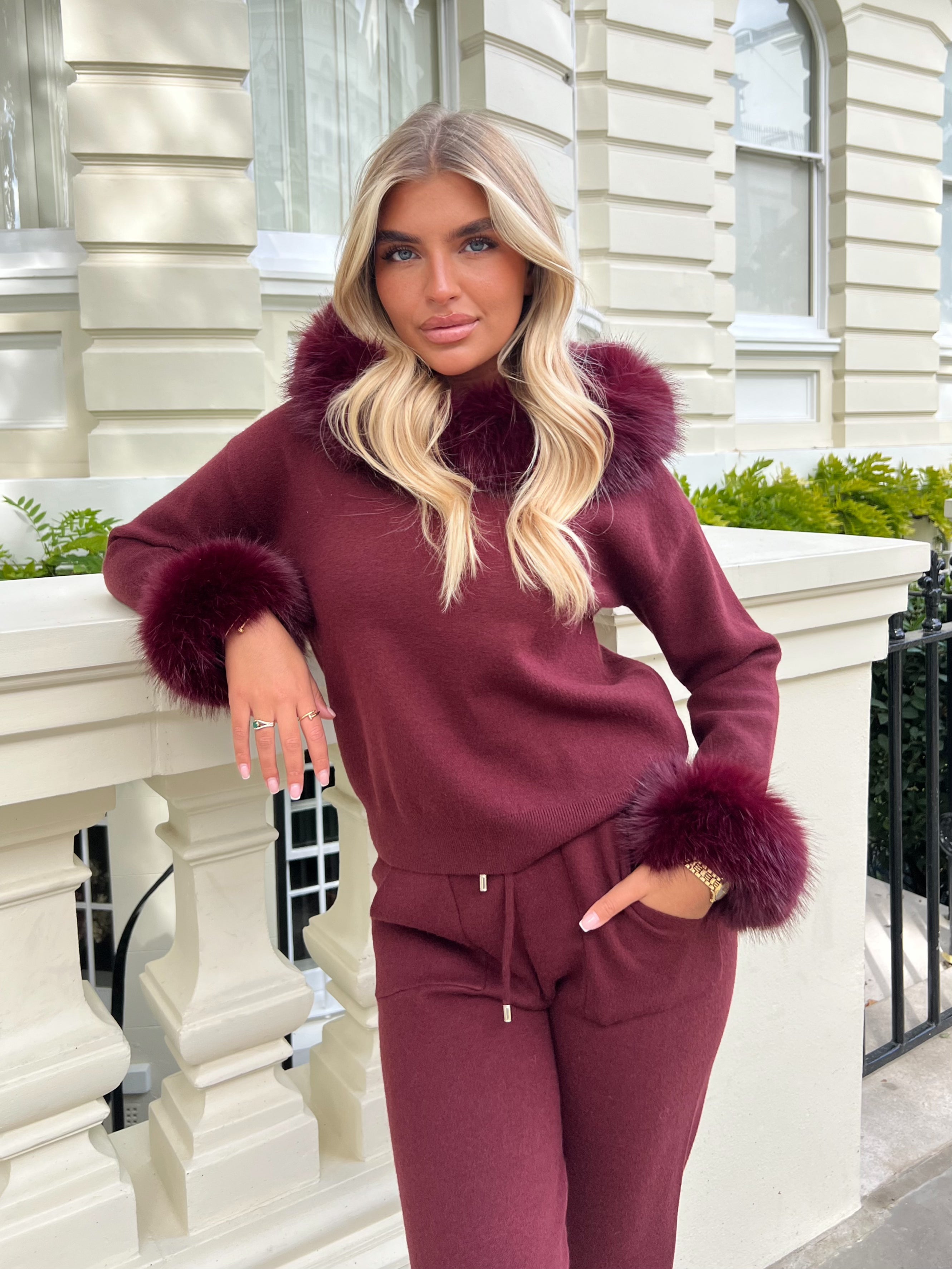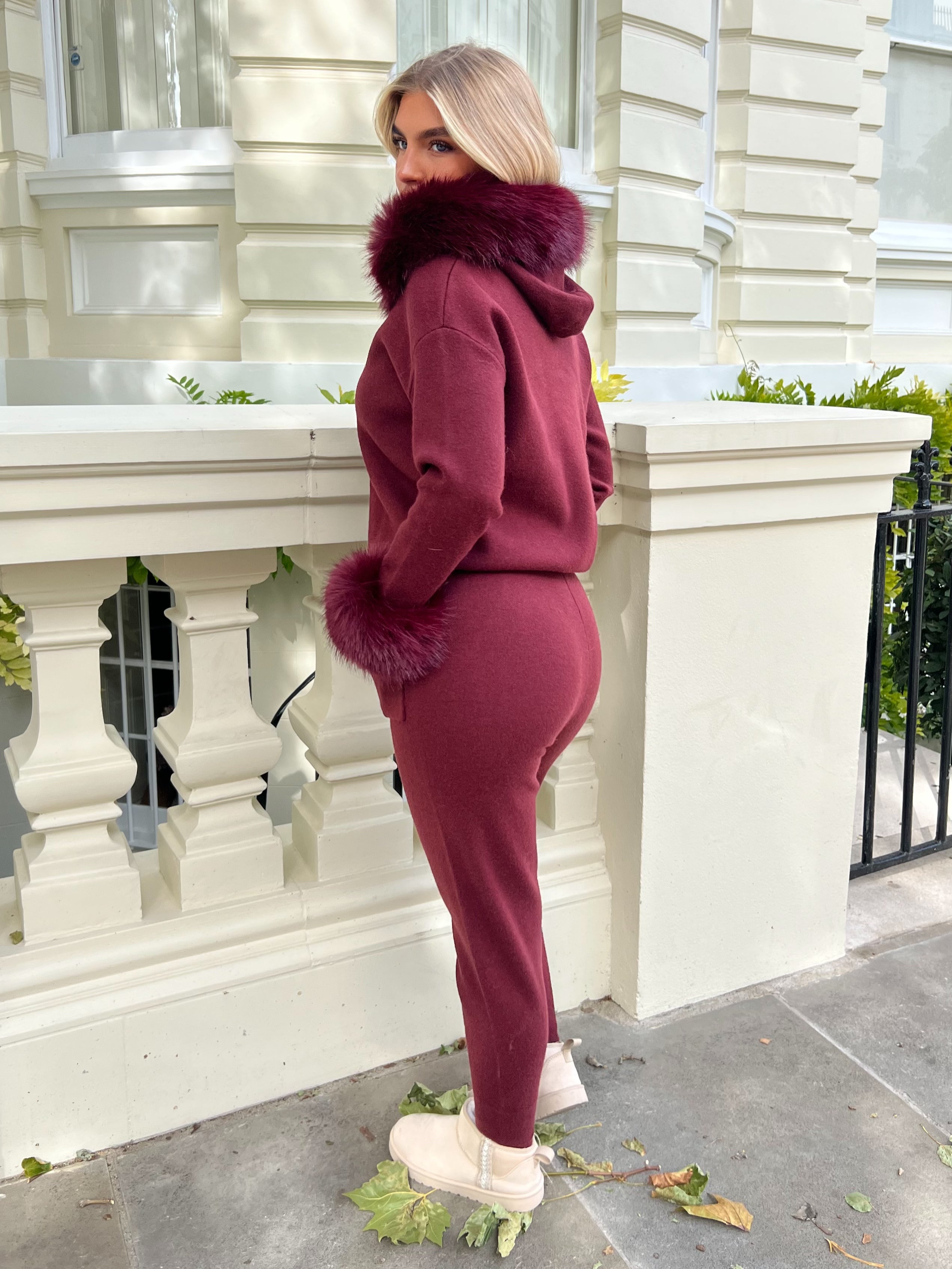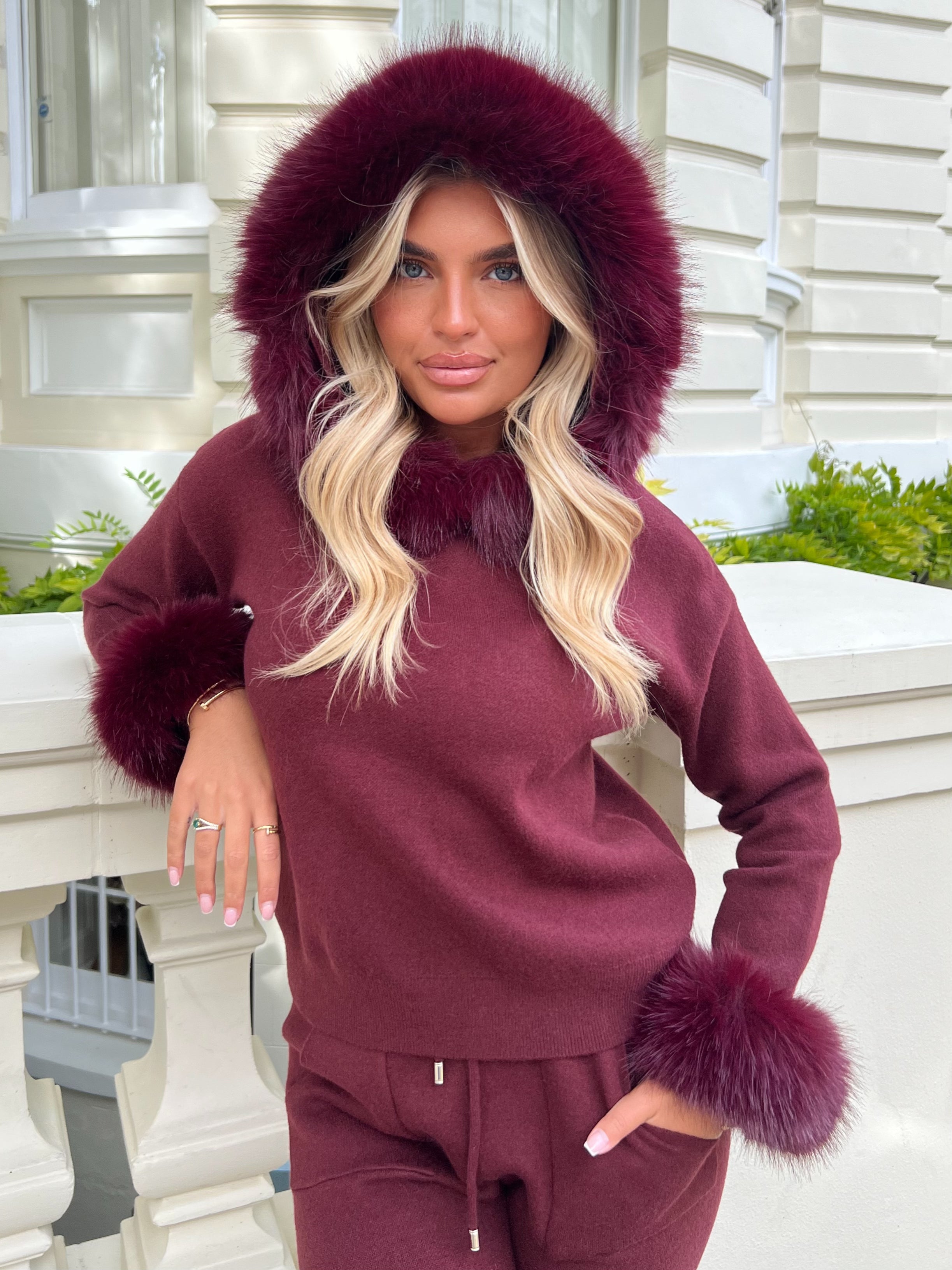 Burgundy Premium Faux Fur Hood & Cuff Jogger Tracksuit