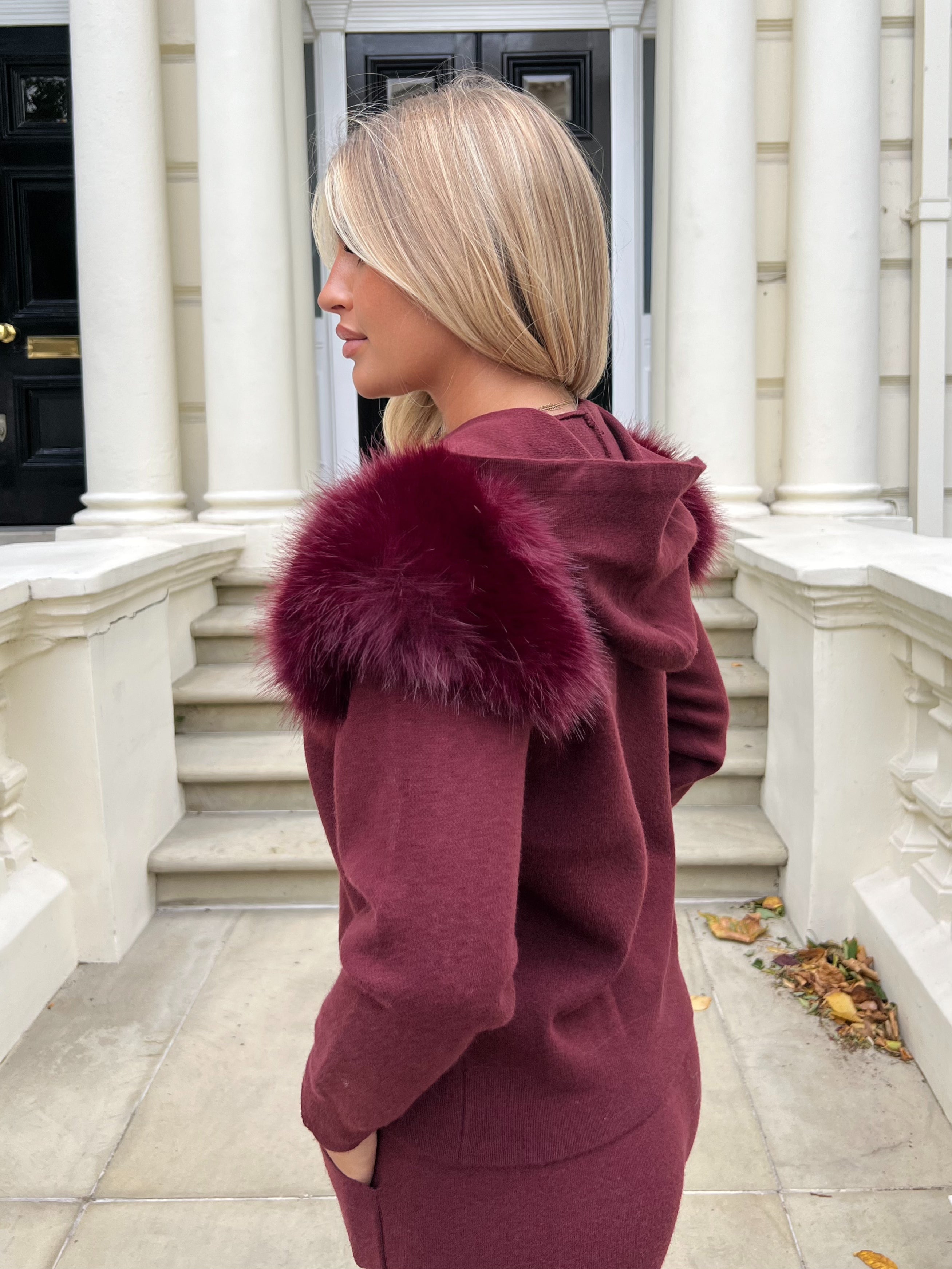 Burgundy Premium Faux Fur Hooded Jogger Tracksuit