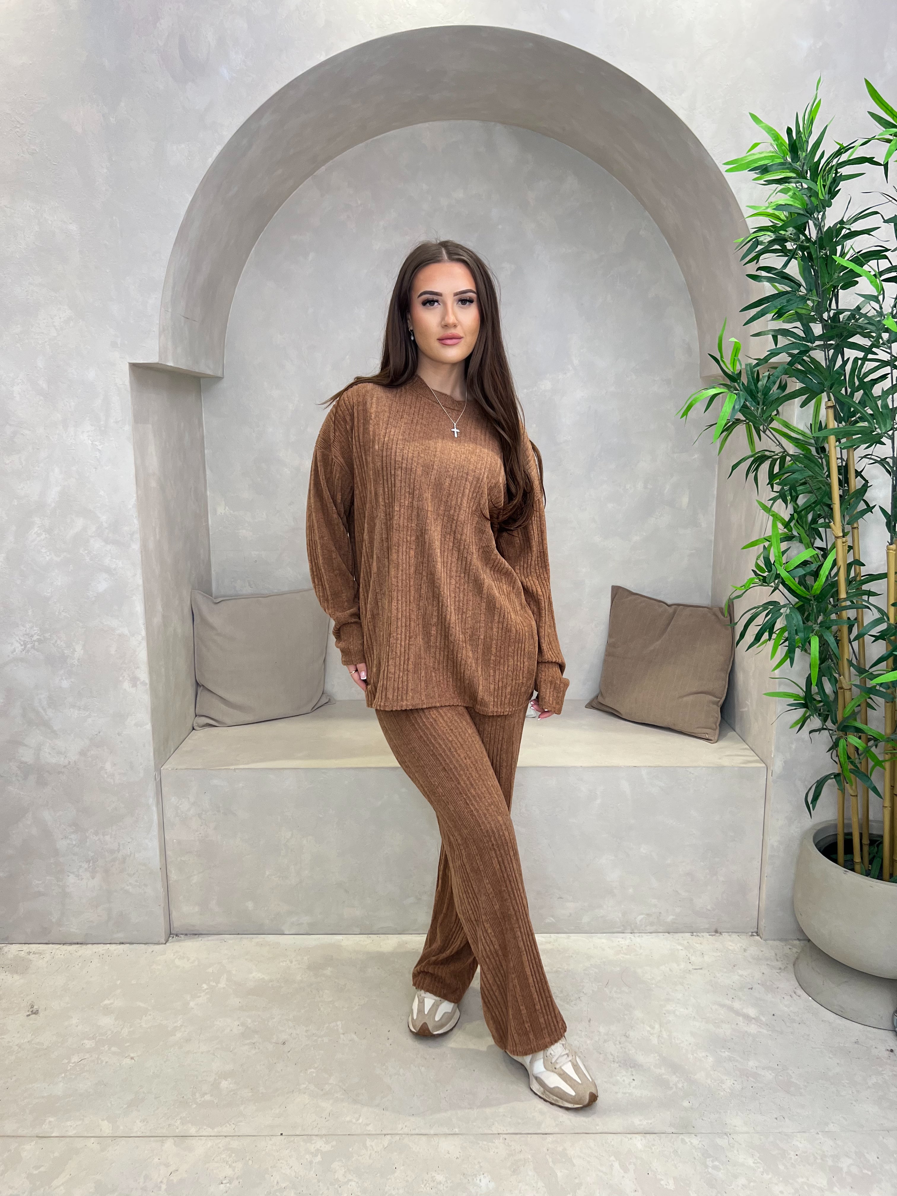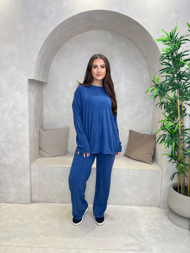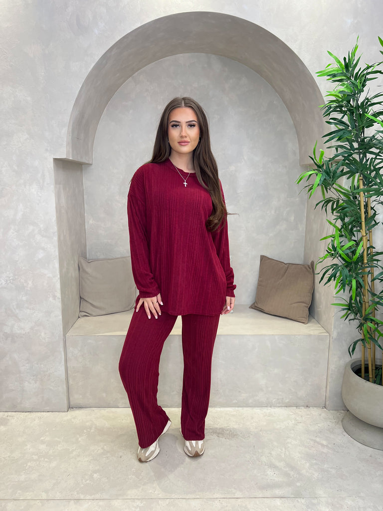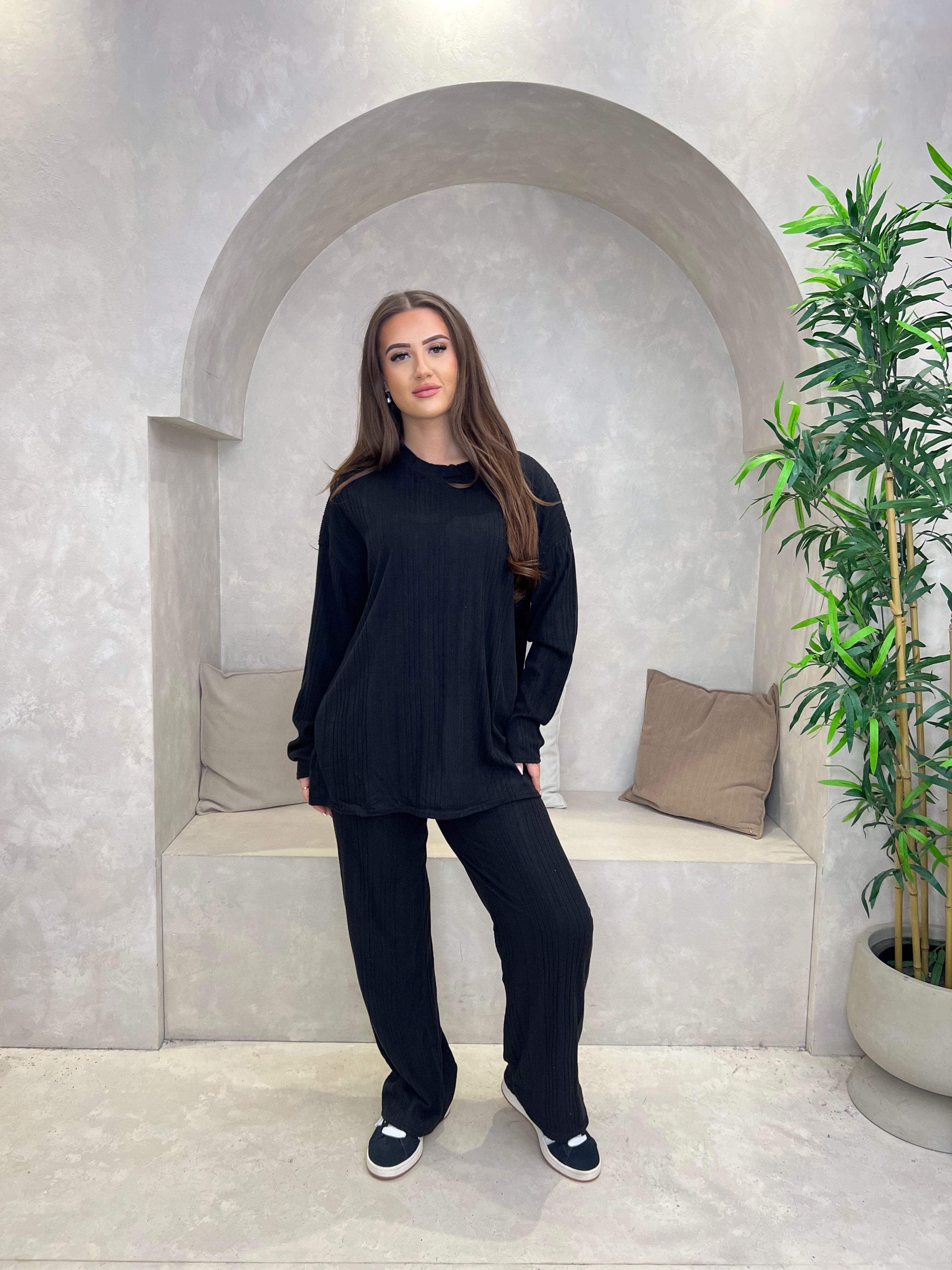 Bleiben Sie bequem und stilvoll in unserem gerippten Lounge-Set mit Rundhalsausschnitt. Der Rundhalsausschnitt und die gerippte Struktur sorgen für einen Hauch von Raffinesse, während das weite Bein für ultimativen Komfort sorgt. Perfekt zum stilvollen Entspannen.