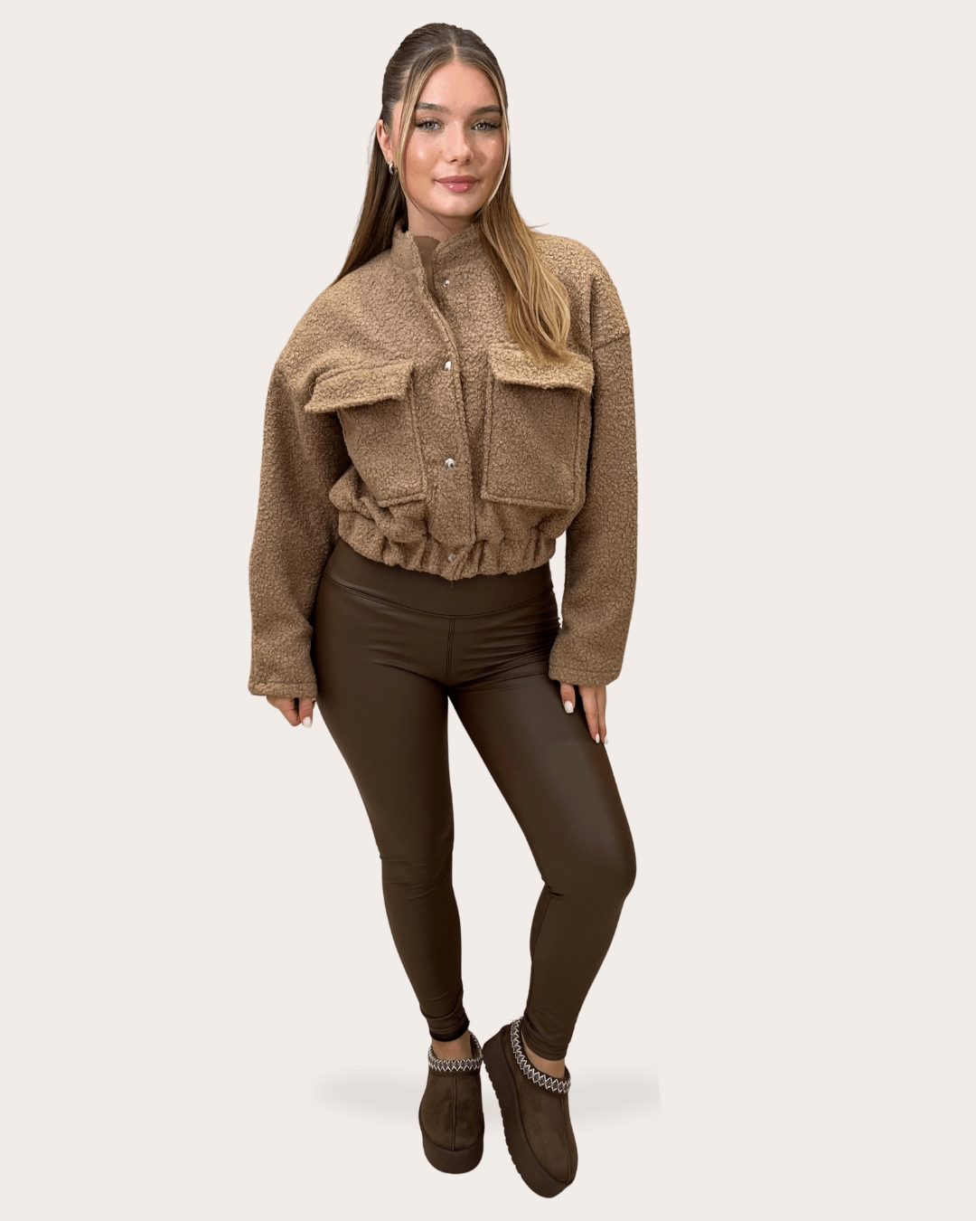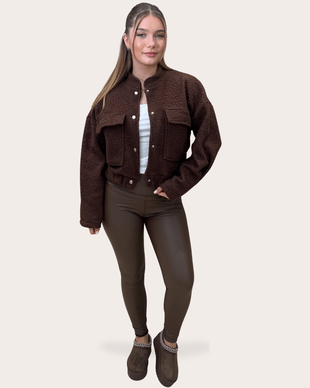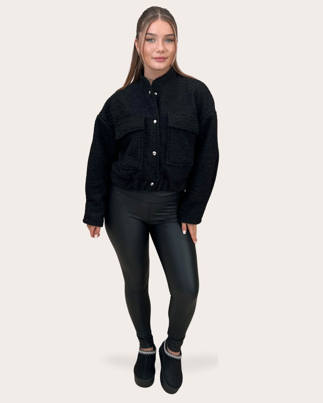 This Teddy Bomber Jacket features a classic popper fastening and a sleek stand-up collar for a modern look. Designed with a secure boucle texture, it includes two practical pockets to keep essentials close at hand. The elasticated hem ensures a comfortable fit, while long sleeves provide added warmth and versatility, making it an ideal layering piece for transitional weather.