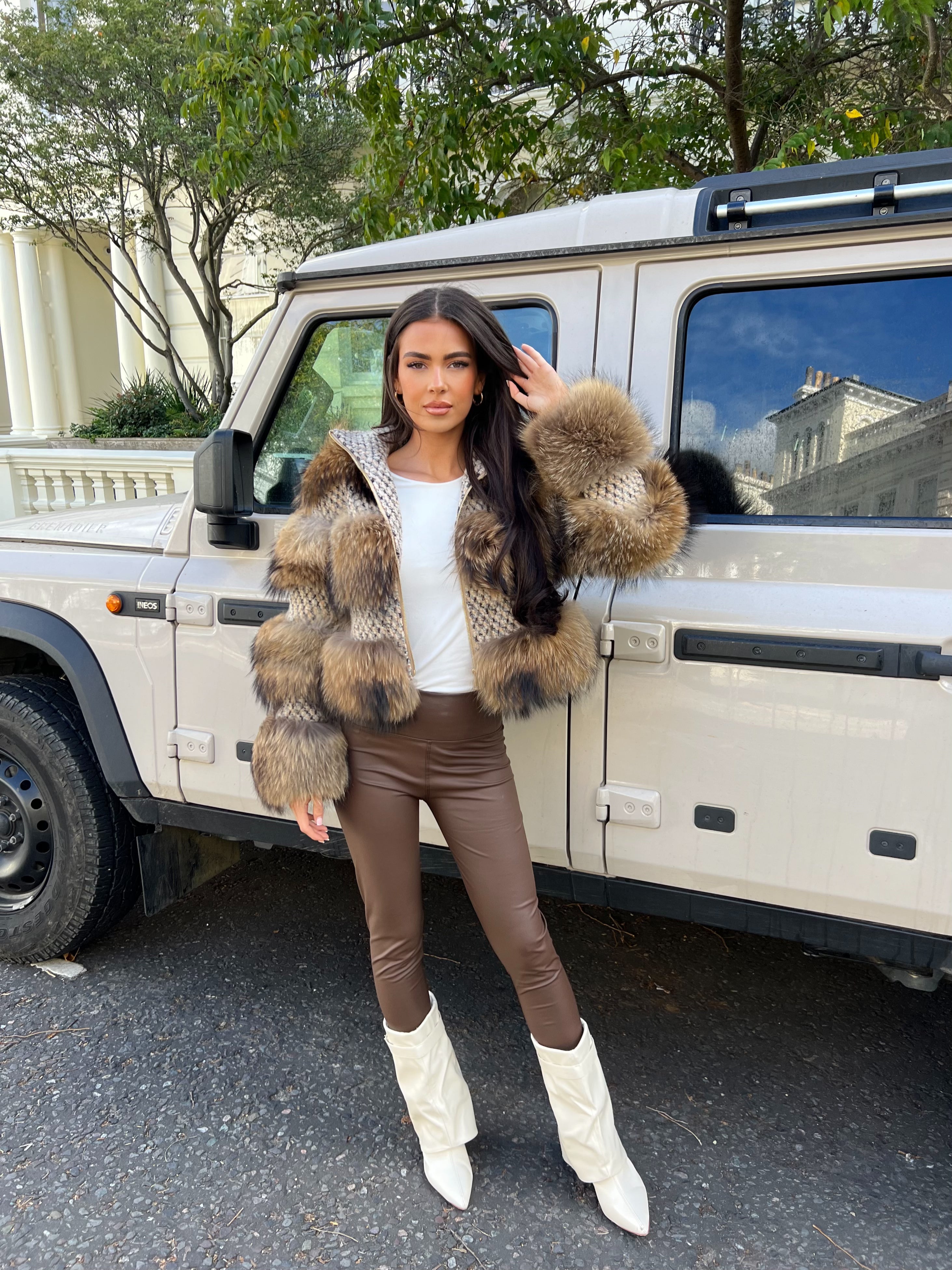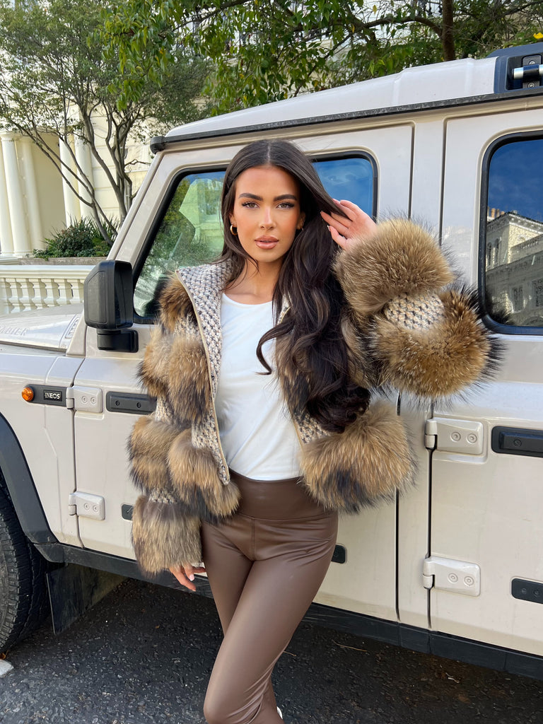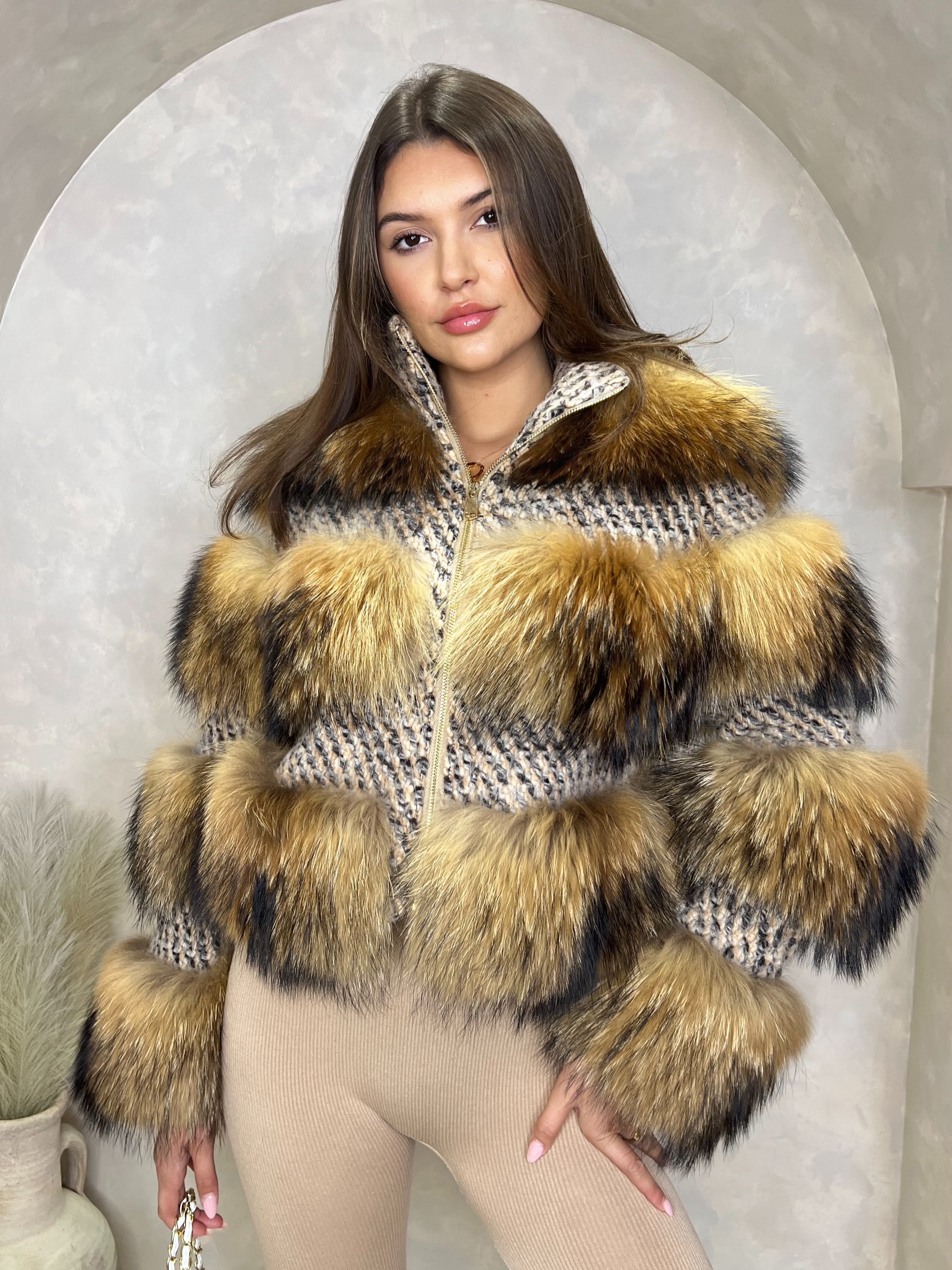 Diese natürliche Luxuspelzjacke verfügt über einen goldenen Reißverschluss und elegante gewebte Einsätze, ergänzt durch einen Stehkragen für einen stilvollen Touch. Diese aus drei Reihen Waschbärfell gefertigte Jacke bietet sowohl Wärme als auch Luxus. Werten Sie Ihre Garderobe mit diesem hochwertigen, zeitlosen Stück auf.