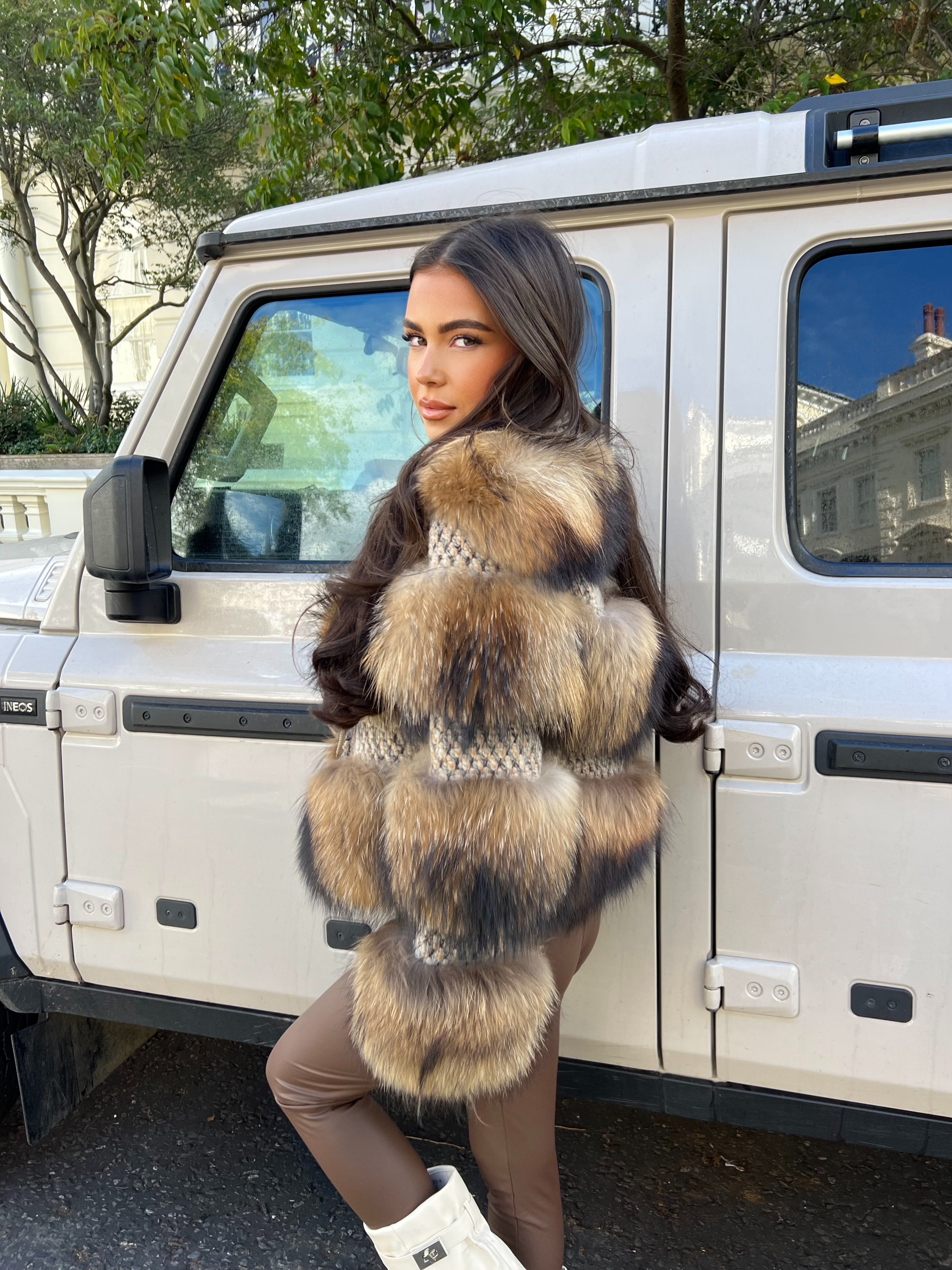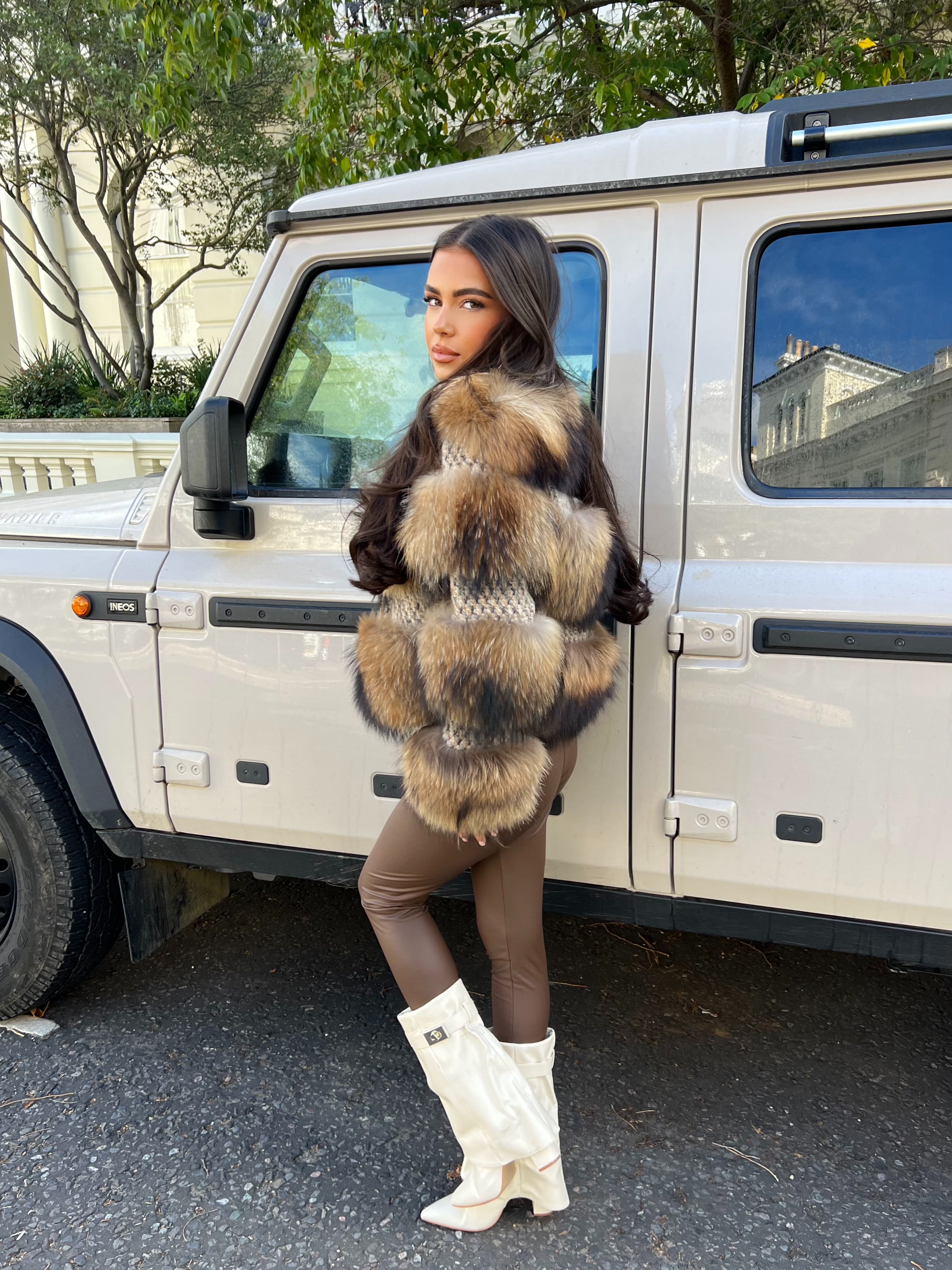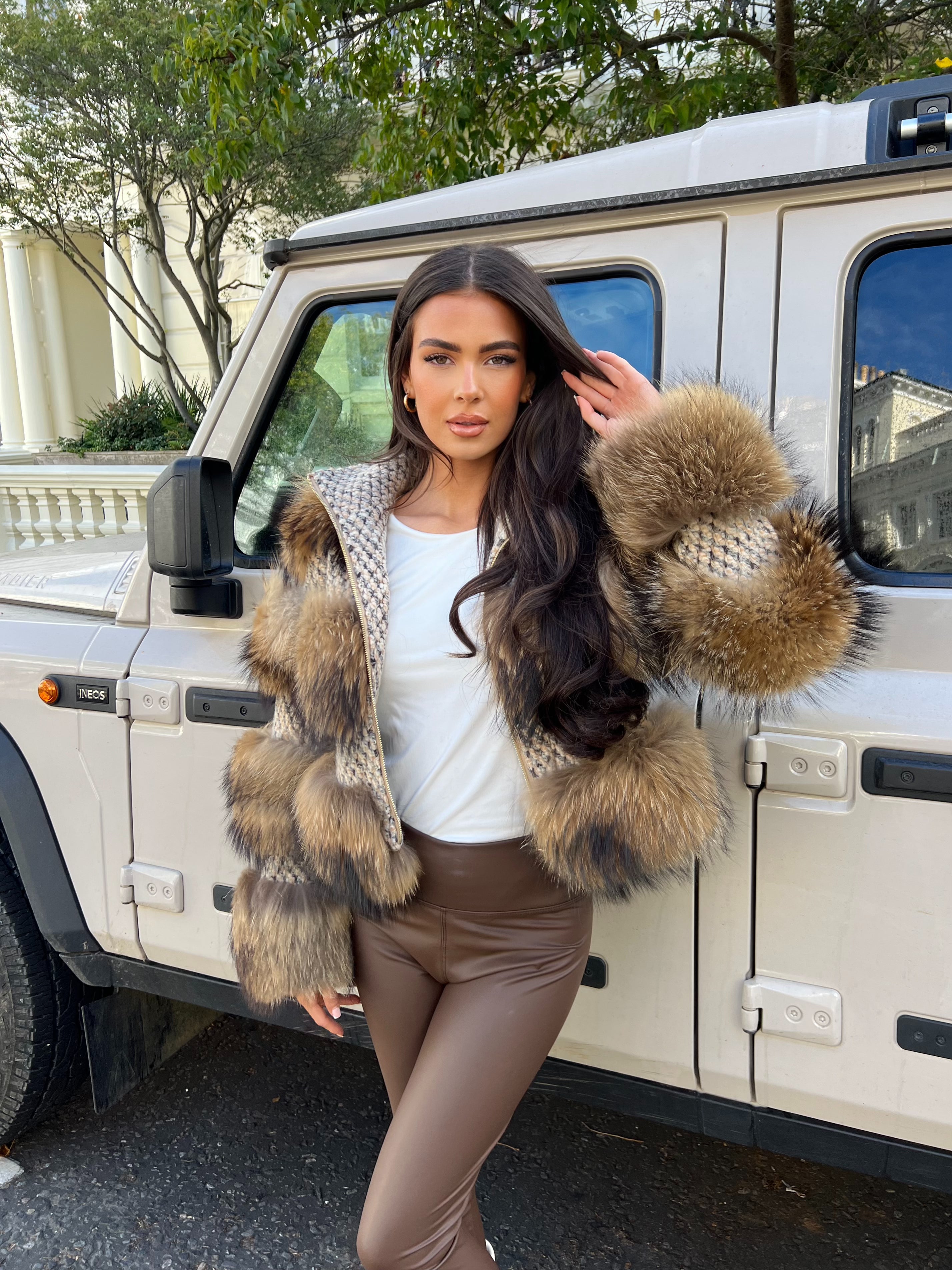 Diese natürliche Luxuspelzjacke verfügt über einen goldenen Reißverschluss und elegante gewebte Einsätze, ergänzt durch einen Stehkragen für einen stilvollen Touch. Diese aus drei Reihen Waschbärfell gefertigte Jacke bietet sowohl Wärme als auch Luxus. Werten Sie Ihre Garderobe mit diesem hochwertigen, zeitlosen Stück auf.
