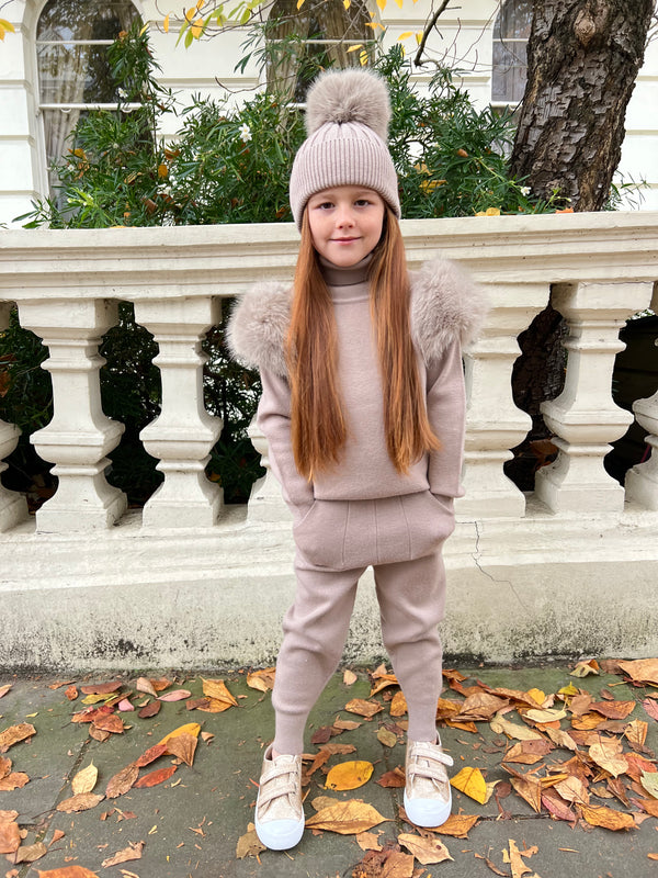 Childrens Beige Premium Faux Fur Hood & Cuff Jogger Tracksuit