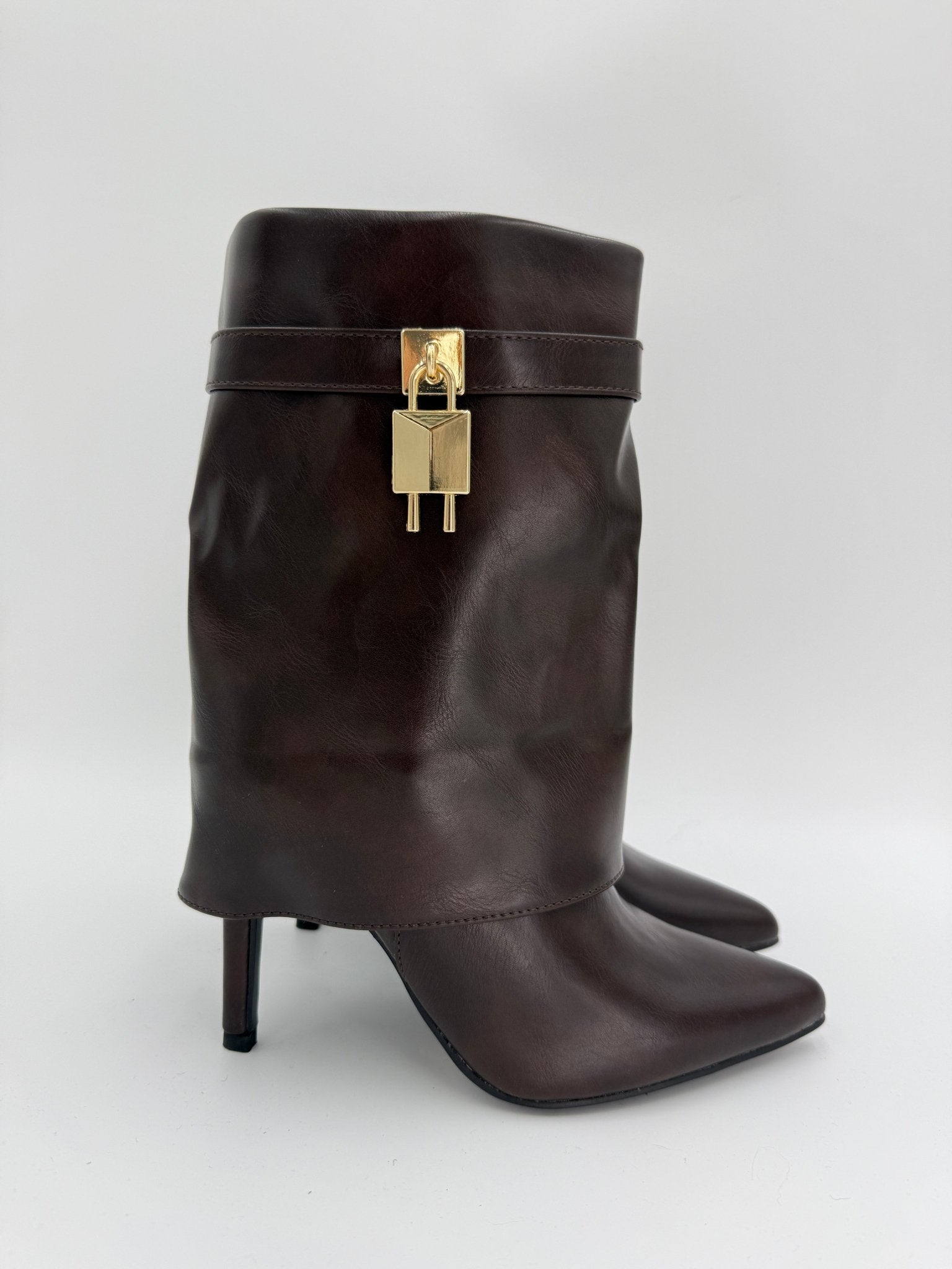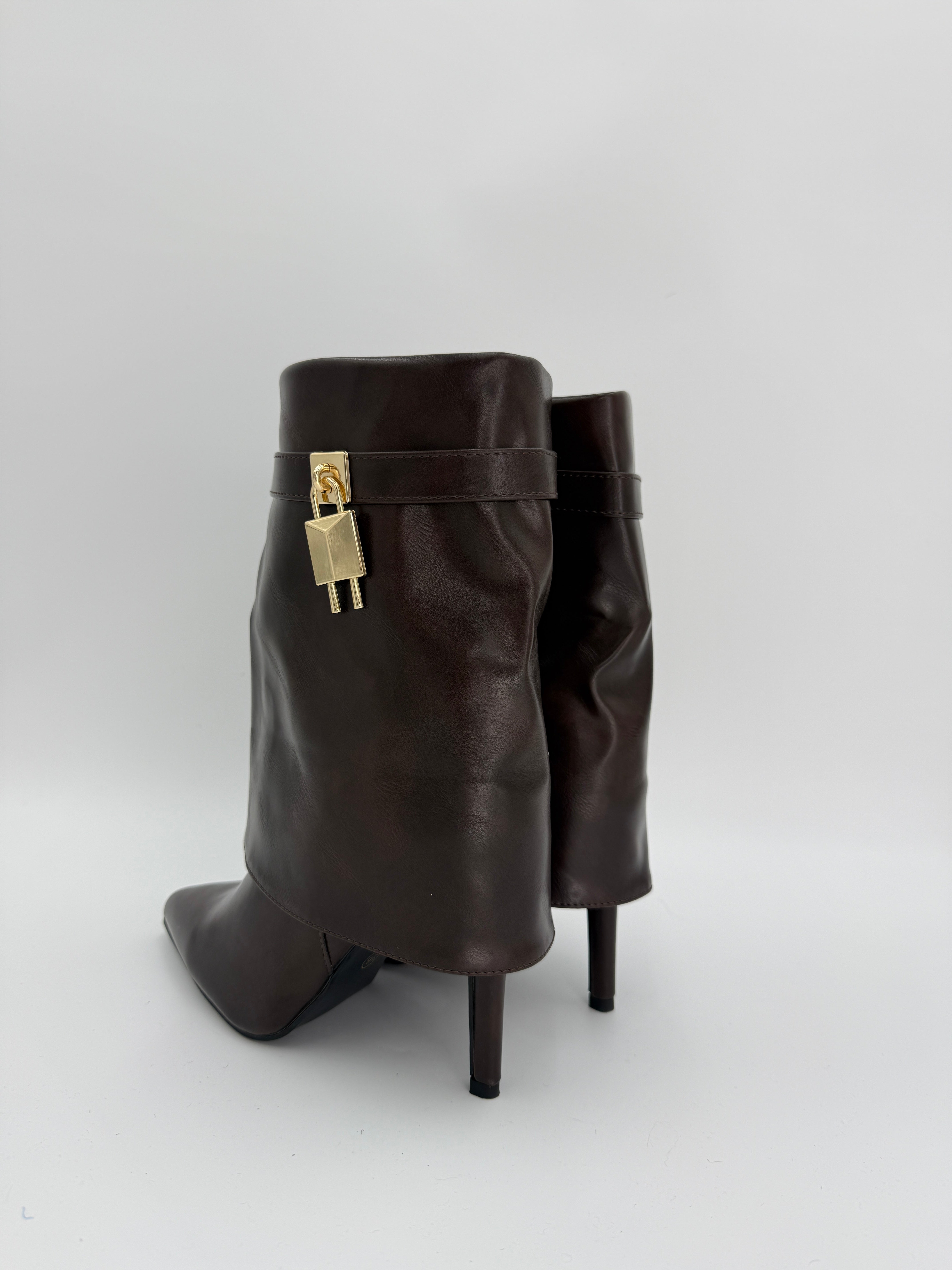 Elevate your footwear collection with these sophisticated black fold-over boots, crafted from premium faux leather for a luxurious finish. Featuring a striking pointed toe and commanding stiletto heel, they deliver both elegance and confidence. The distinctive padlock detail adds an unexpected edge, transforming these boots into a statement piece that seamlessly transitions from day to evening wear. Perfect for those who appreciate refined style with contemporary flair. Shark Boots.