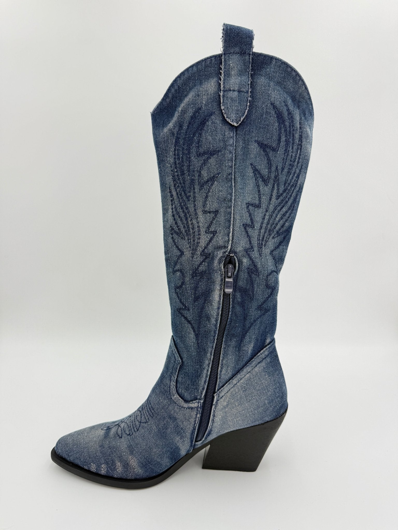 Dark Denim Cowgirl Boots combine rugged Western style with contemporary edge. Crafted from premium denim material, these boots feature a distinctive 3/4 zip for easy on-and-off wear and adjustable fit. Intricate embroidery detailing adds character, while the classic pointed toe delivers authentic cowboy aesthetics. Practical pull tabs ensure effortless dressing. Perfect for festival season or everyday statement-making, these boots merge tradition with modern versatility.