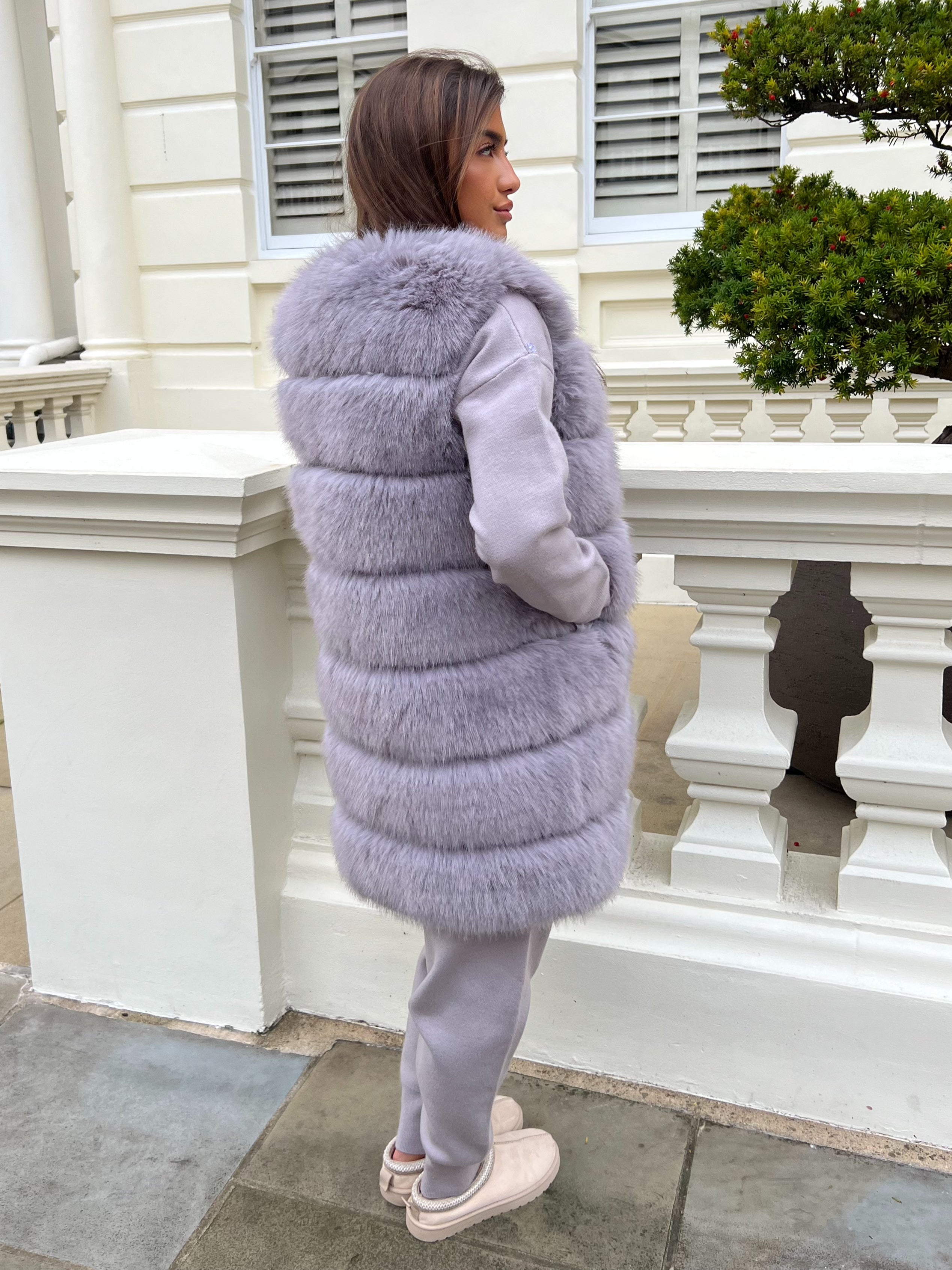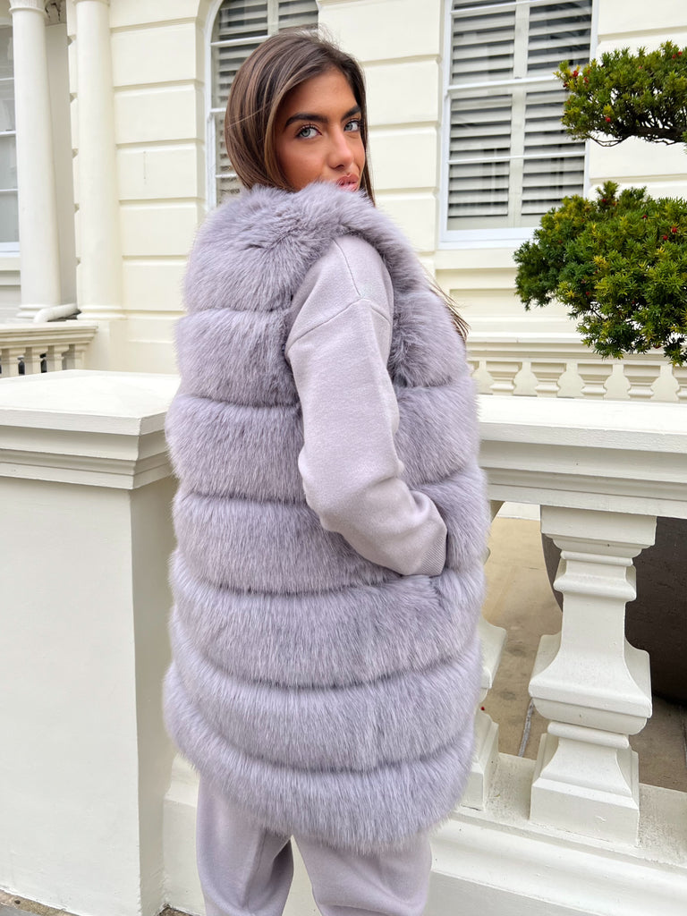 Hellgraue Premium-Longline-Weste aus Kunstfell