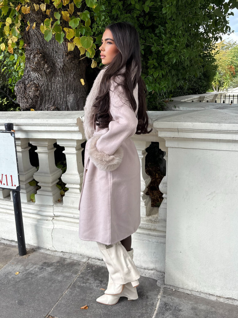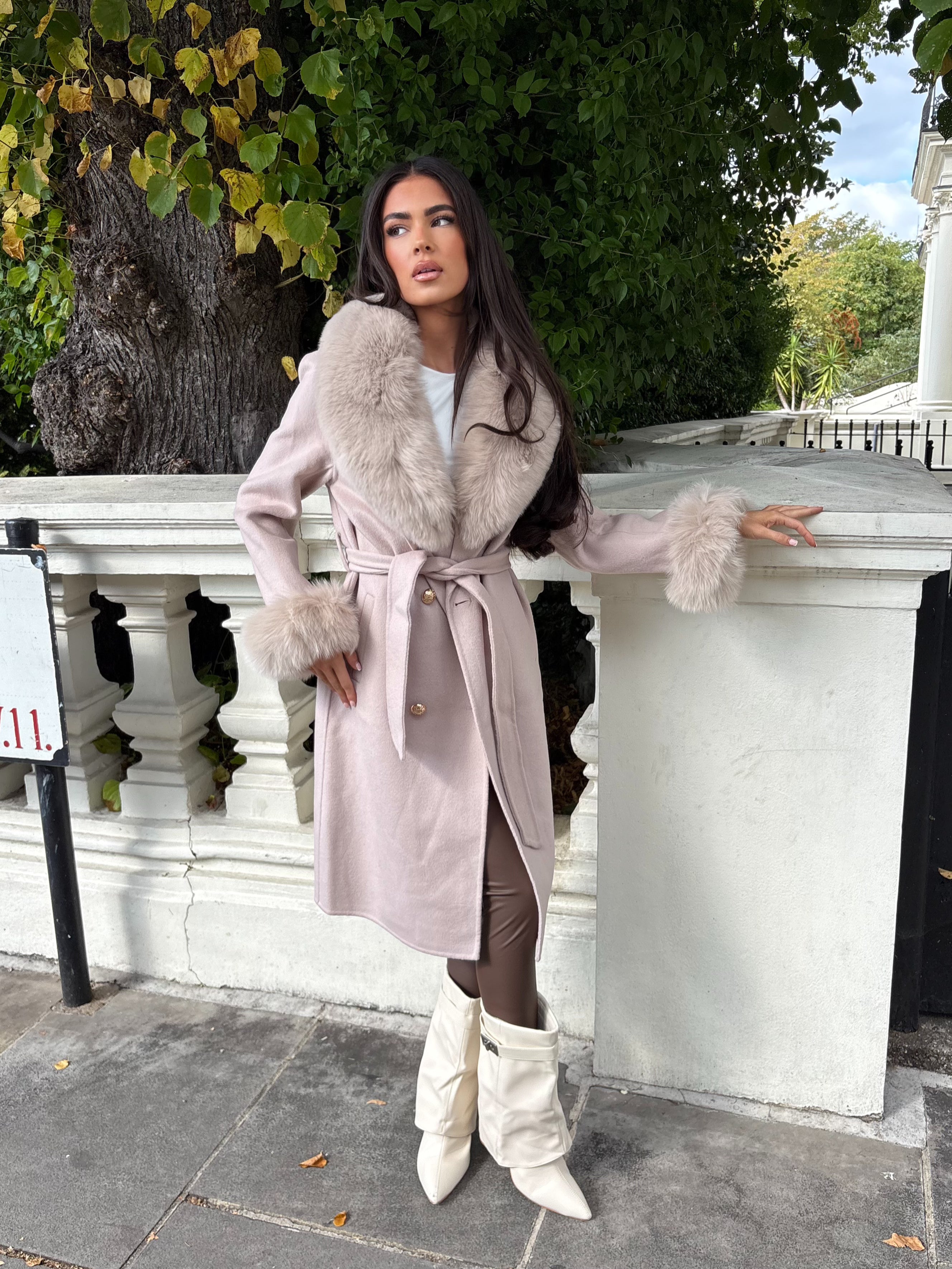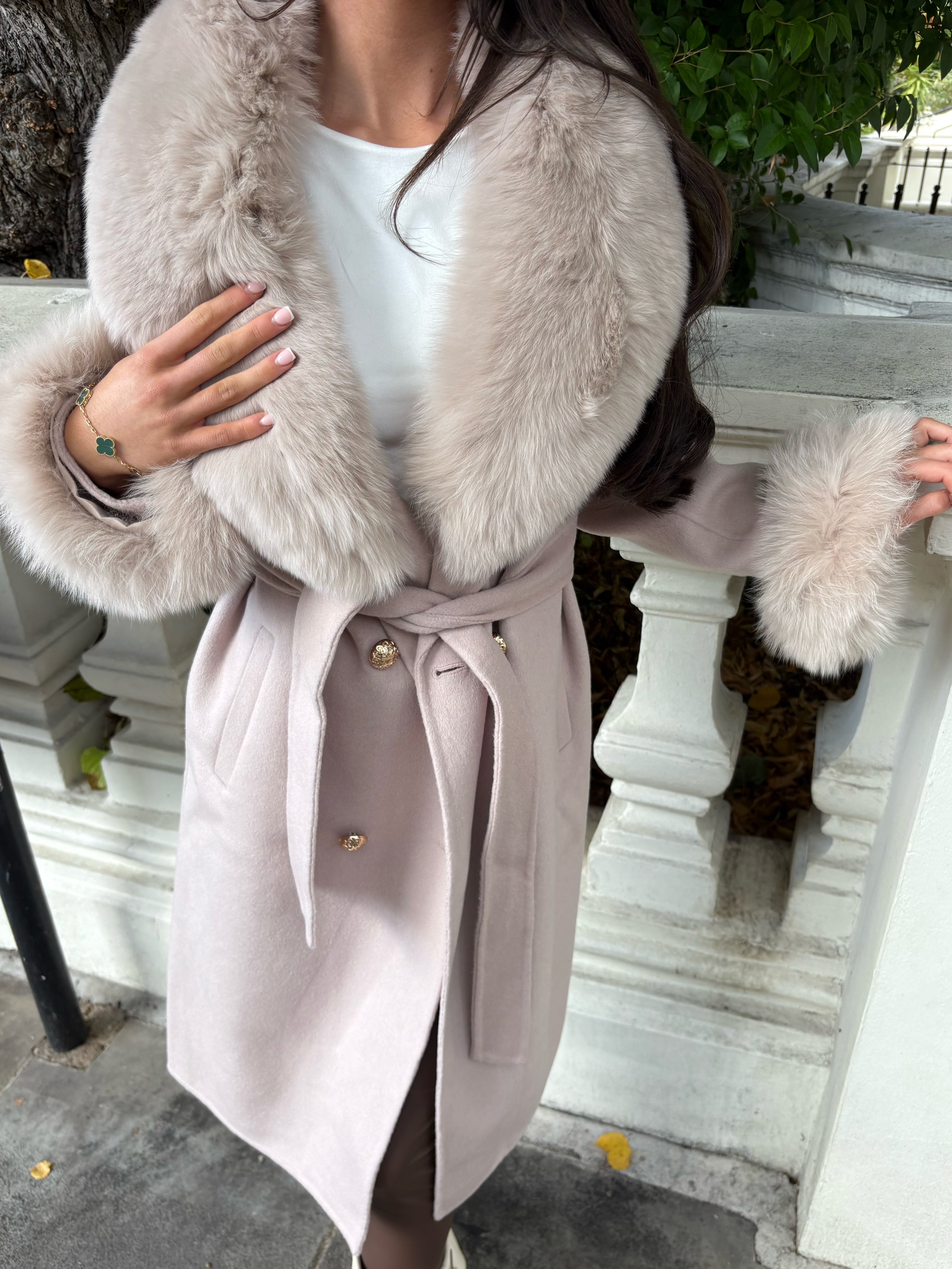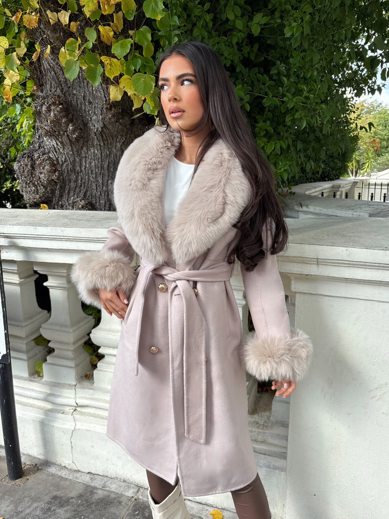 Wie umwerfend ist unser Luxuspelz-Kaschmirmantel – der Mantel, den Sie diesen Winter brauchen. Mit luxuriösem Pelzbesatz und -manschetten sowie einem Taillengürtel, der Ihnen Form verleiht. Kombinieren Sie es mit einem Winterlook, um eine gemütliche und dennoch schicke Atmosphäre zu schaffen.