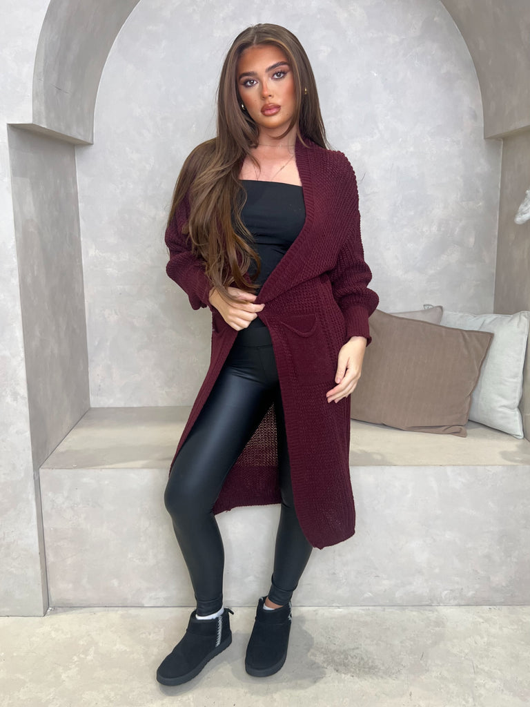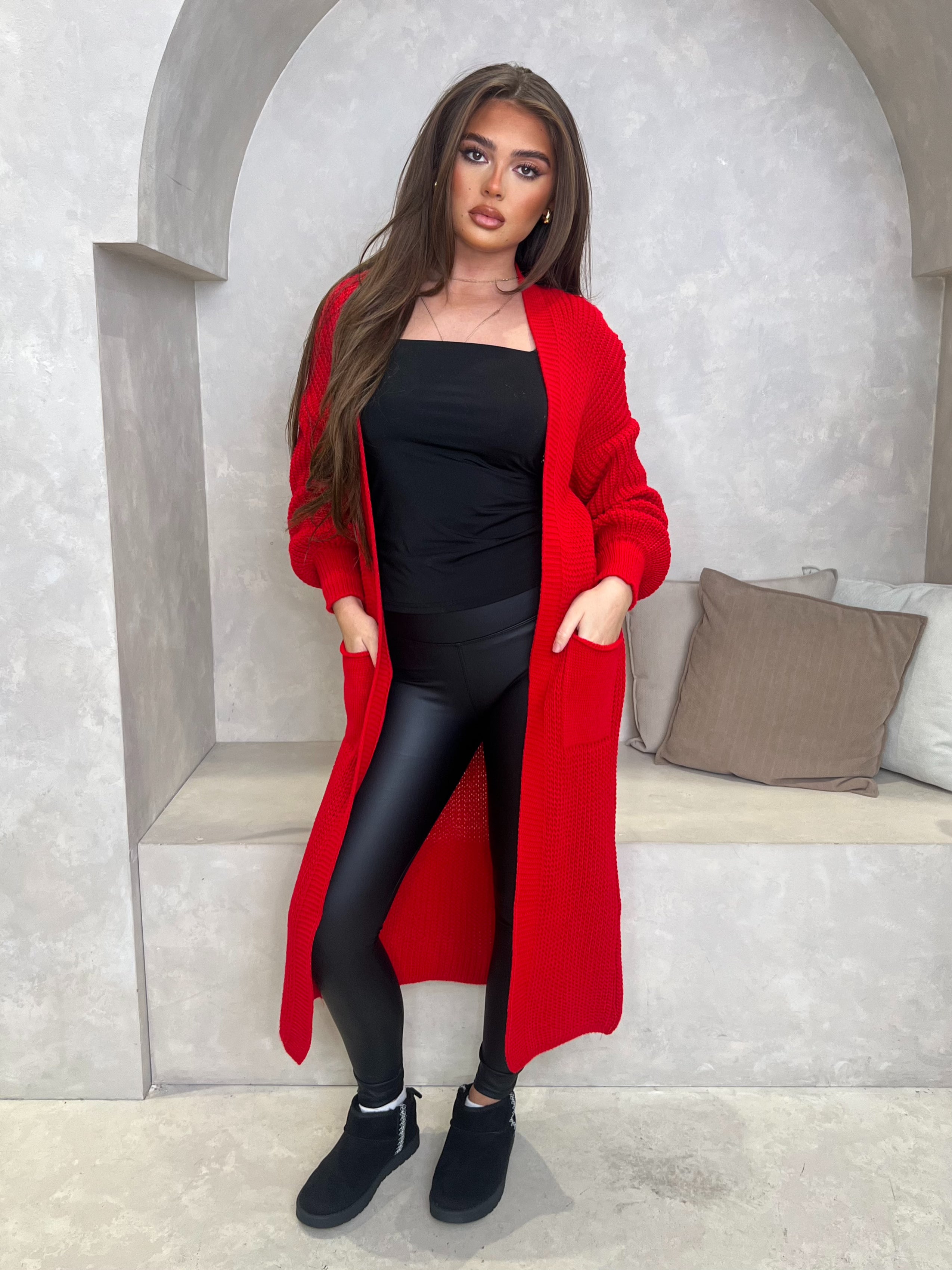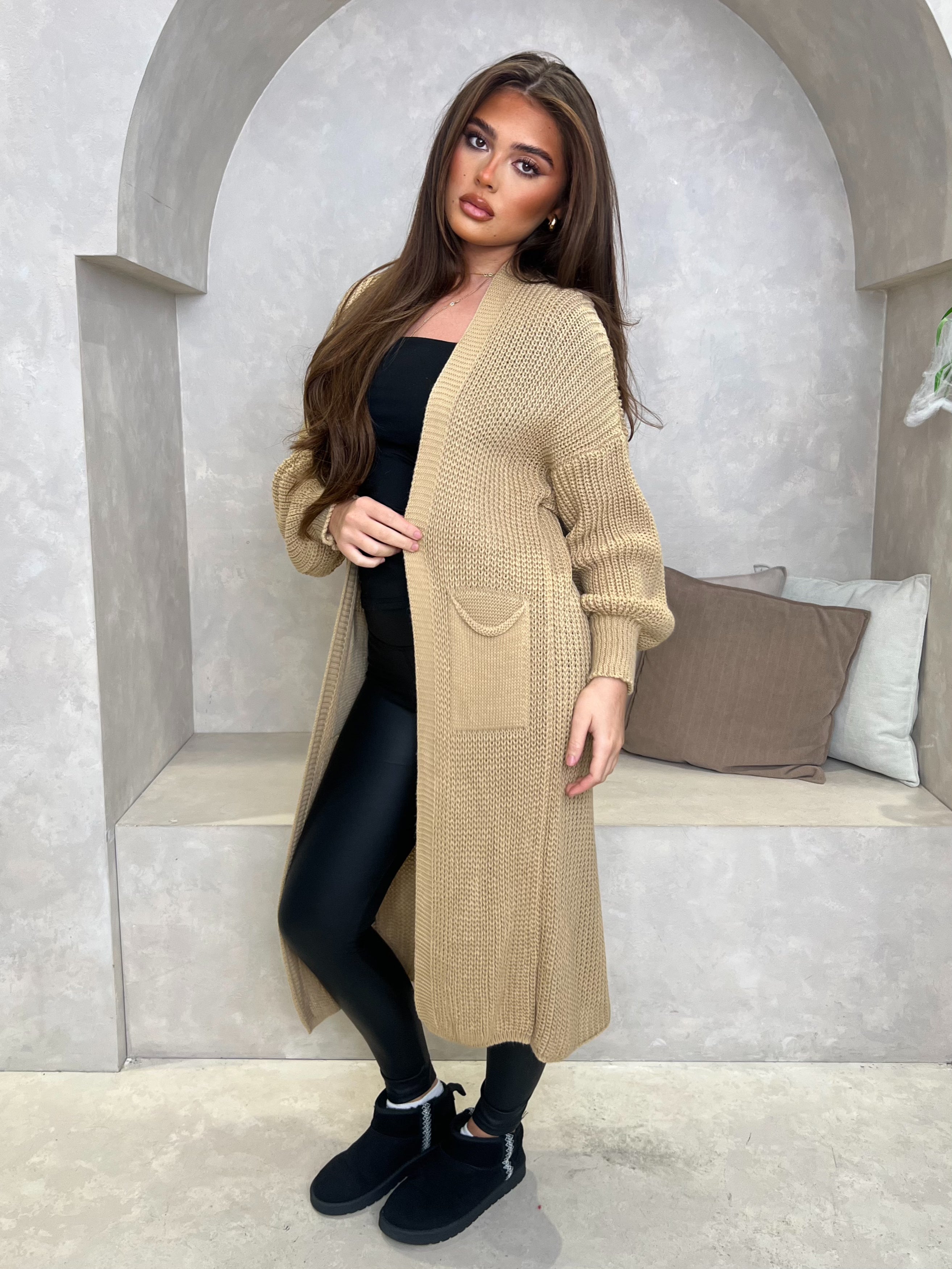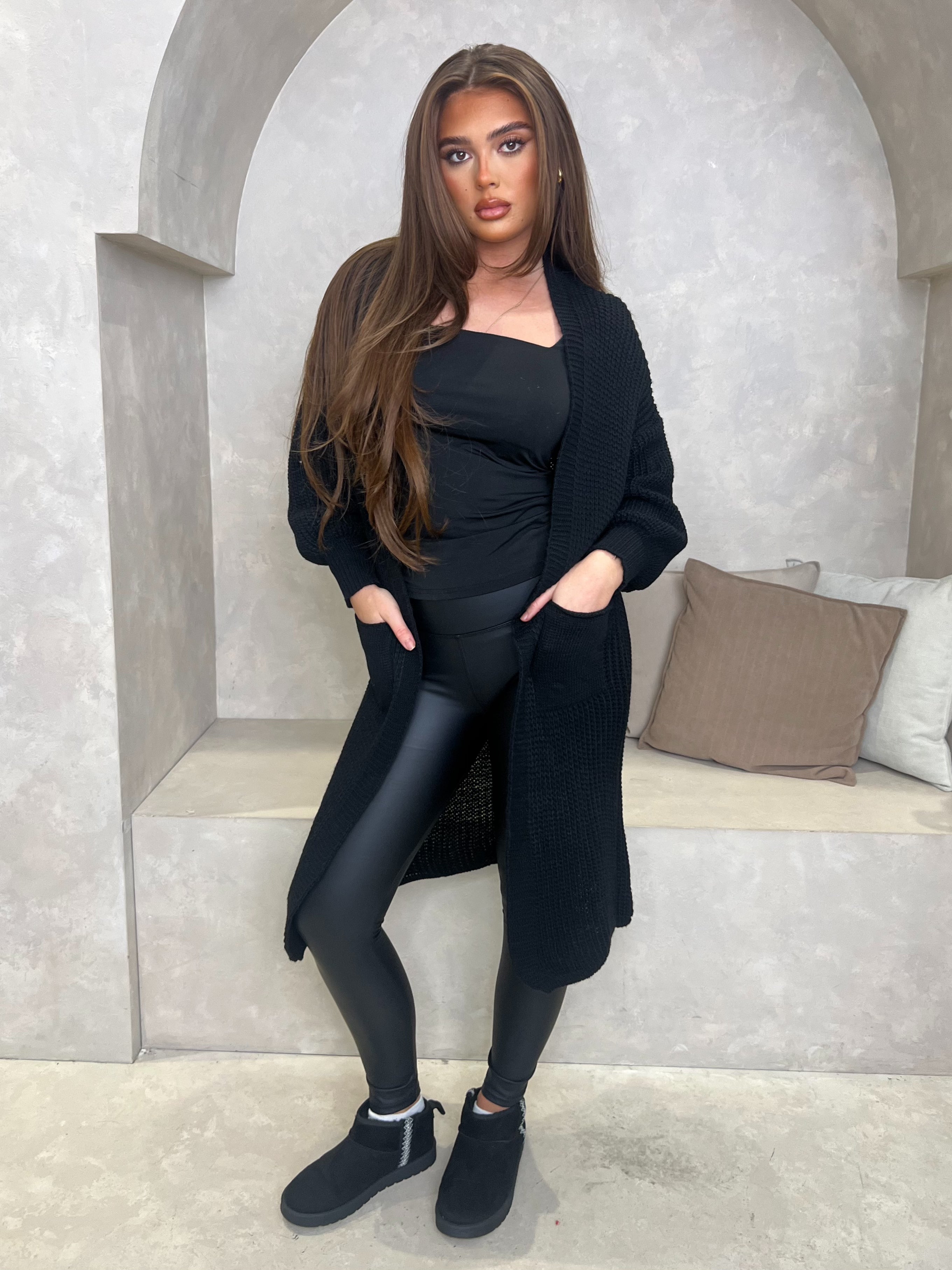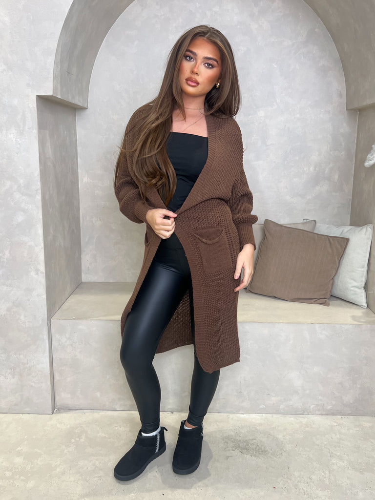 Ce cardigan long en tricot est votre essentiel pour la saison automne-hiver. Portez-le avec nos leggings en similicuir et notre body à col bas pour un look décontracté au quotidien. Nous avons associé ce look à des baskets. Taille unique pour une taille UK 36-48.