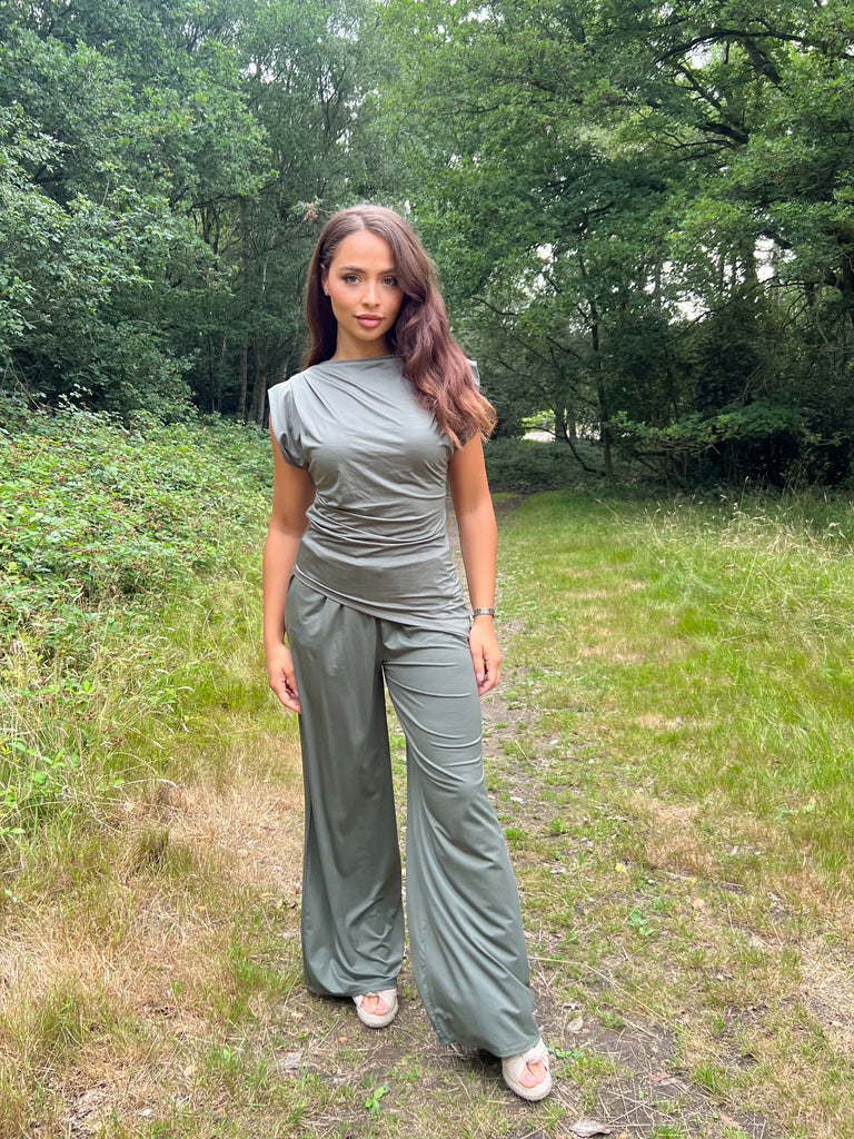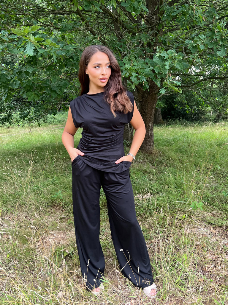 Ensemble de gym bleu côtelé sans couture à manches courtes et ourlet plongeant