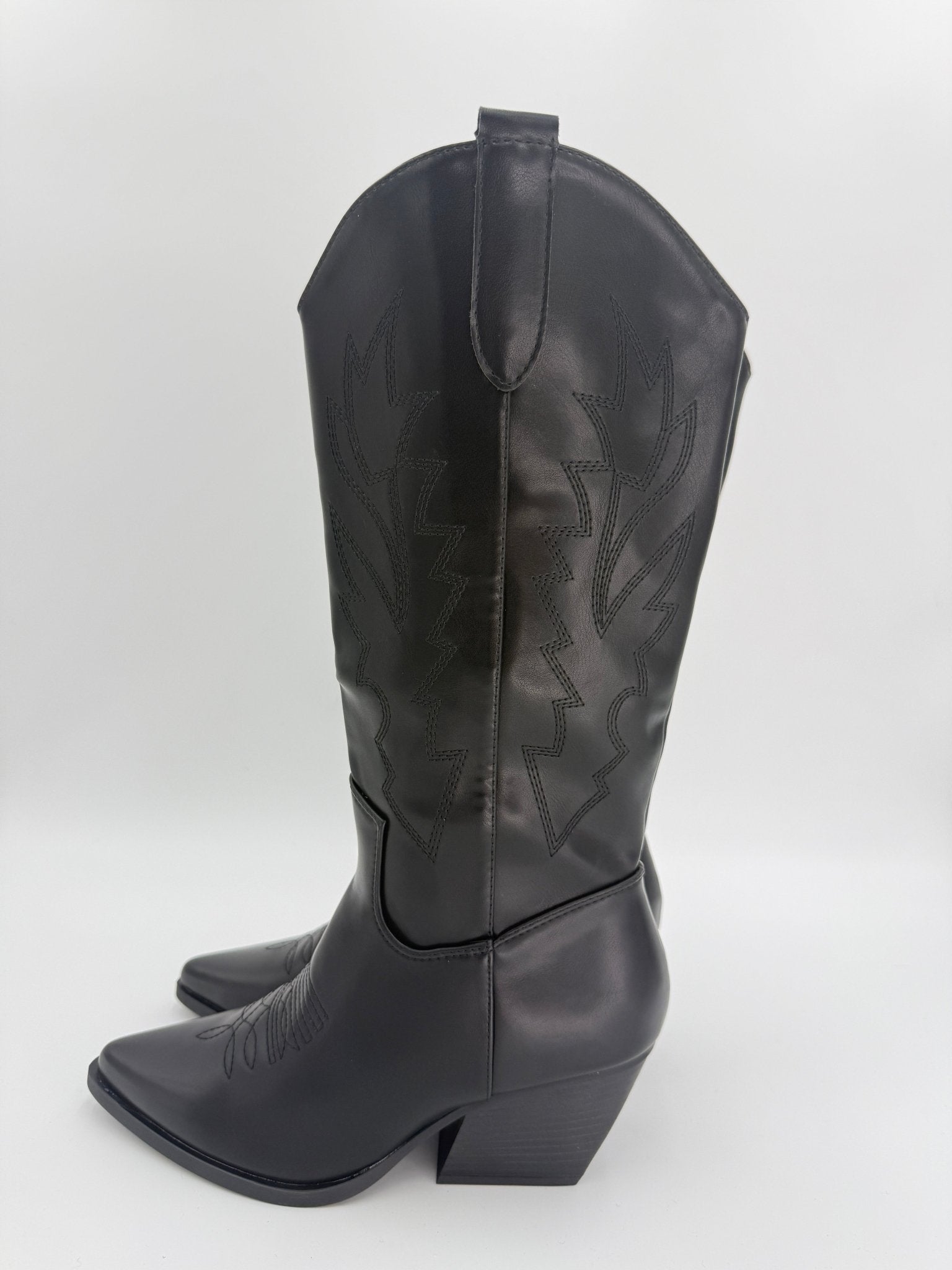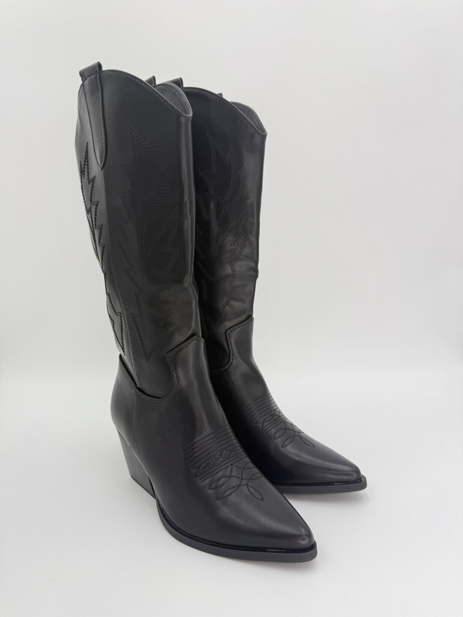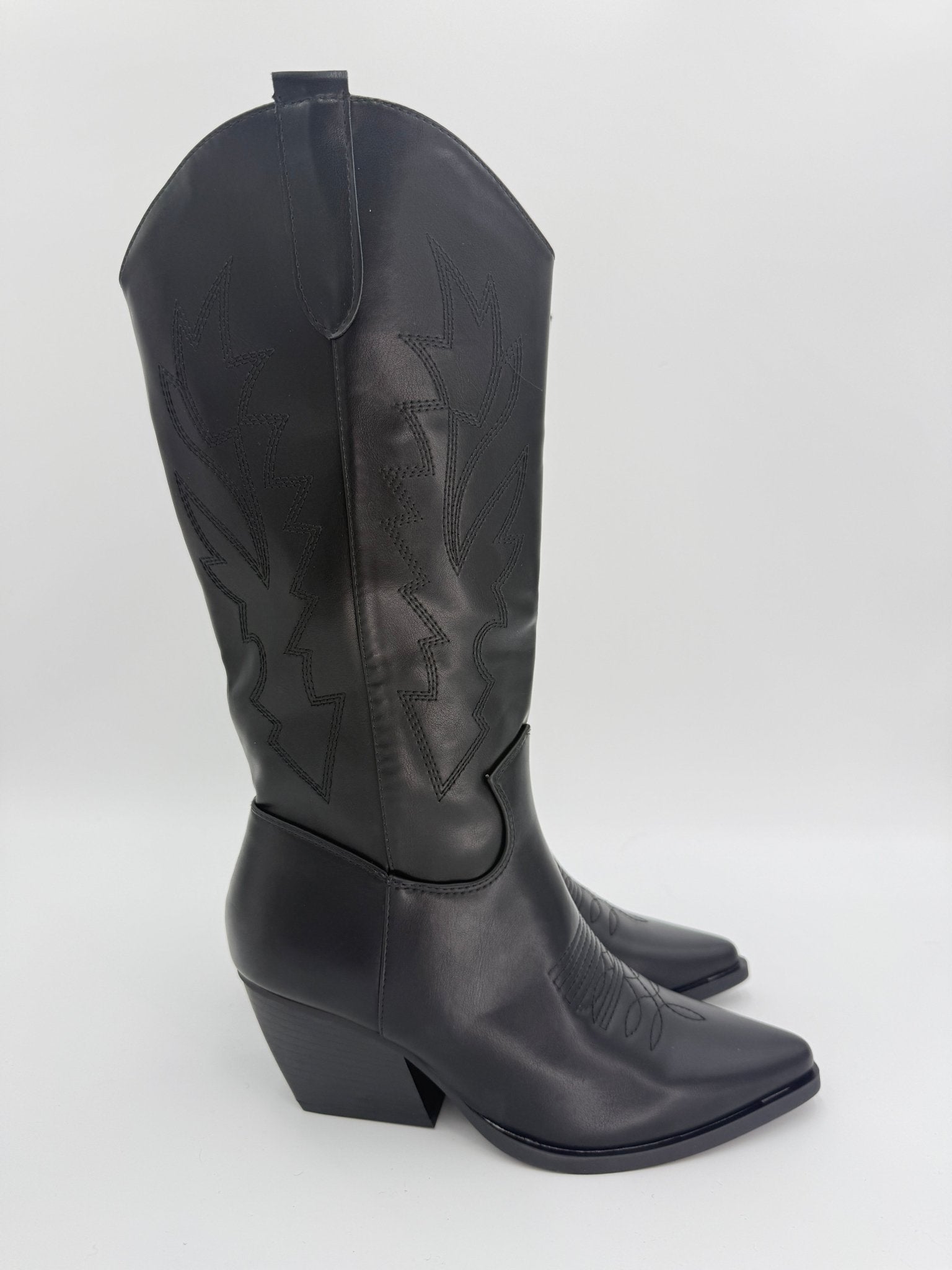 Step into festival season with these striking black faux leather cowgirl boots. Featuring a distinctive 3/4 zip closure for easy on-and-off wear, they're finished with intricate embroidery detailing that adds character and edge. The pointed toe silhouette delivers classic Western style, while the convenient pull tab ensures effortless dressing. Perfect for music festivals, nights out, or making a bold fashion statement, these boots combine practicality with standout design.