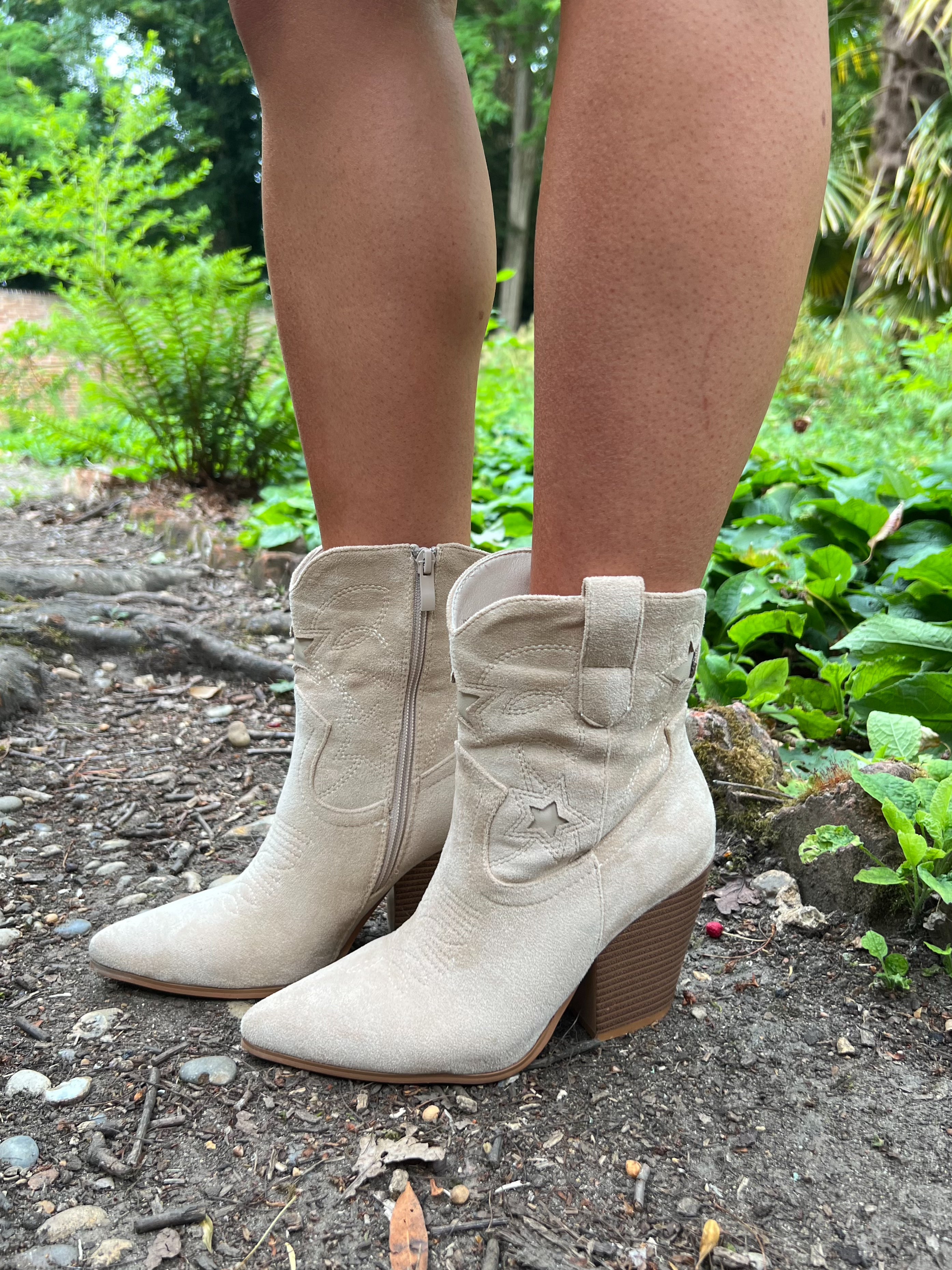 Beige Faux Suede Star Detail Ankle Cowboy Boots
