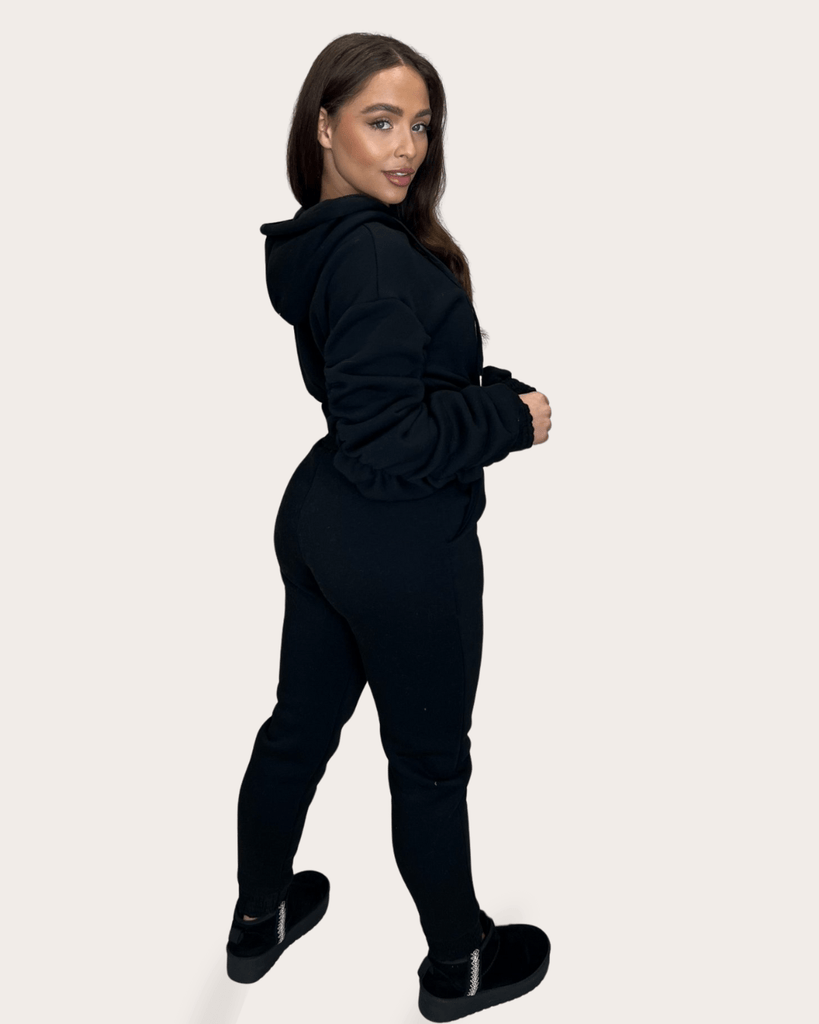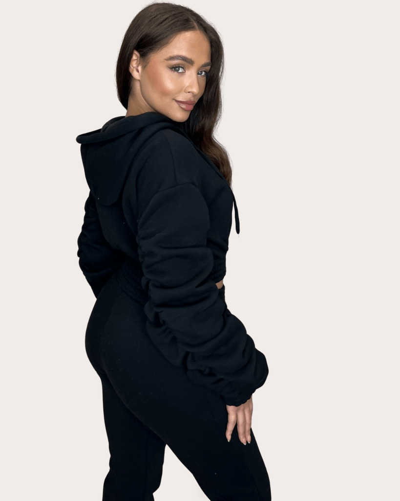 Expertly designed for comfort and style, this tracksuit features a hooded, cropped jacket with a zip fastening and drawstrings. The ruched sleeves and cuffed details add a touch of sophistication, while the jogger trousers boast an elasticated waist and cuffed ankles for a flattering fit. Perfect for any leisure activity.