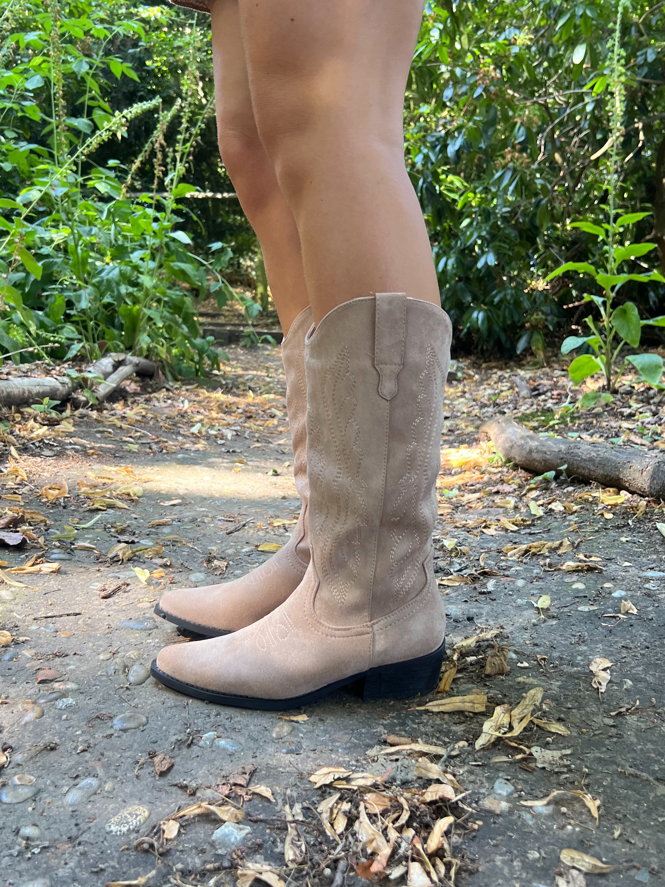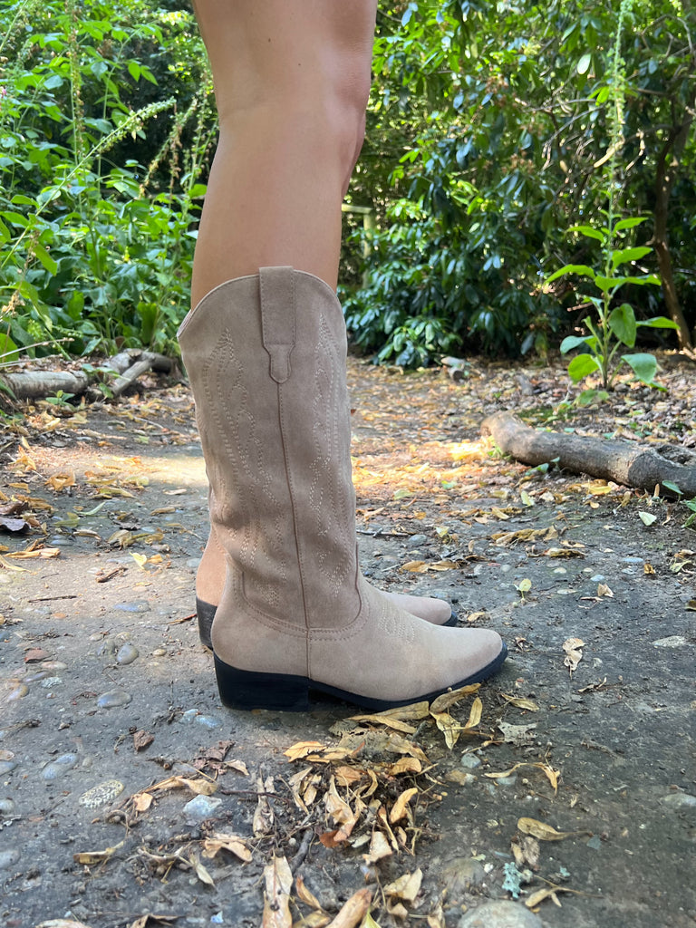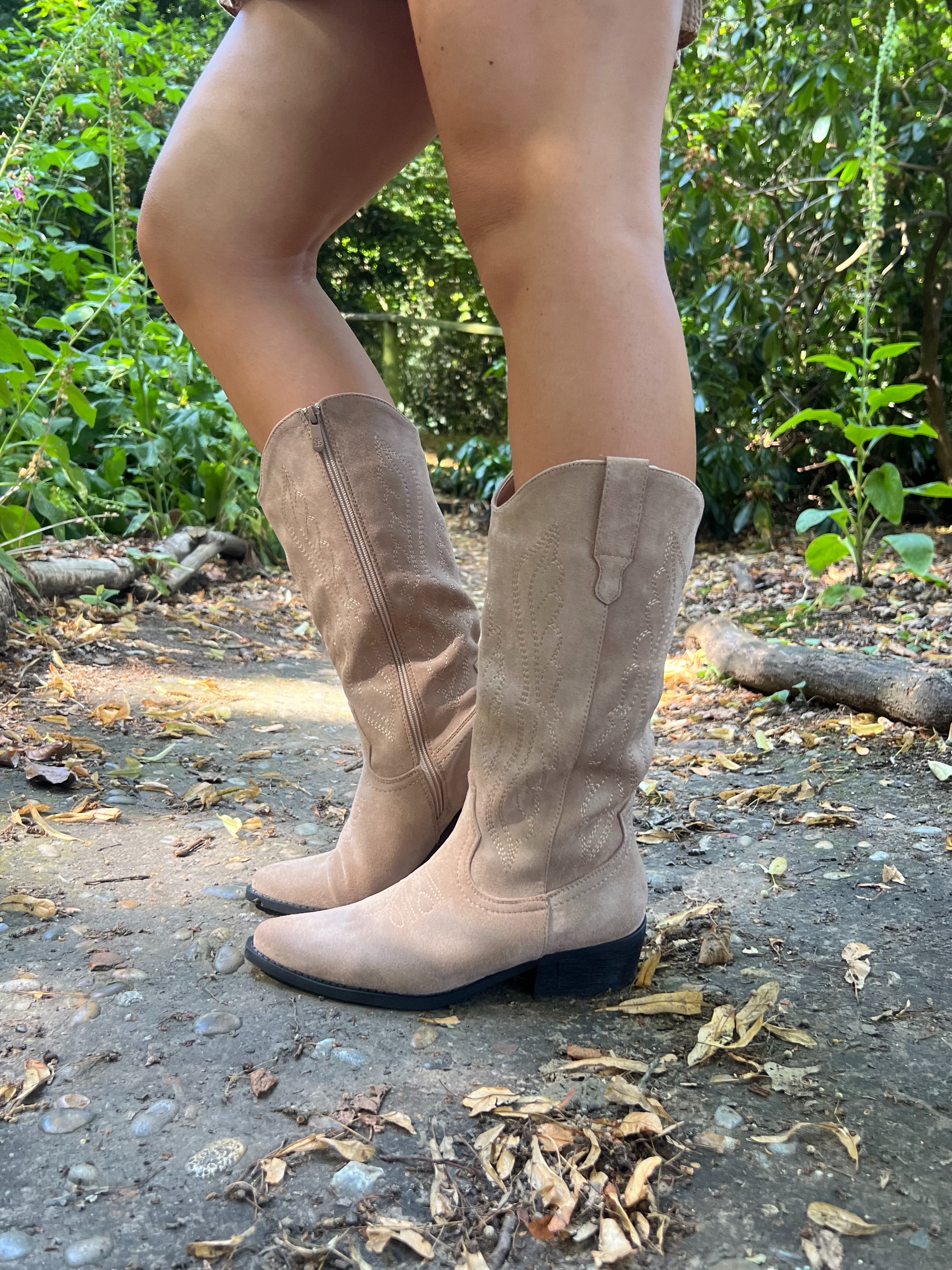 Dark Beige Calf Length Suede Effect Cowboy Boots