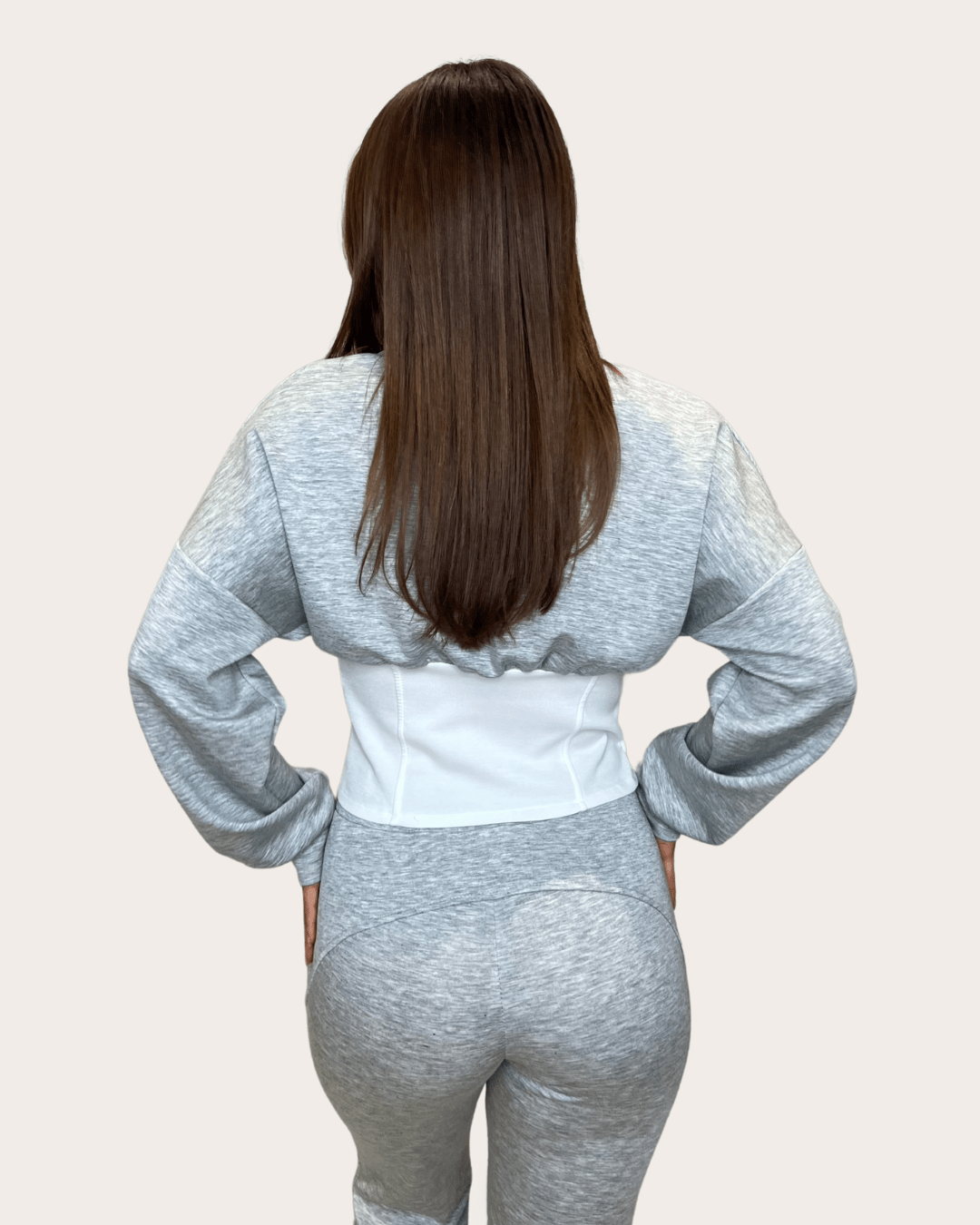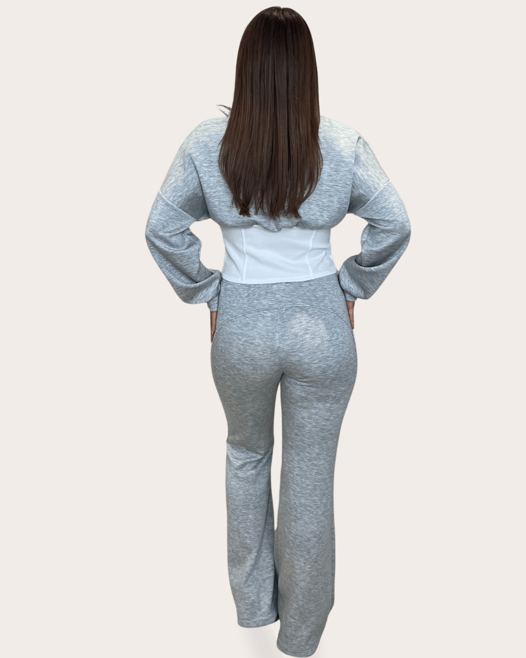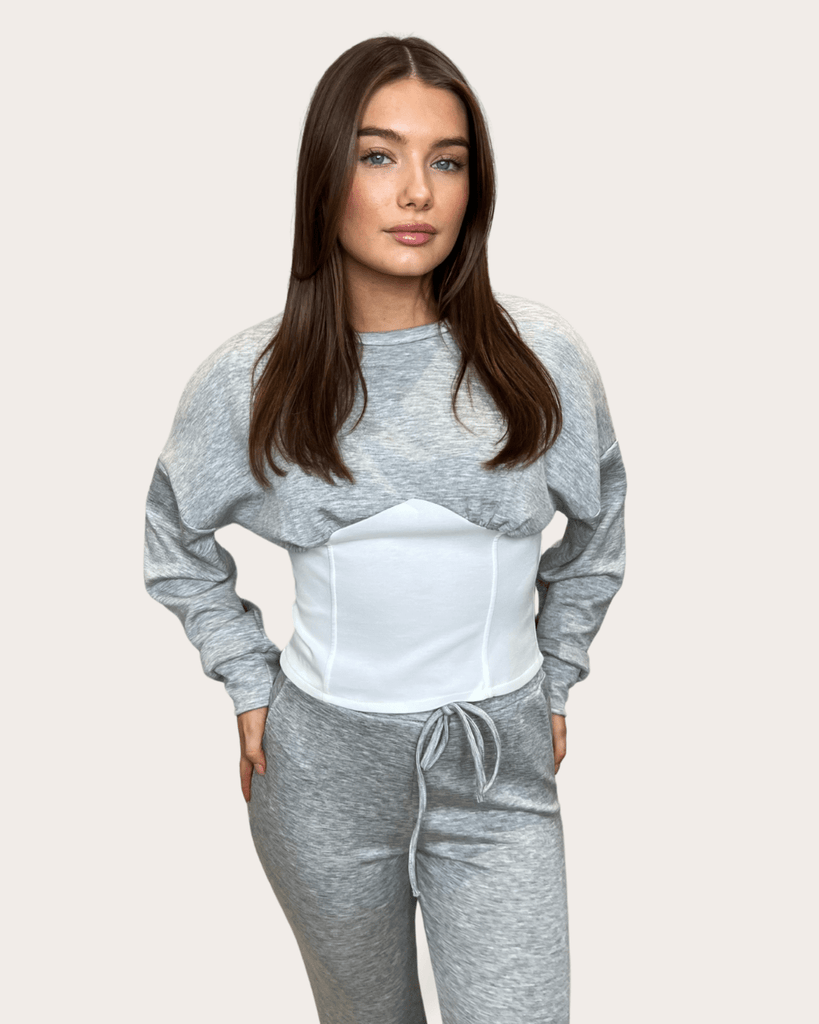 This baby blue top and trousers set features a white contrast panel and a round neck for a stylish look. The cuffed wrist and long-sleeved design provide comfort and warmth. The drawstring and elasticated waist ensure a perfect fit, while the wide leg adds a trendy touch. Perfect for any occasion.