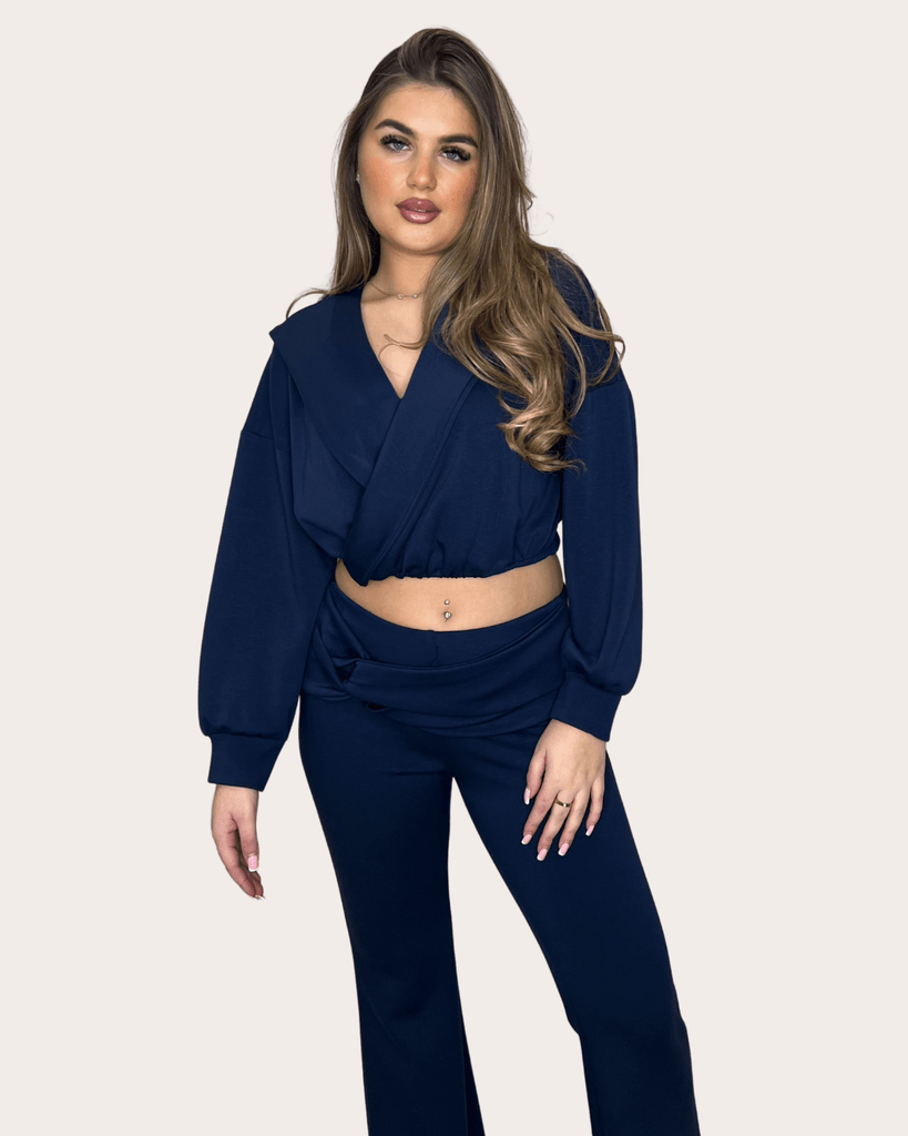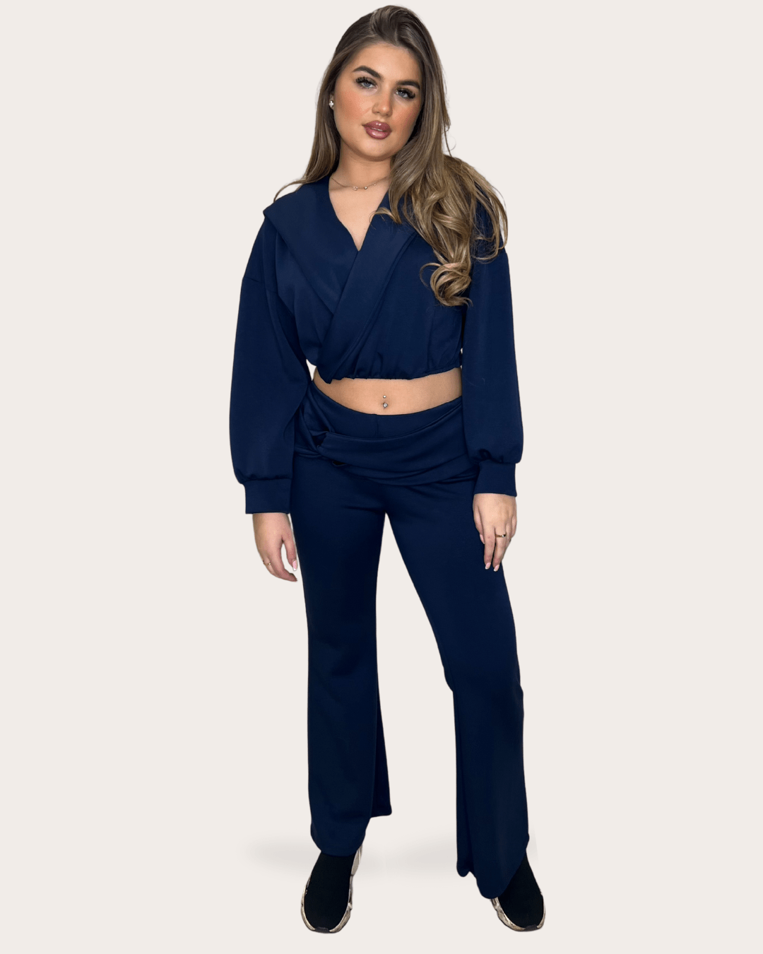Navy Draped Hooded Cropped Top With Ruched Waistband Wide Leg Trousers
