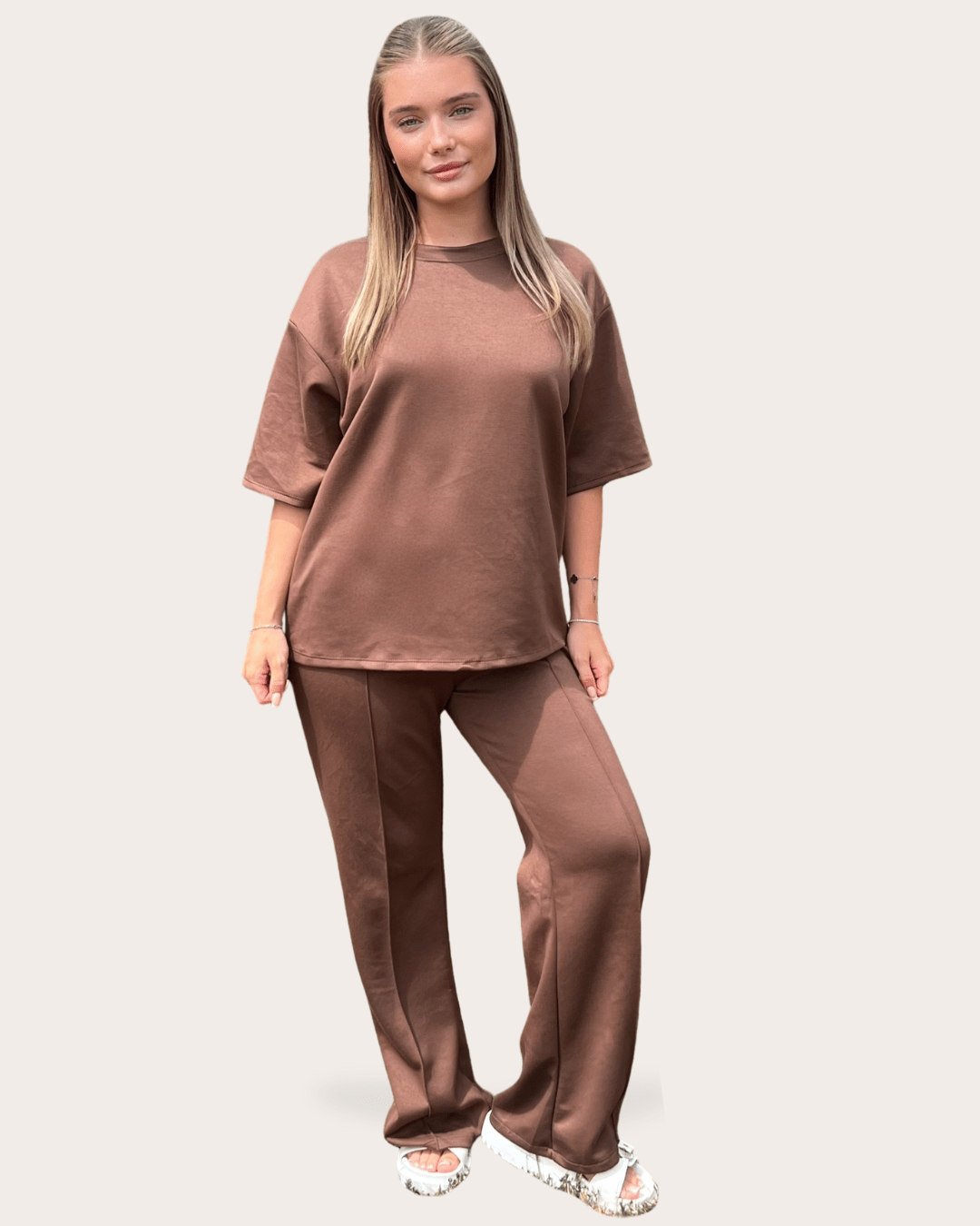 Expertly crafted for both style and comfort, our Short Sleeve Wide Leg Co-Ord is the perfect addition to your wardrobe. Featuring a round neck and short sleeves, this co-ord set is designed to flatter your silhouette. The wide leg trousers with a front seam and elasticated waist provide a comfortable fit and effortless style for any occasion.