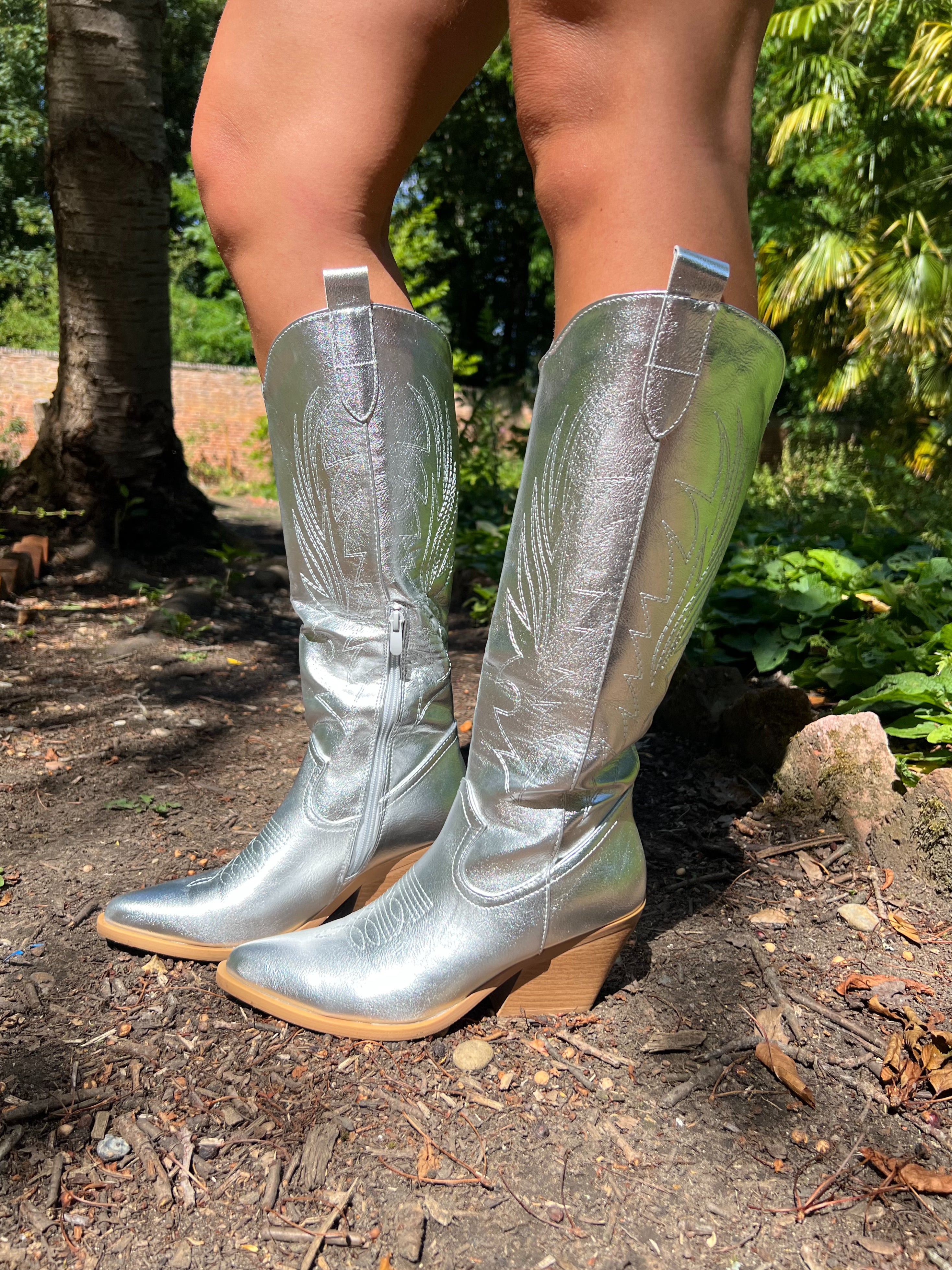 These Metallic Faux Leather Cowboy Boots combine striking metallic sheen with durable faux leather for a bold, stylish look. Featuring a practical 3/4 zip for easy wear and detailed embroidery that adds refined craftsmanship, they offer both comfort and standout design. Perfect for those seeking expert-level style with a touch of Western flair.