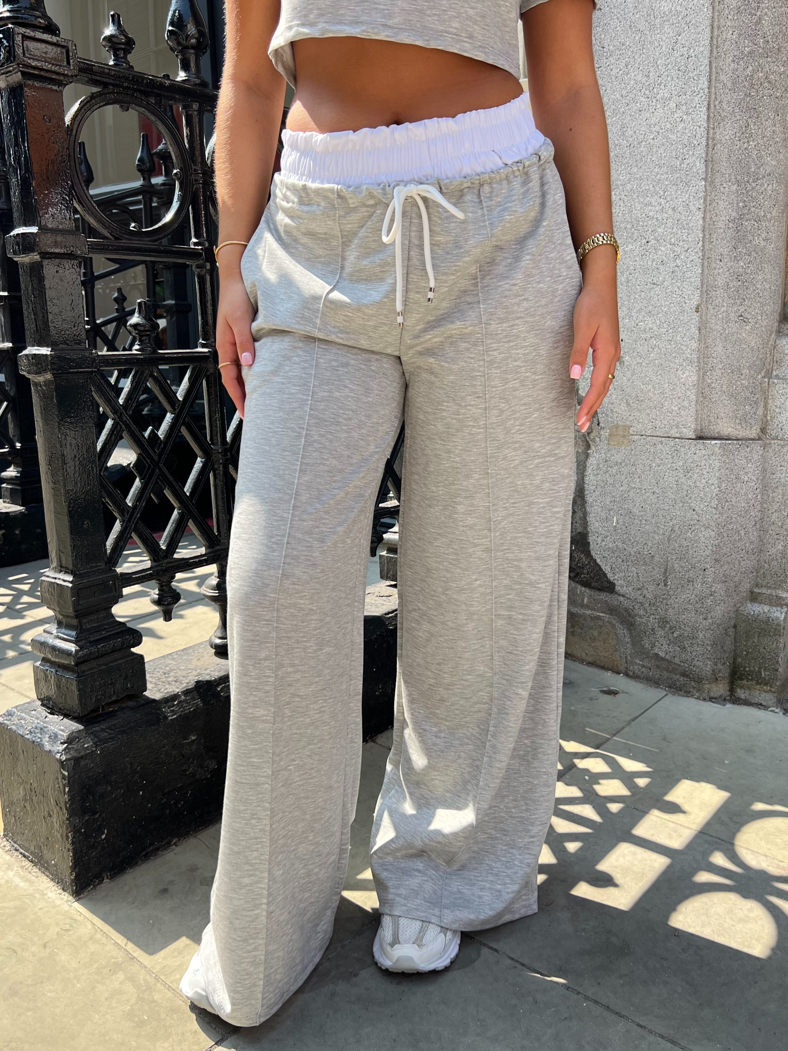 Social Club Grey Cropped Top & Contrast Waist Wide Leg Trouser Co Ord