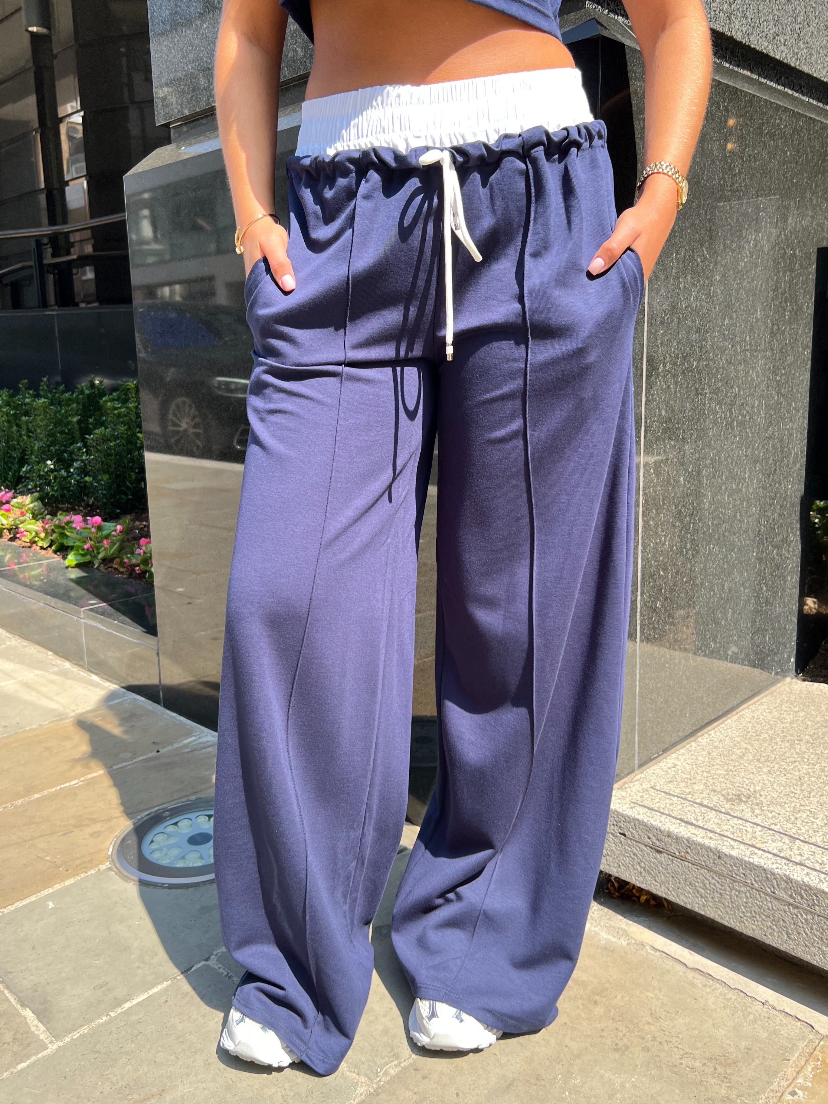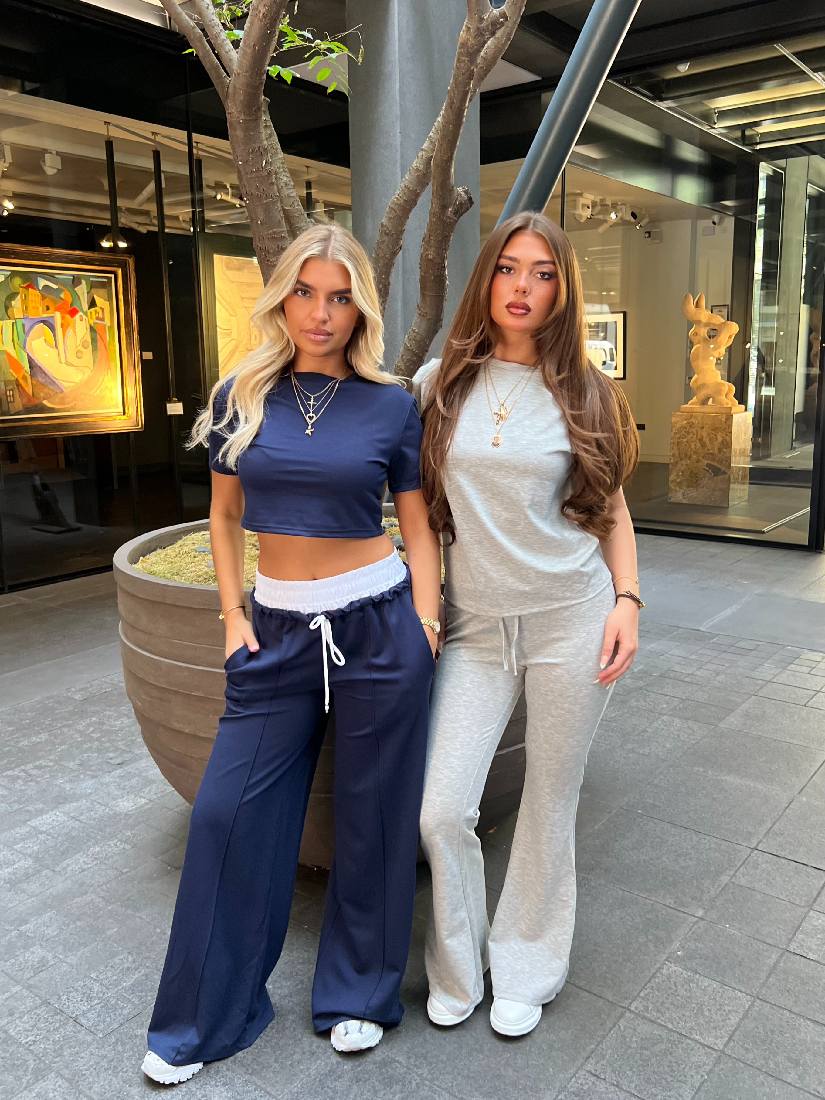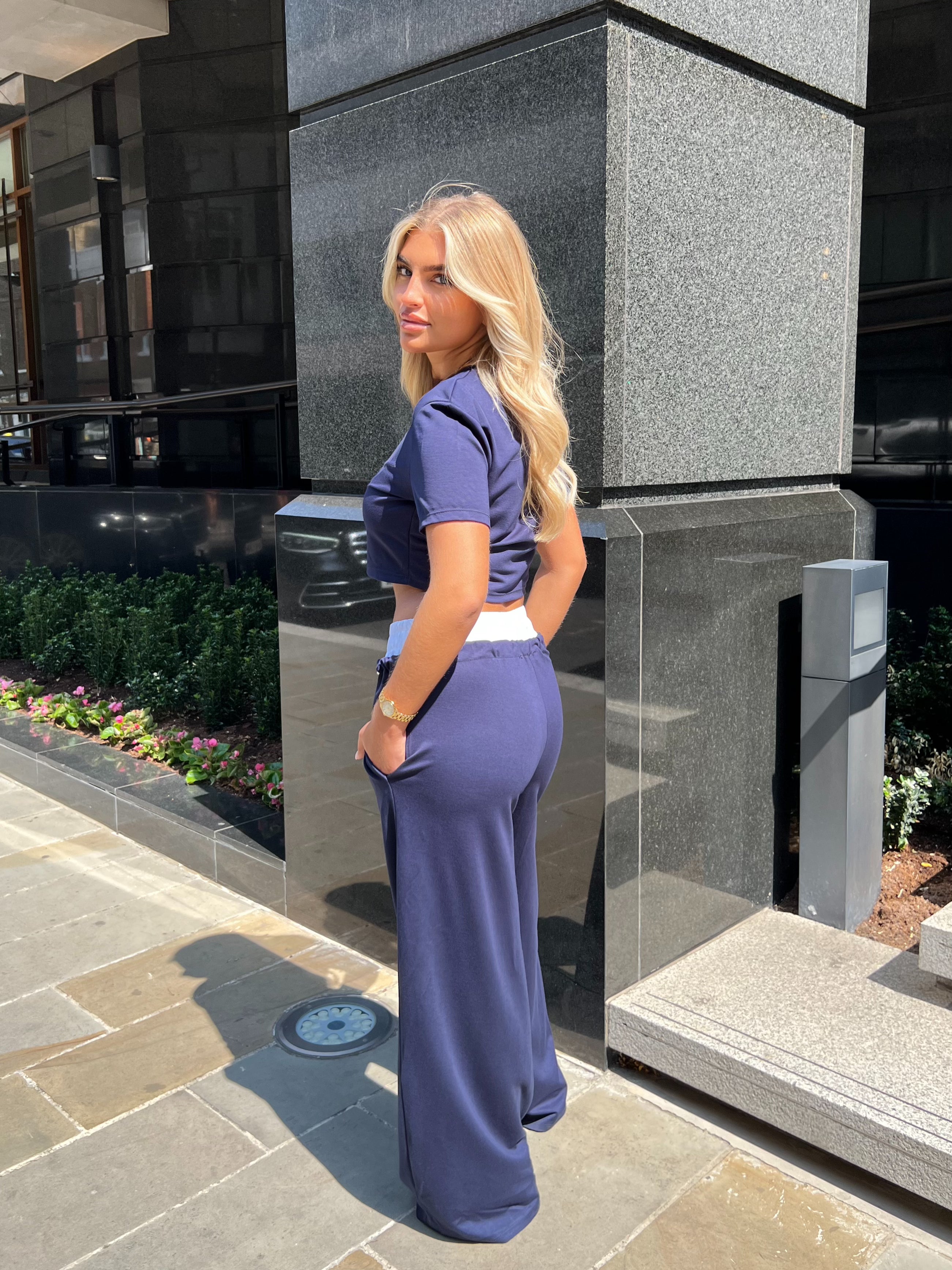 Social Club Navy Cropped Top & Contrast Waist Wide Leg Trouser Co Ord