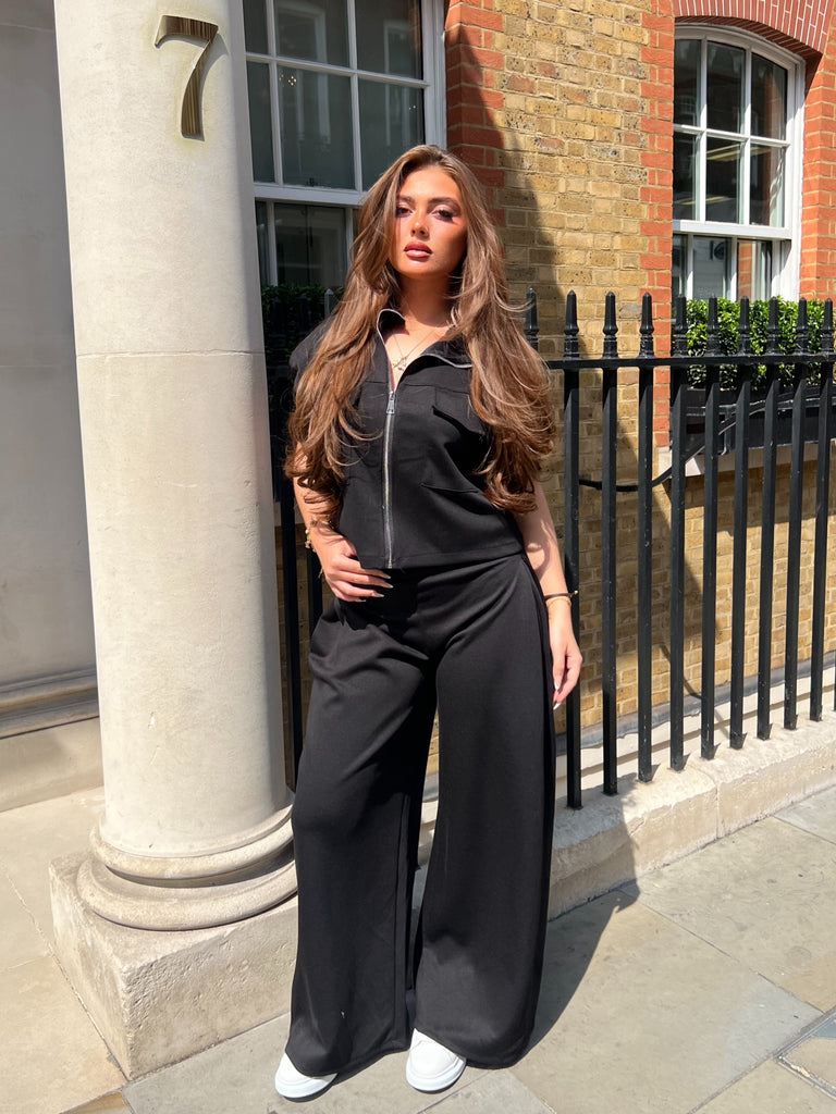 Social Club Black Zip Short Sleeve Jacket & Wide Leg Trouser Co Ord