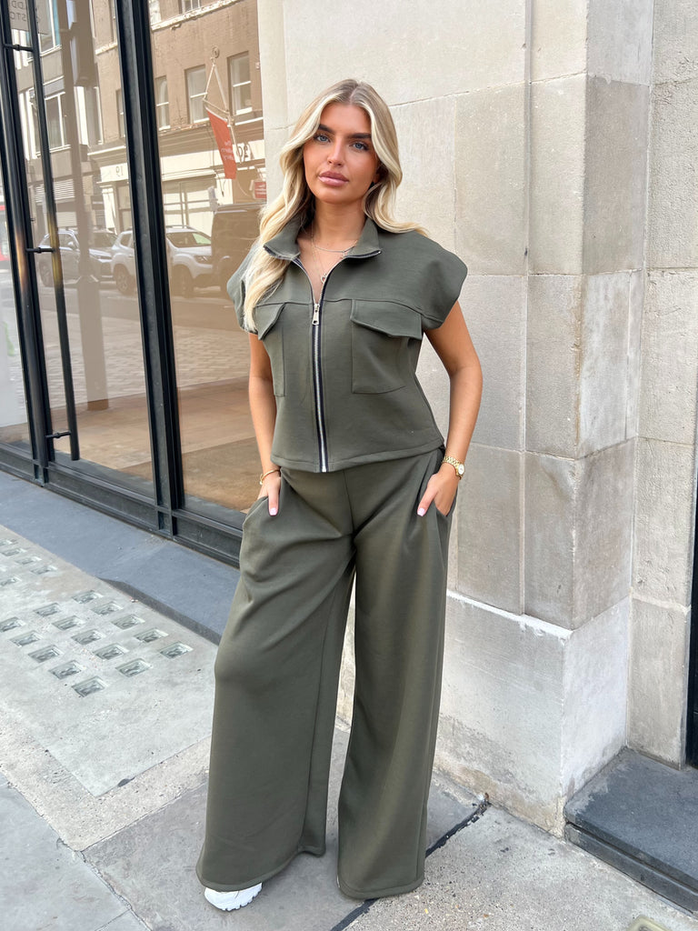 Social Club Khaki Shoulder Pad Top & Boot Cut Trouser Co Ord