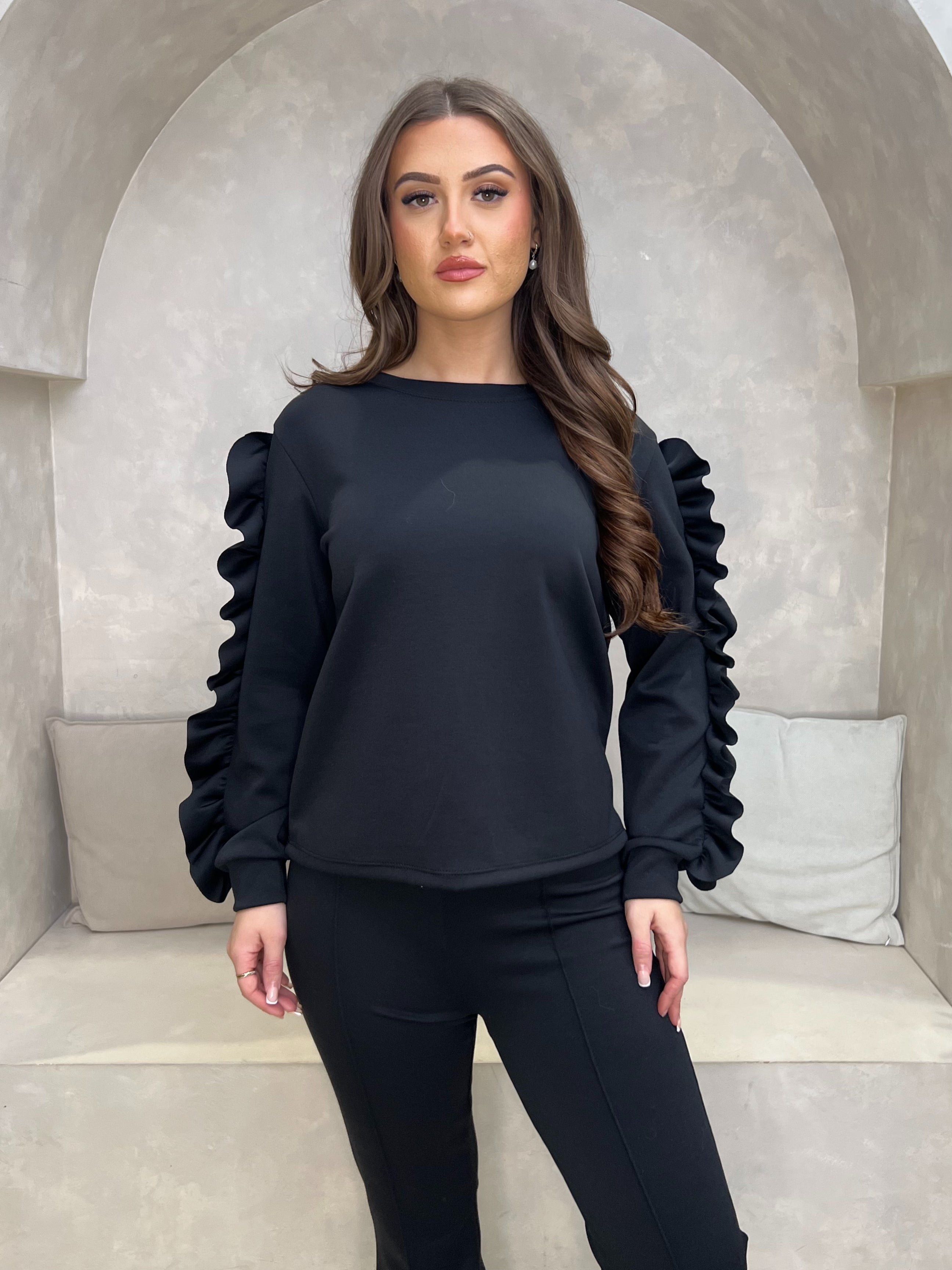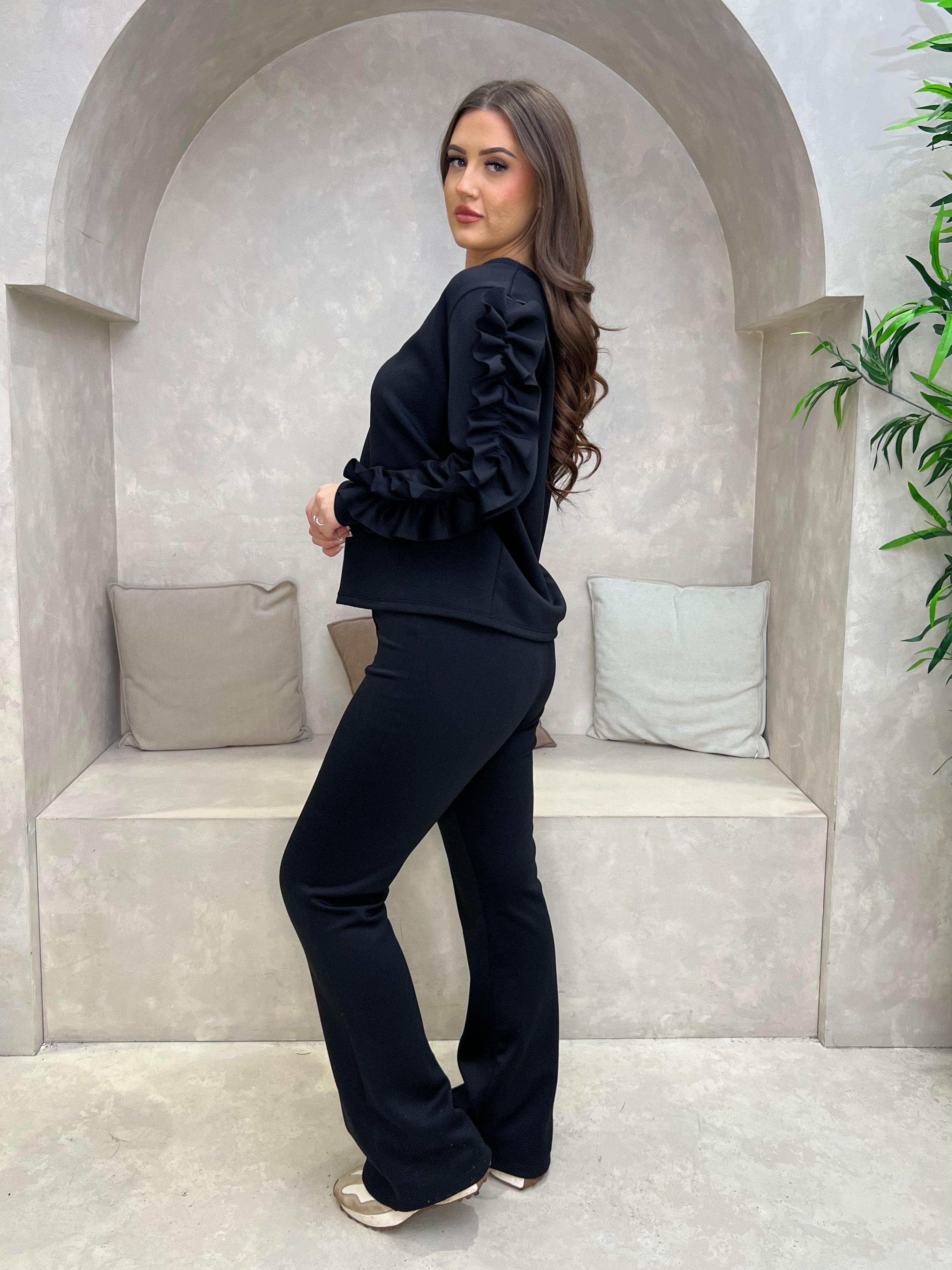 Introducing our Ruffle Sleeve Wide Leg Tracksuit, perfect for the stylish and active individual. With its round neck and ruffle sleeves, this tracksuit offers both comfort and elegance. The long and cuffed sleeves provide warmth, while the wide leg and elasticated waist ensure optimal movement. Stay on trend and comfortable with this must-have tracksuit.