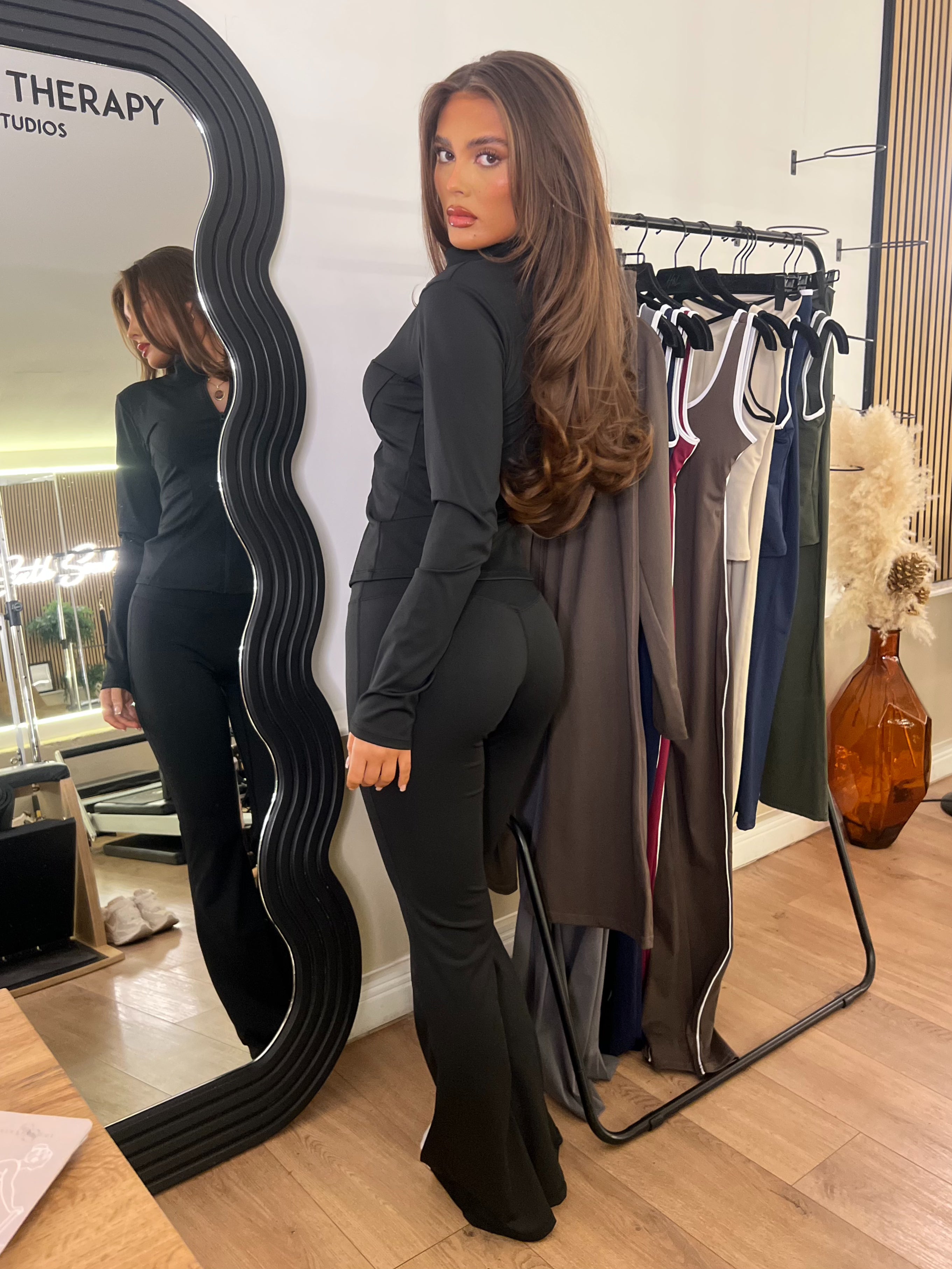 Zip Jacket & Wide Leg Trouser Gym Set This contemporary two-piece ensemble combines functional design with modern silhouettes. The zip-up jacket features refined seamed detailing for a structured fit, whilst the high-waisted wide-leg trousers deliver a flattering, elongated line. Ideal for gym sessions or casual wear, the pairing offers versatility across your activewear rotation. The bootcut trouser leg provides a polished finish that transitions seamlessly from studio to street.